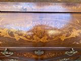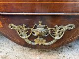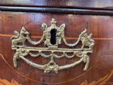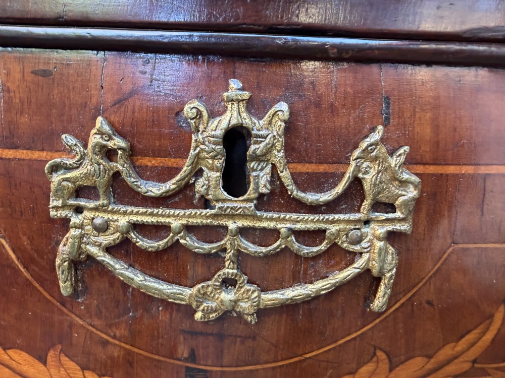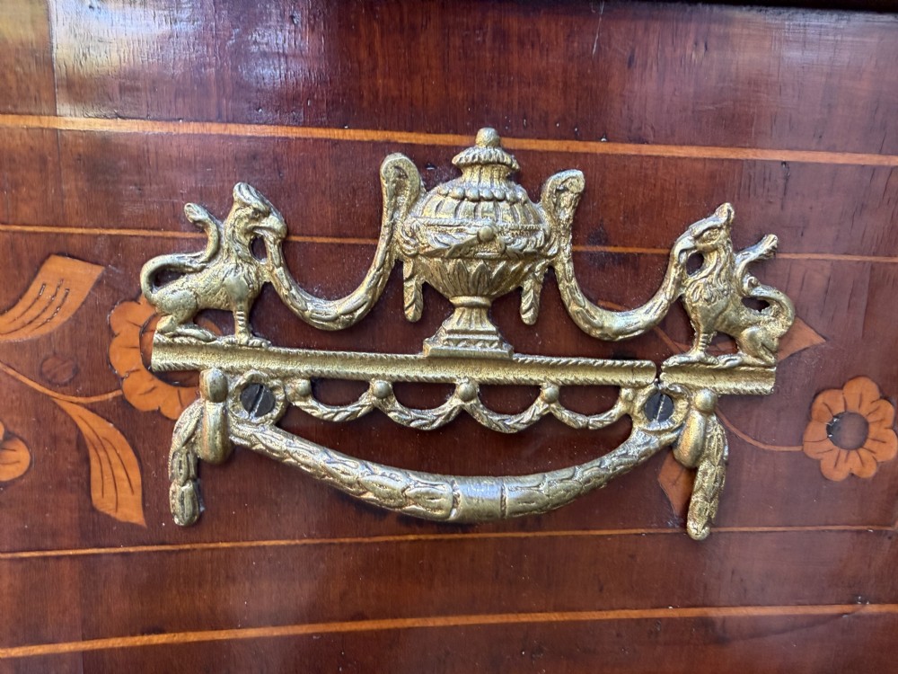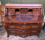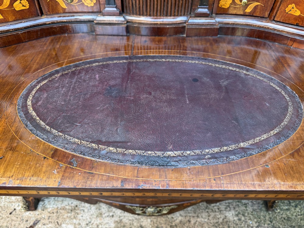 Fitted with a shaped interior with an arrangement of drawers ,a tambour centre door , secret and concealed drawers , and pigeon-holes all with corresponding floral marquetry inlay . The pull-out writing surface with it’s original oval gilt-tooled Moroccan leather-inset writing panel, above a 3-drawer , oak-lined , bombe shaped base . Neo-classical design gilded handles, escutcheons and mounts ,with sabots to the feet.