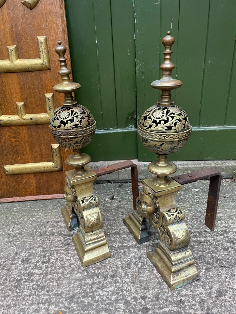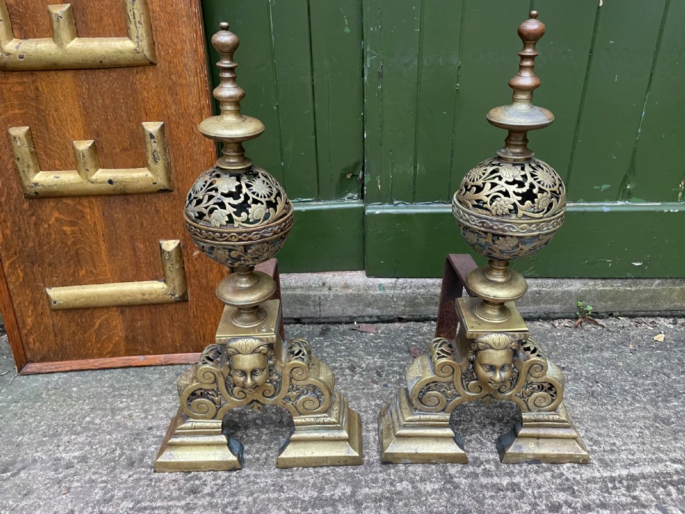 Impressively-scaled pair of cast brass C17th style andirons with cherubic masks to the front , the spherical pierced and cast bodies with floral detail , topped with turned finials . Raised on shaped trestle type feet .