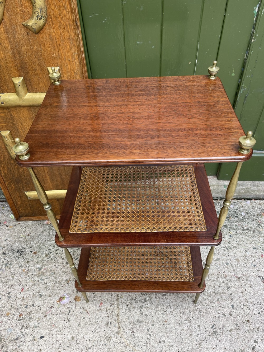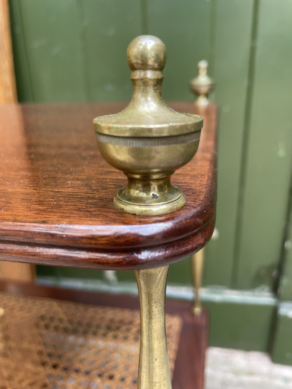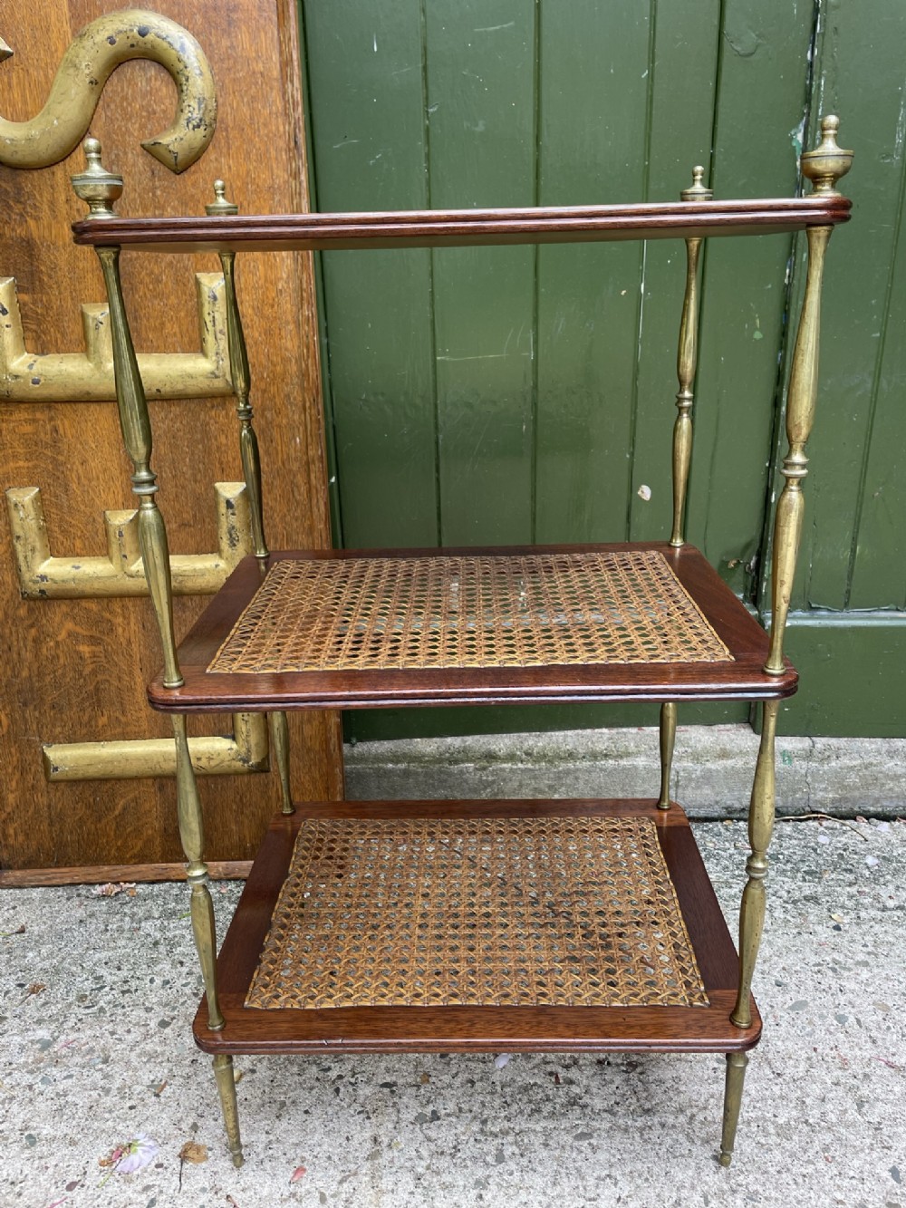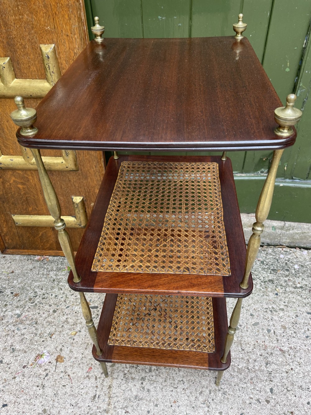 Smart rectangular mahogany etagere with two tiers of bergere cane panels within mahogany frames , below a solid mahogany top tier . Finely-turned elegant brass uprights surmounted with classical-style urn finials . The tiers all having a reeded edge .