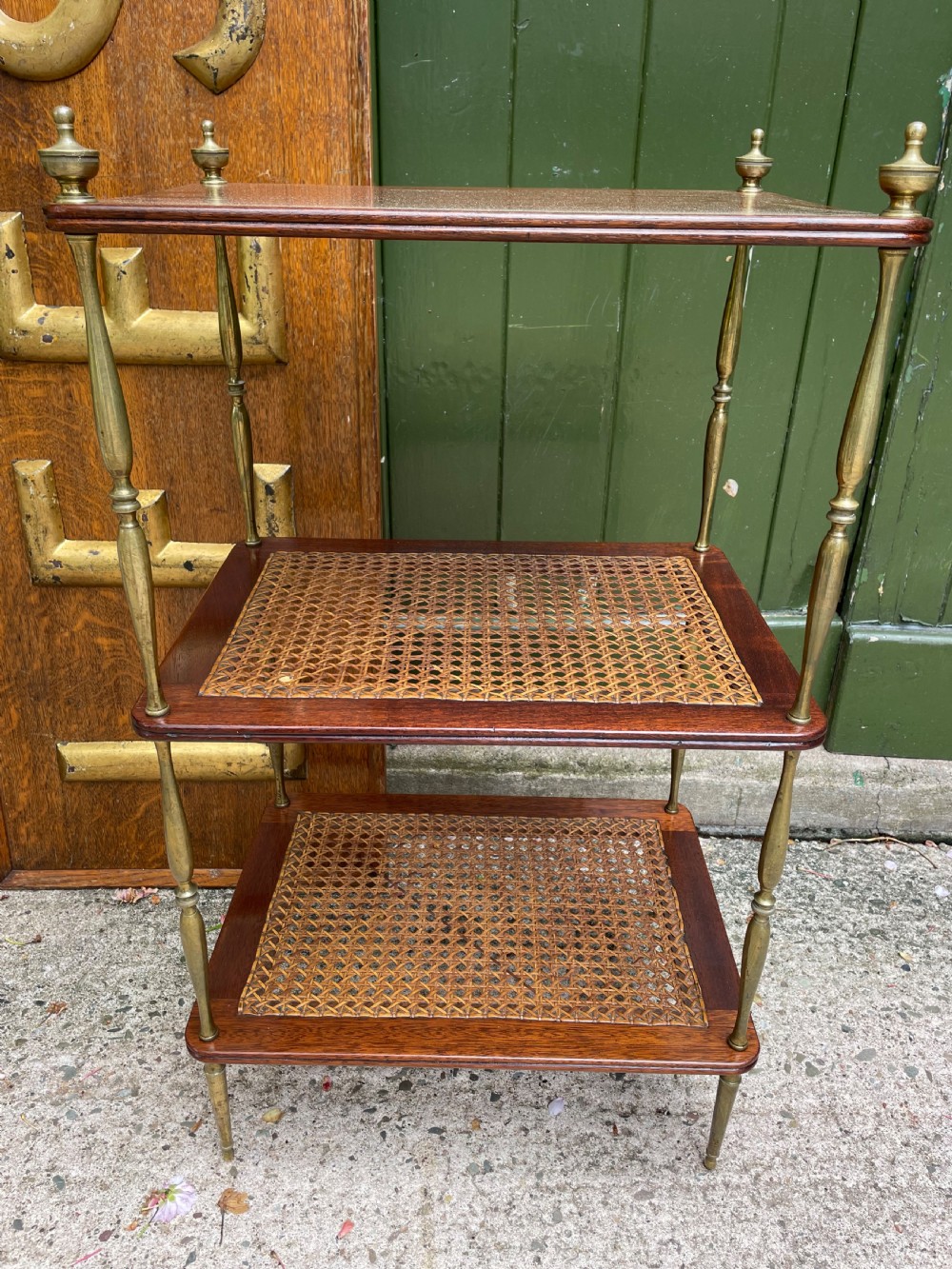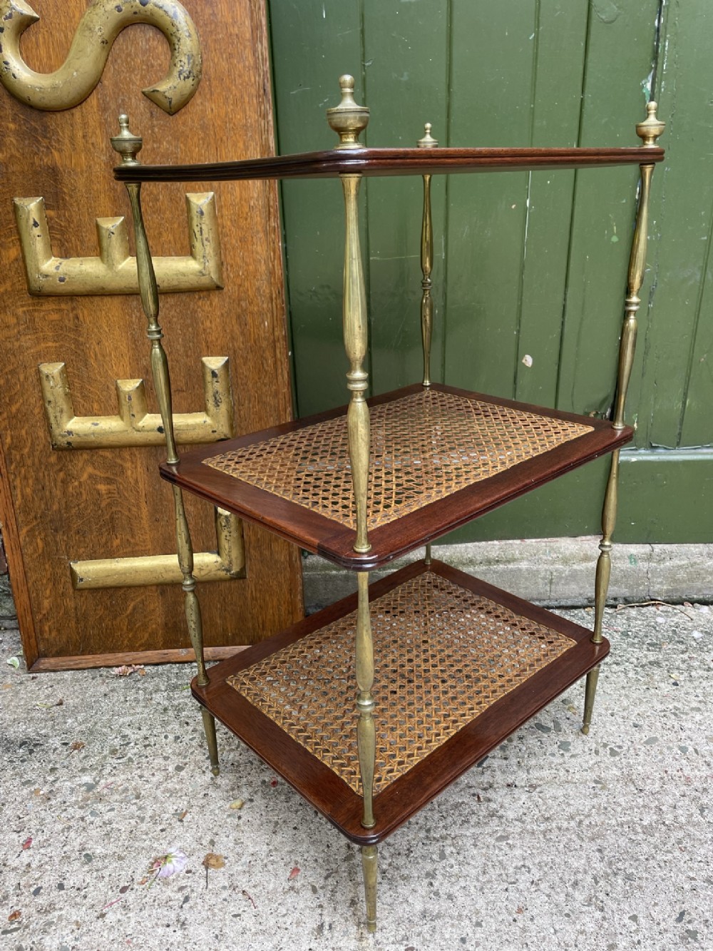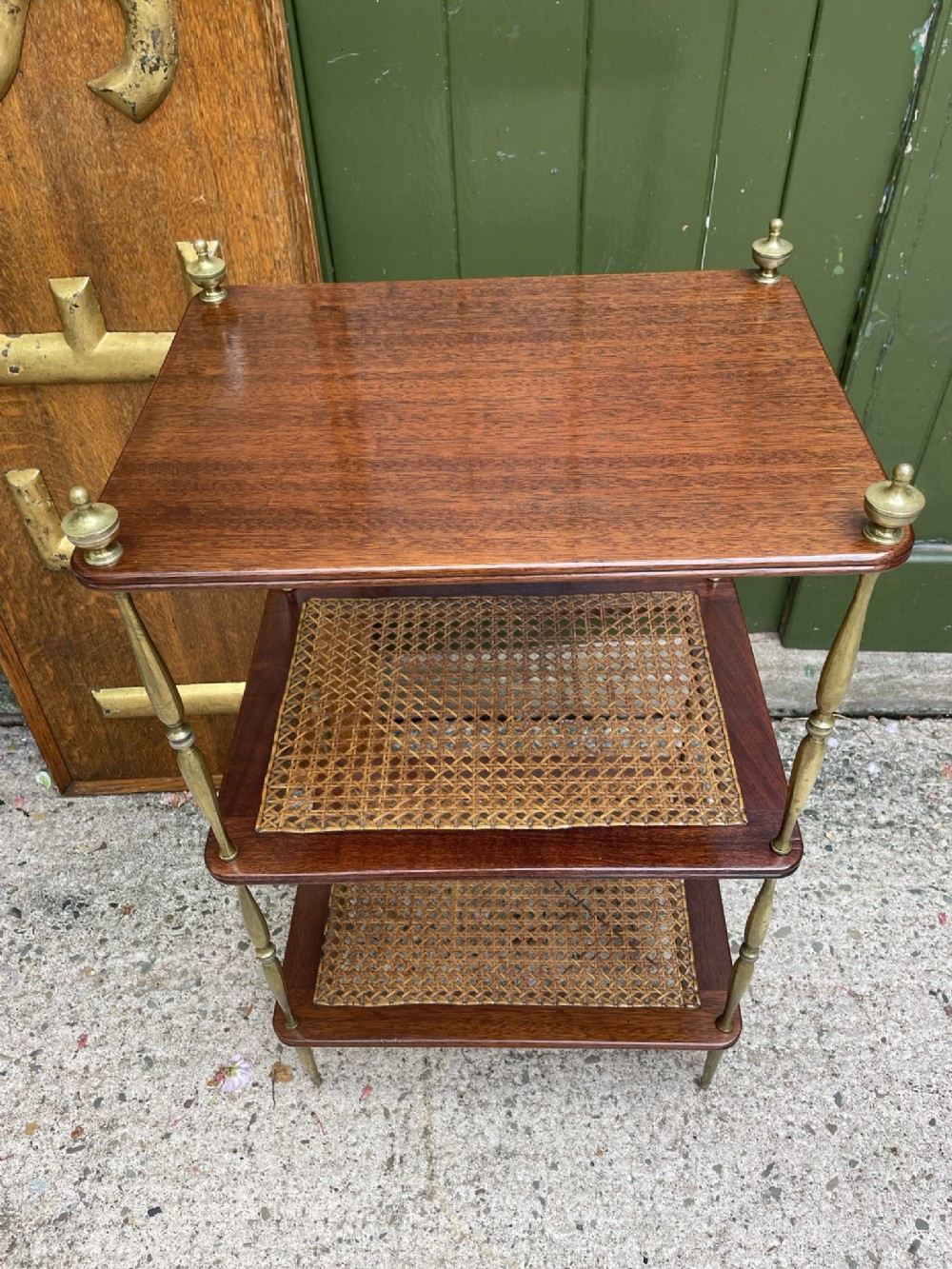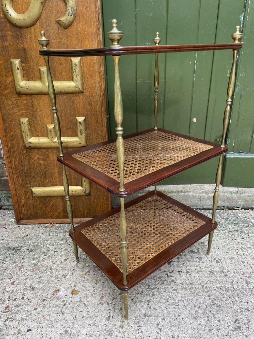 Smart rectangular mahogany etagere with two tiers of bergere cane panels within mahogany frames , below a solid mahogany top tier . Finely-turned elegant brass uprights surmounted with classical-style urn finials . The tiers all having a reeded edge .