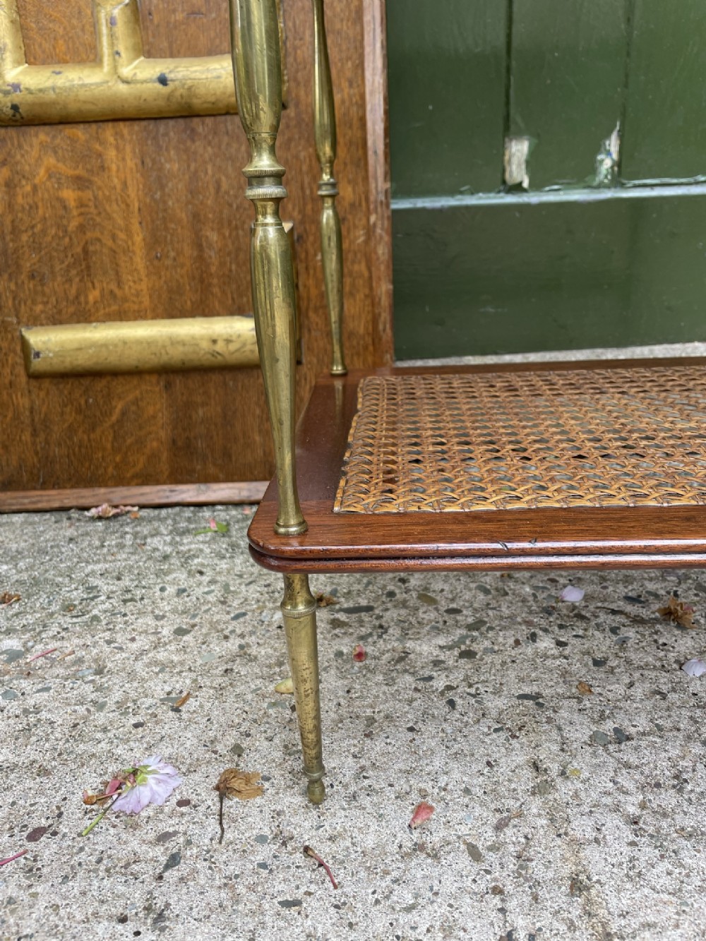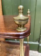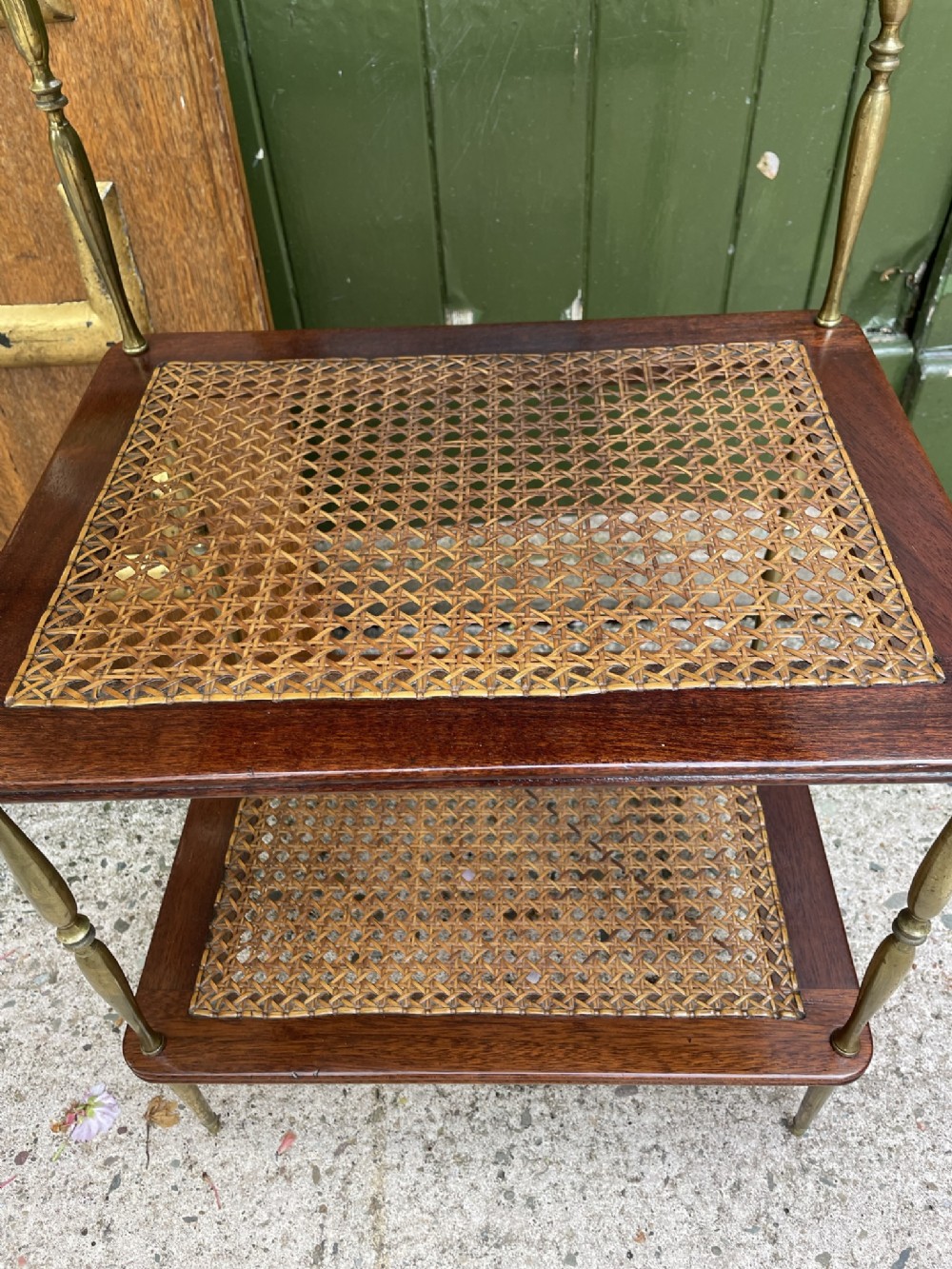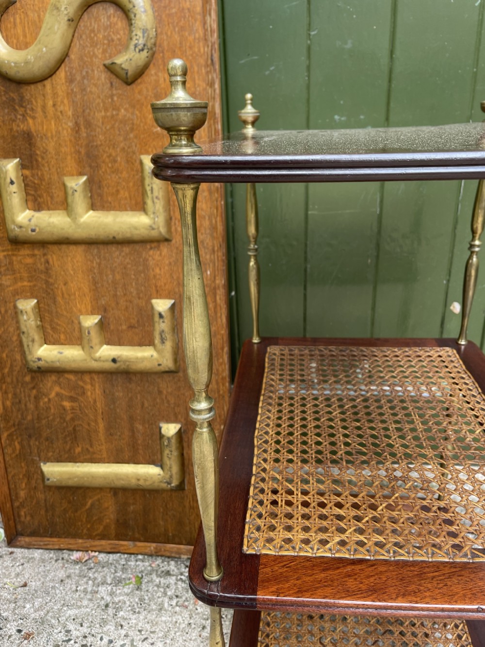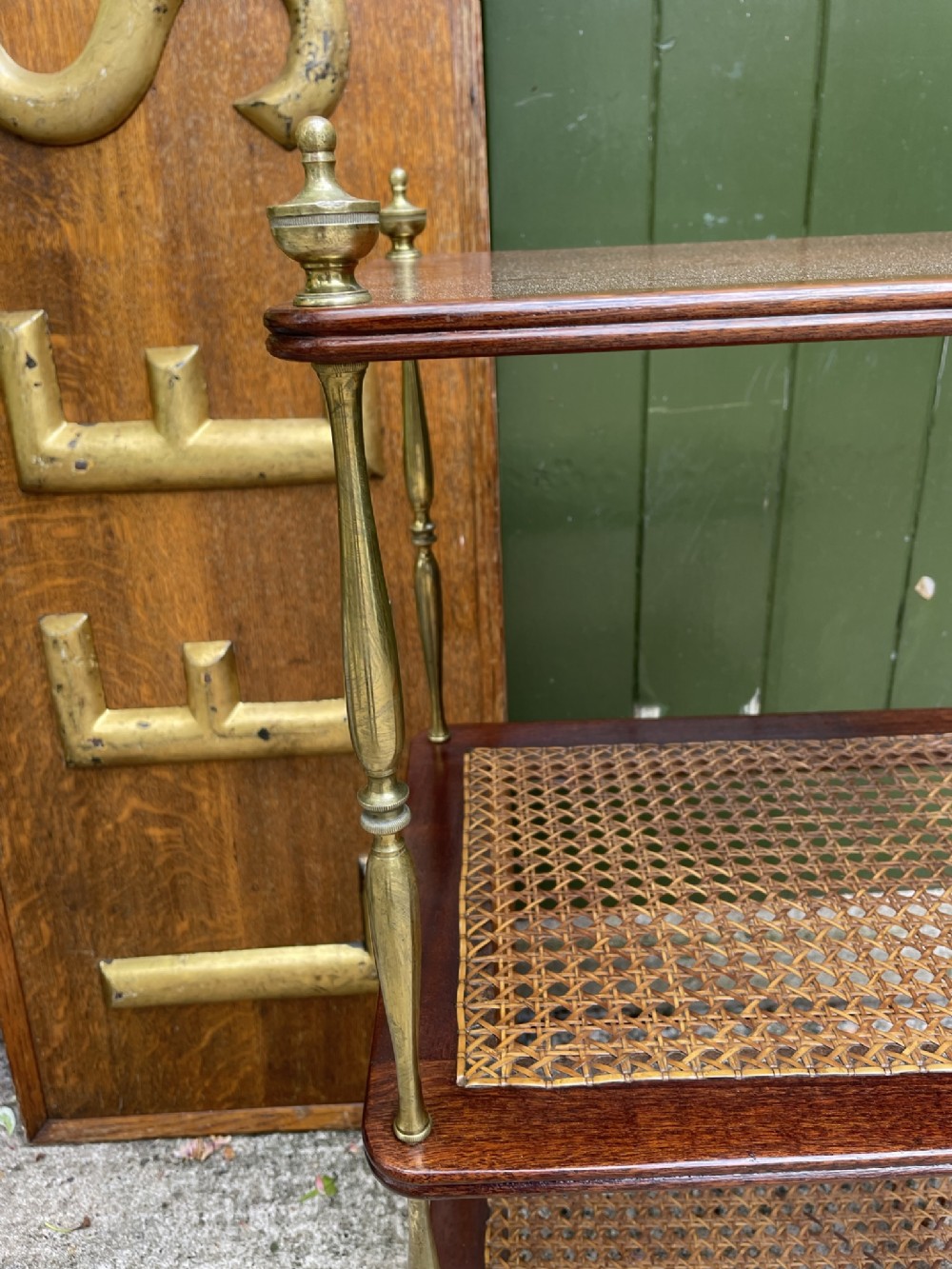Smart rectangular mahogany etagere with two tiers of bergere cane panels within mahogany frames , below a solid mahogany top tier . Finely-turned elegant brass uprights surmounted with classical-style urn finials . The tiers all having a reeded edge .