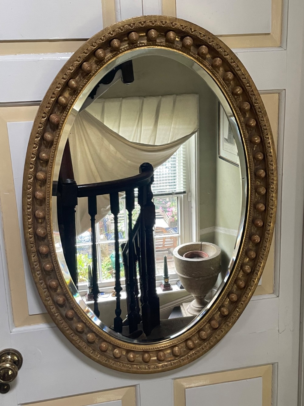 Elegant late C19th Regency revival-style gilt-wood framed oval mirror.