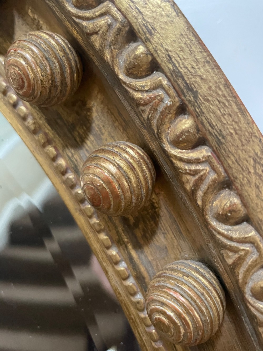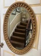 High quality carved gilt-wood frame with bevelled oval mirror plate . The cavetto profile frame with a carved ovolo or ‘egg-and-dart’ edge , and having multiple closely-spaced reeded spherical balls within the cavetto , and a further carved beaded rim to inner edge .