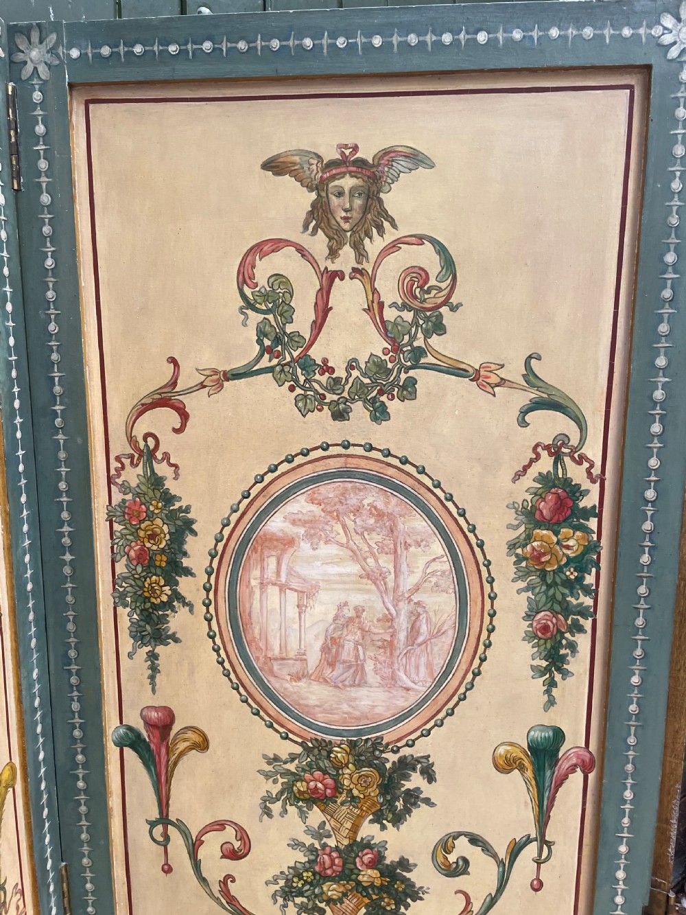 Painted to both sides with neo-classical motifs ,featuring winged female masks , garlands and baskets of flowers and musical instruments . One side featuring oval panels of classical Italianate landscape studies executed ‘en grisaille’ .