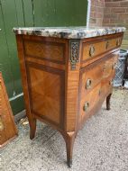 Late C19th French walnut , satinwood , rosewood, tulipwood , amaranth and kingwood marble-topped commode of Louis XV period transitional design .