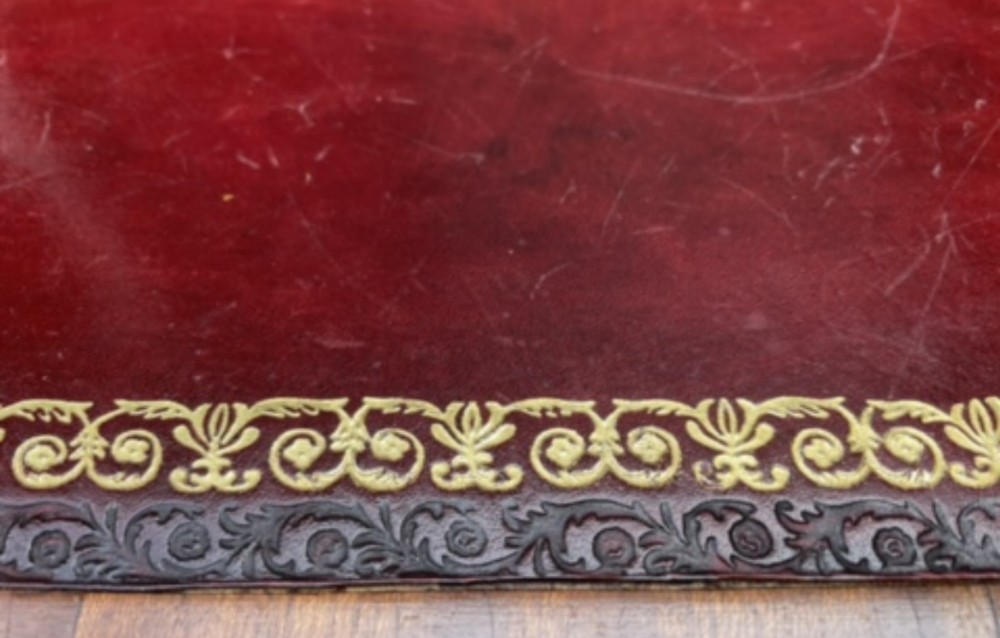 A good quality nine-drawer mahogany pedestal desk fitted with a high quality replacement scarlet-red leather writing surface with both ‘blind’ and gilt-tooled border .