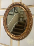 The carved and gilded oval frame with flower-head and leaf details , and having carved split-bead detail to outer and inner edges. .