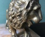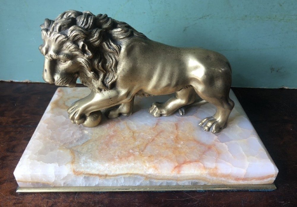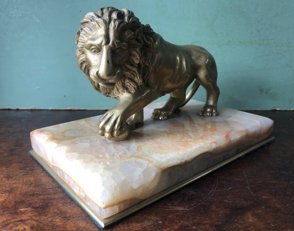 C19th gilt bronze ‘Grand Tour’ souvenir desk ornament or ‘presse-papiers’ of the “Medici Lion” on an onyx marble base .