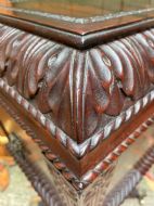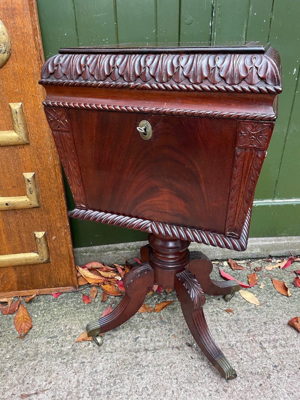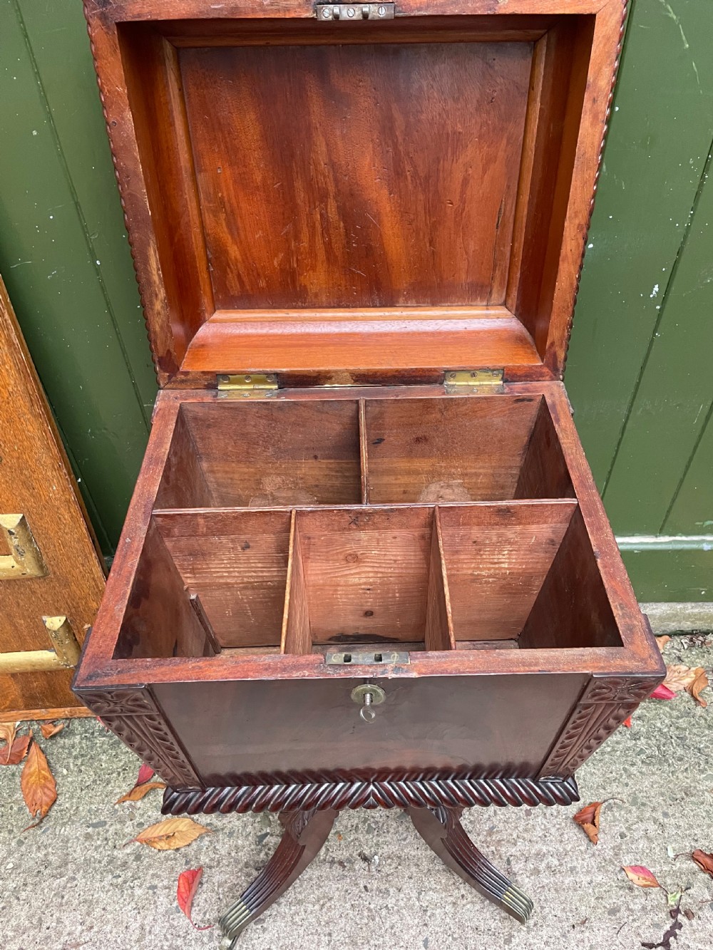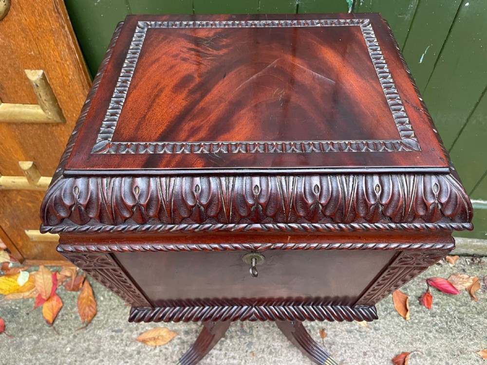 Of tapering sarcophagus form with heavily carved acanthus leaf detail to the lid edge and upright edges together with carved gadrooned and ‘rope-twist’ mouldings . The panelled top hinged lid revealing a divided compartment interior for bottle and decanter storage .