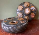 The cameo portrait intaglios having been carved from the resulting lava flow residue caused by the eruptions of the volcanic Mount Vesuvius, the varying colours achieved by the oxidisation and crystallised nature of the cooled minerals.