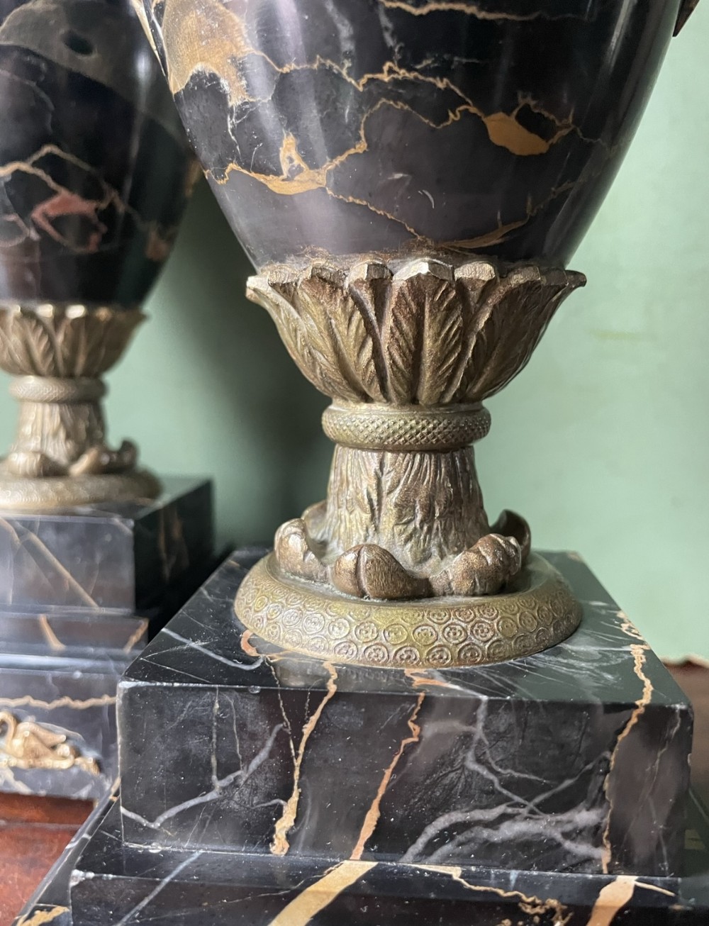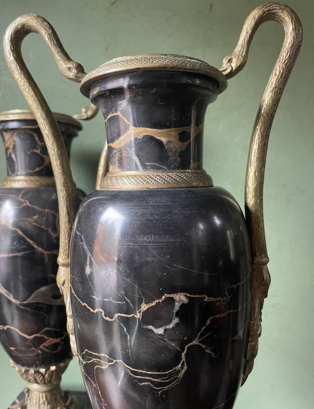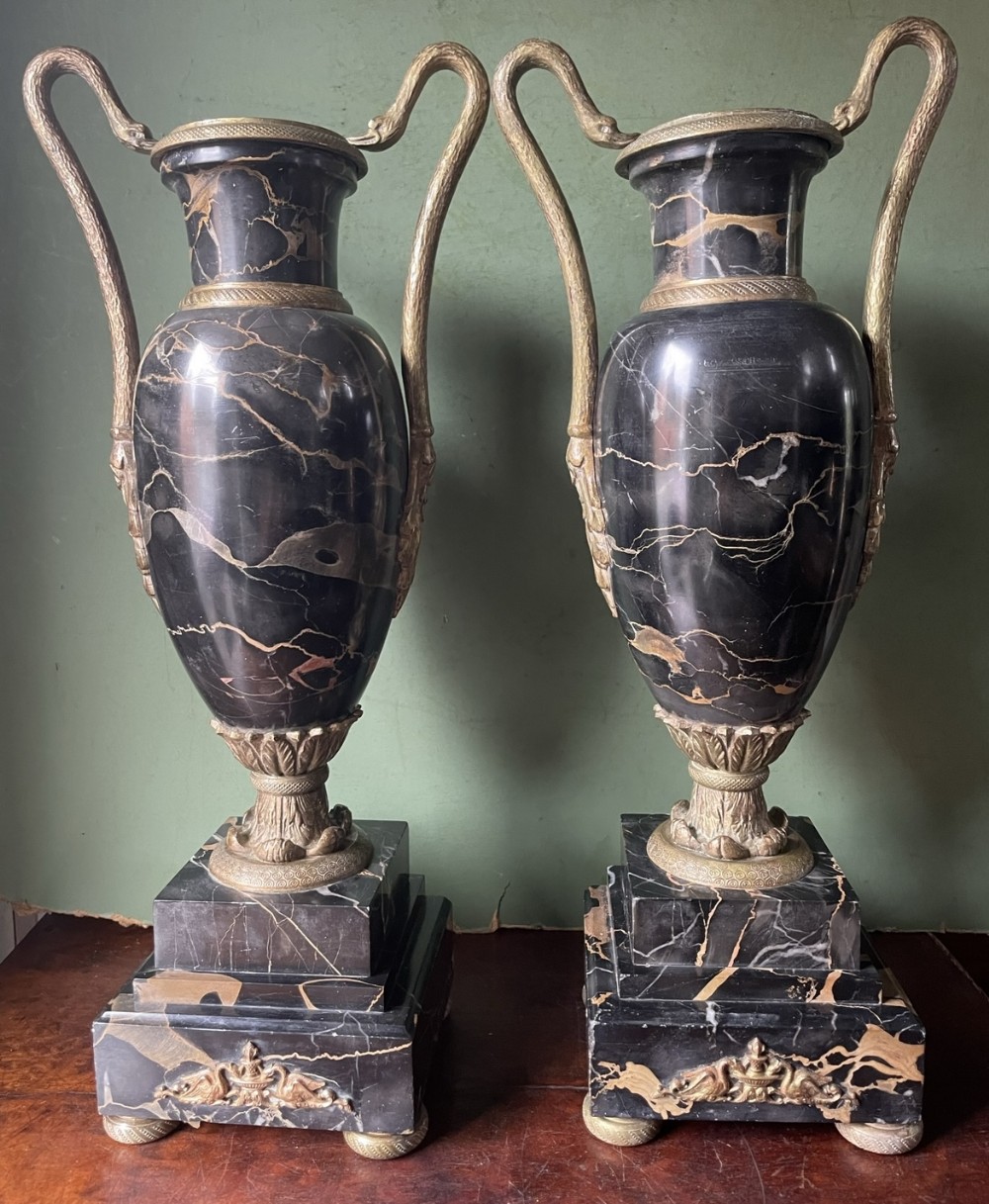 Pair of late C19th French Empire style ormolu mounted ‘nero portoro’ marble vases .
