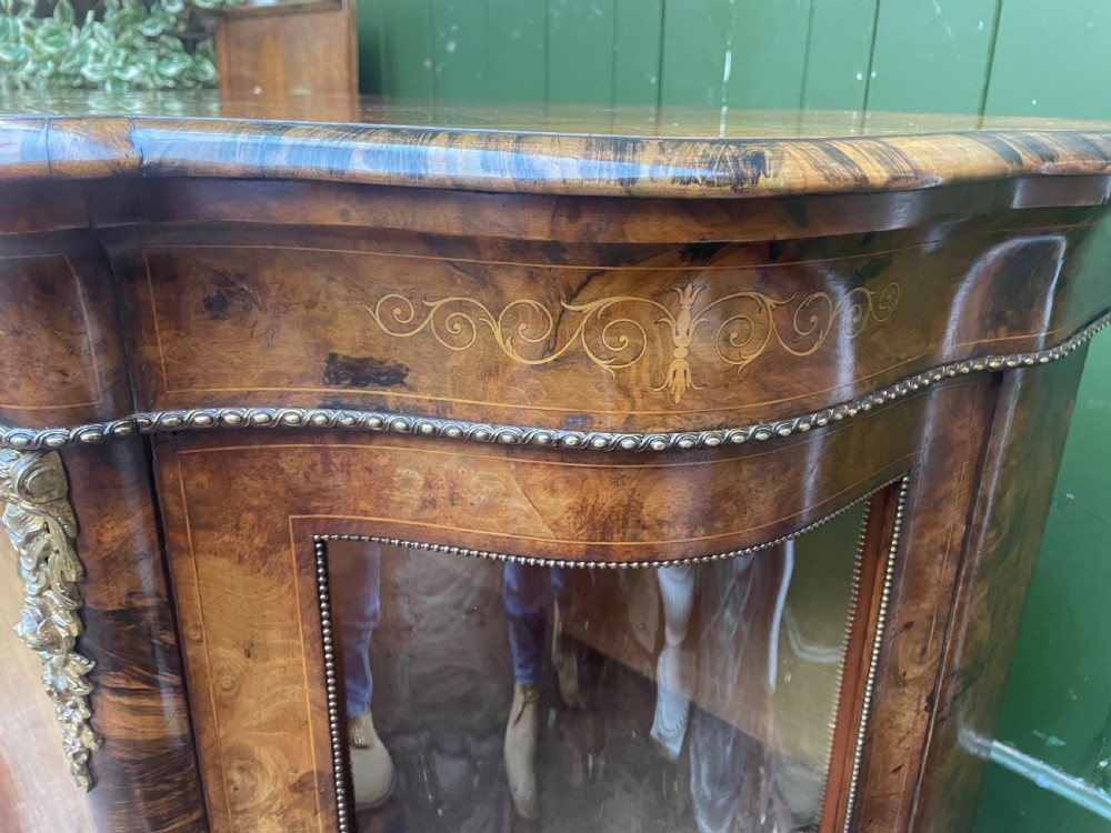 Serpentine shaped glass ends and inlaid panel centre door fitted with ormolu mounts, ormolu beading and ormolu rococo design escutcheons. The burr walnut centre panelled door with box-wood inlay , further ormolu beading to the frame and having a working lock and elaborate gilded key, opening to reveal a velvet-lined interior fitted with a walnut edged shelf .