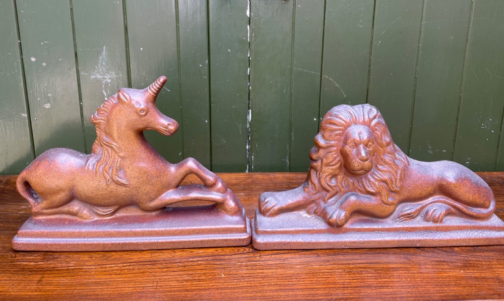 Pair of C19th salt-glazed stone-ware ornamental studies of the Lion and Unicorn, representing the Union of England and Scotland .