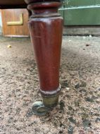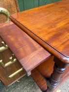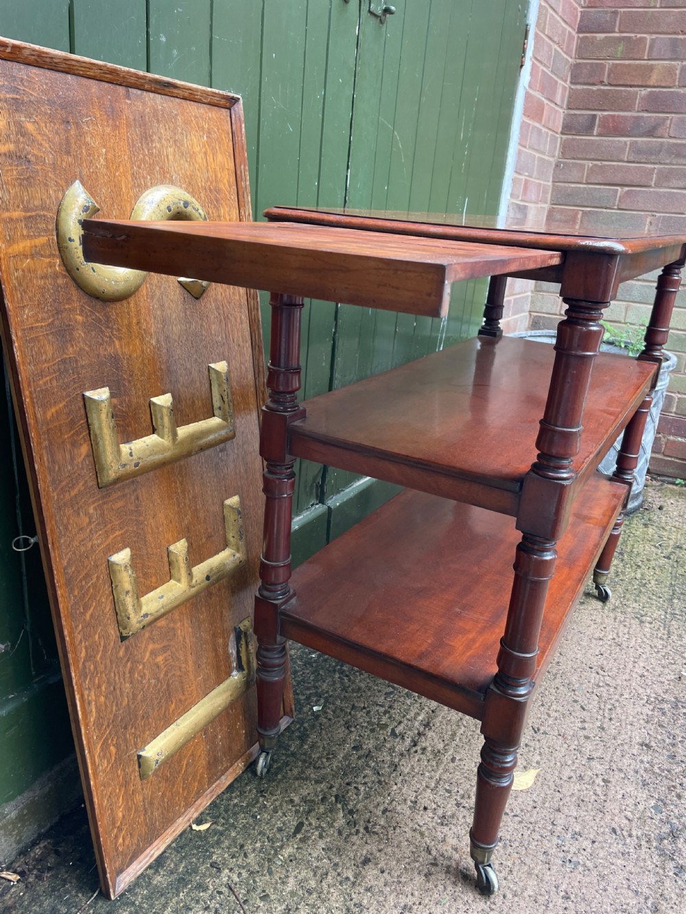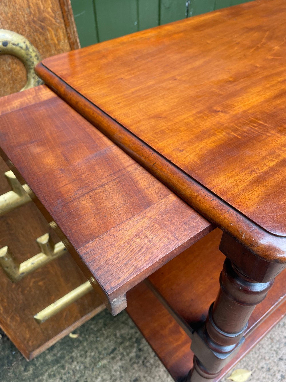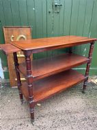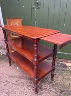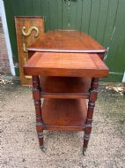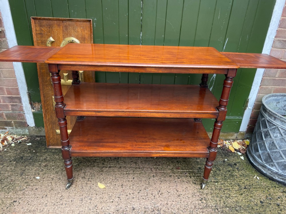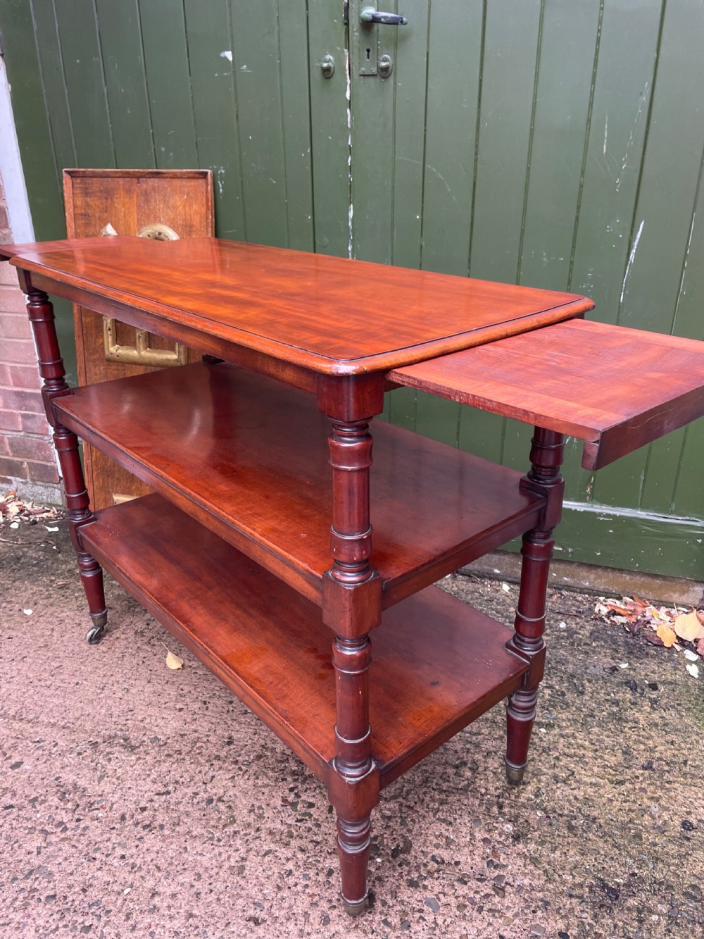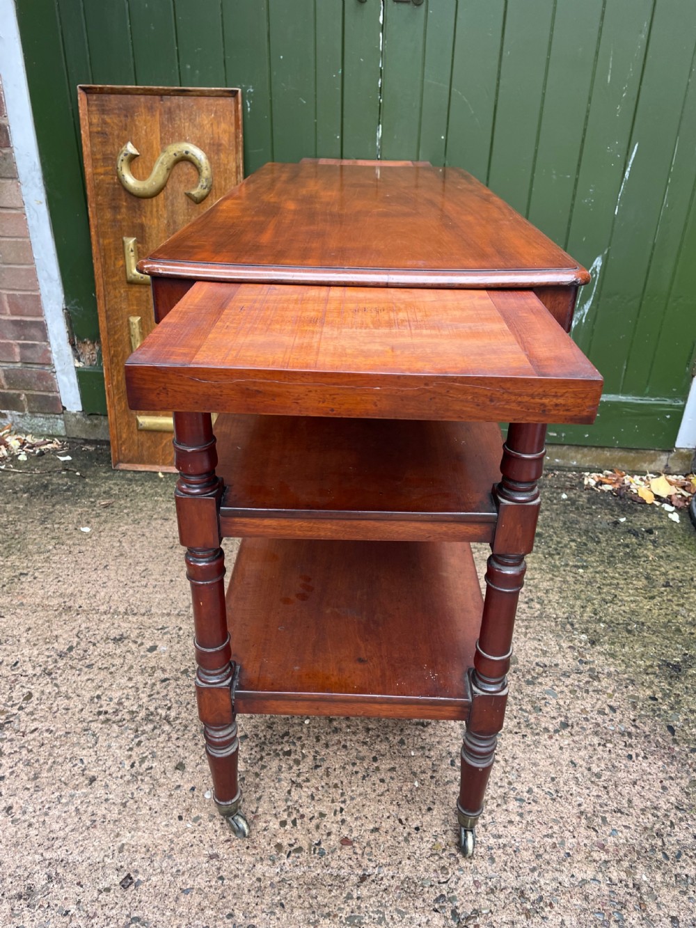 Raised on turned support with original brass cup castors, the turned uprights supporting a moulded edge rectangular top with 2 platforms below . Unusually the ends of the top tier are each fitted with a pull-out extending slide to increase the width of the top when required. Of freestanding form, finished to all sides .