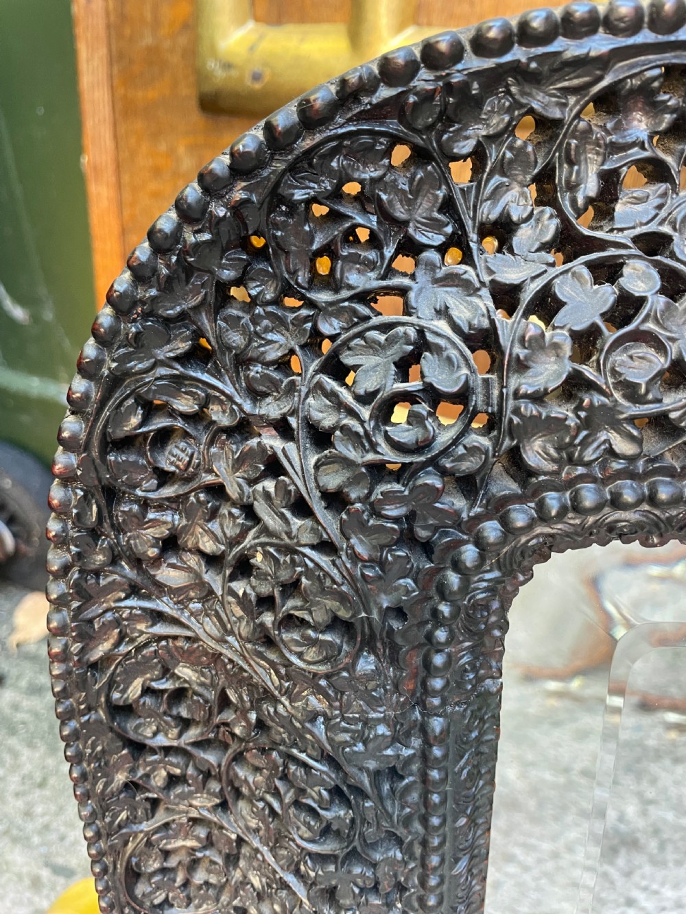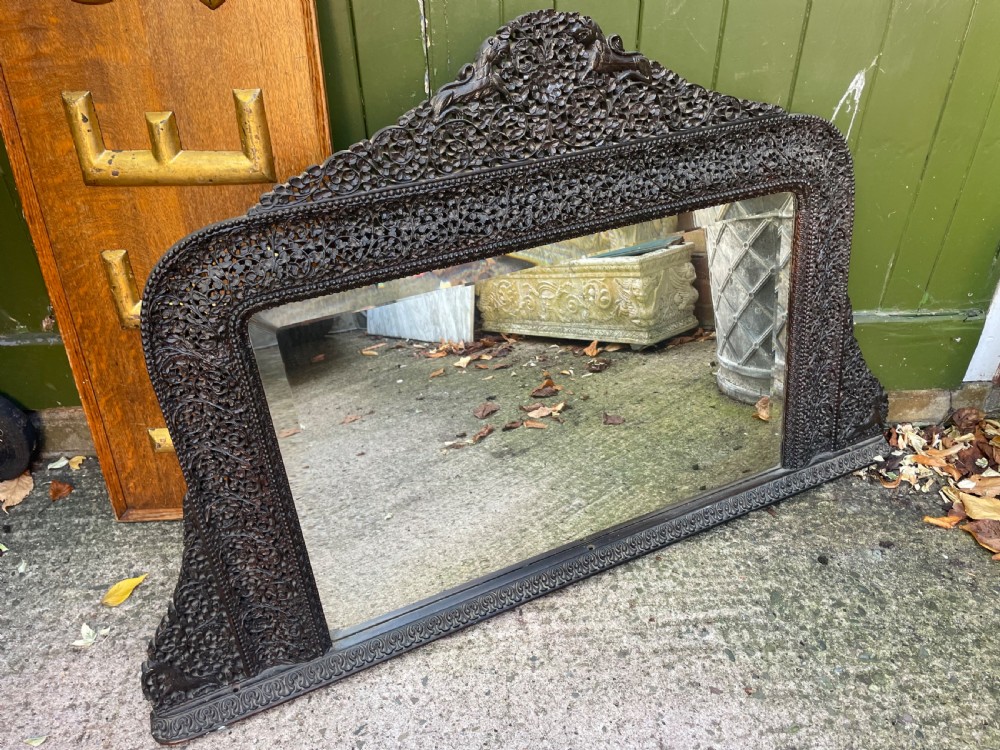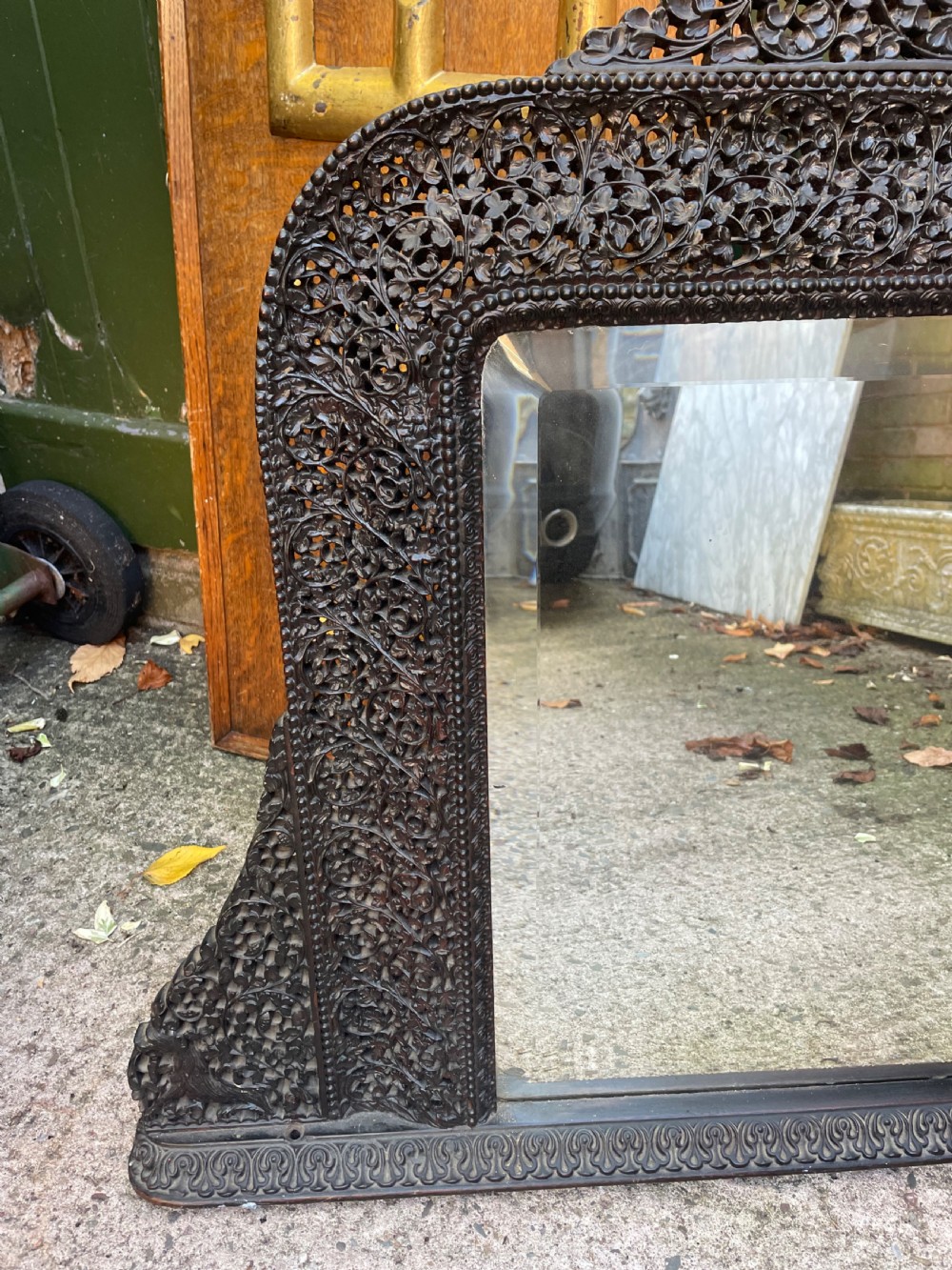 C19th carved Indian or Burmese ‘blackwood’ framed overmantel mirror .