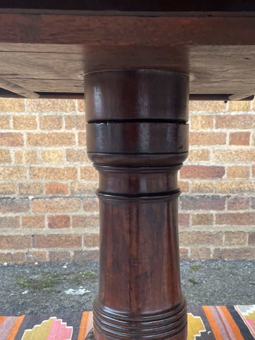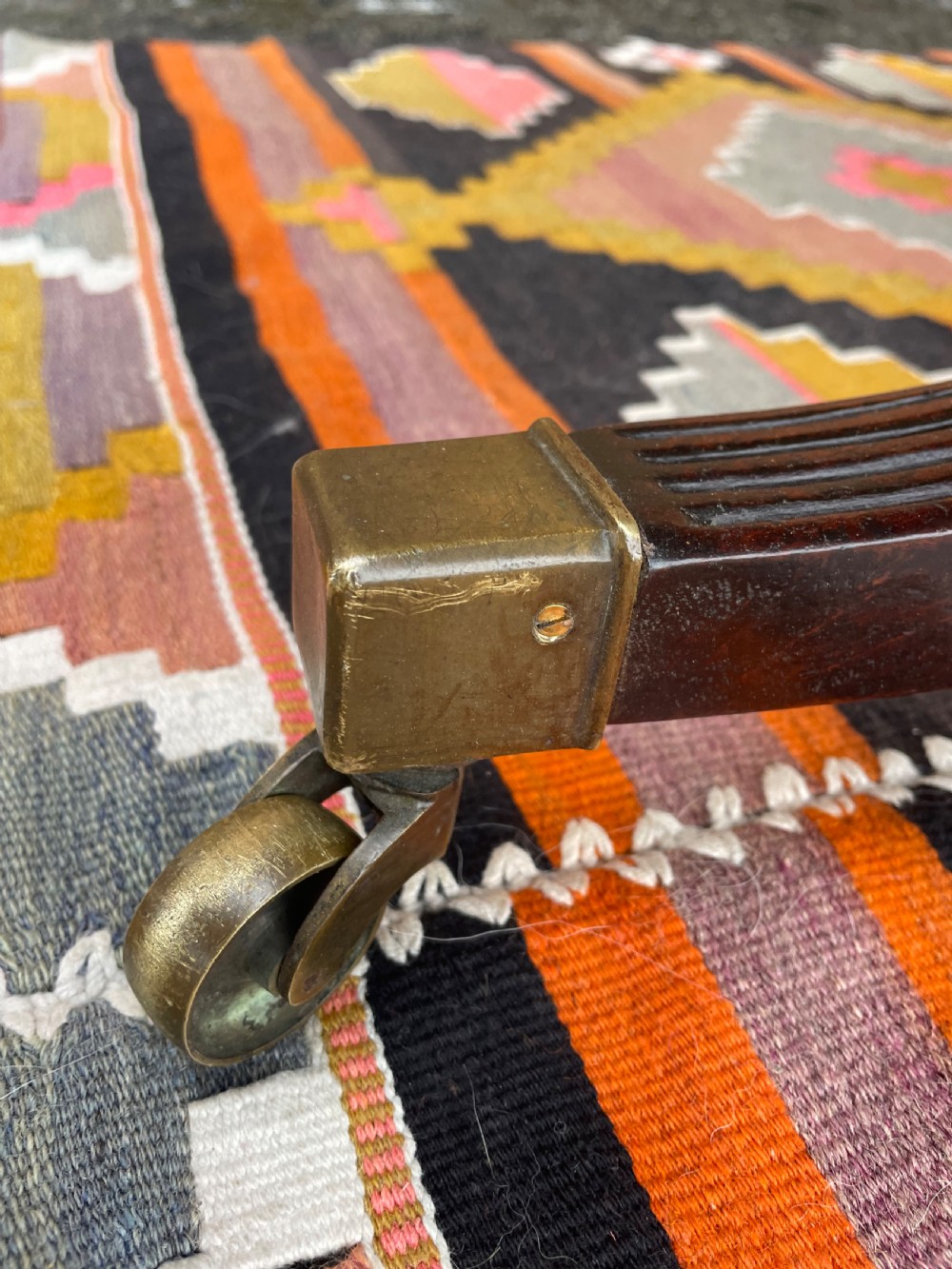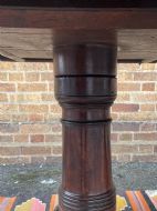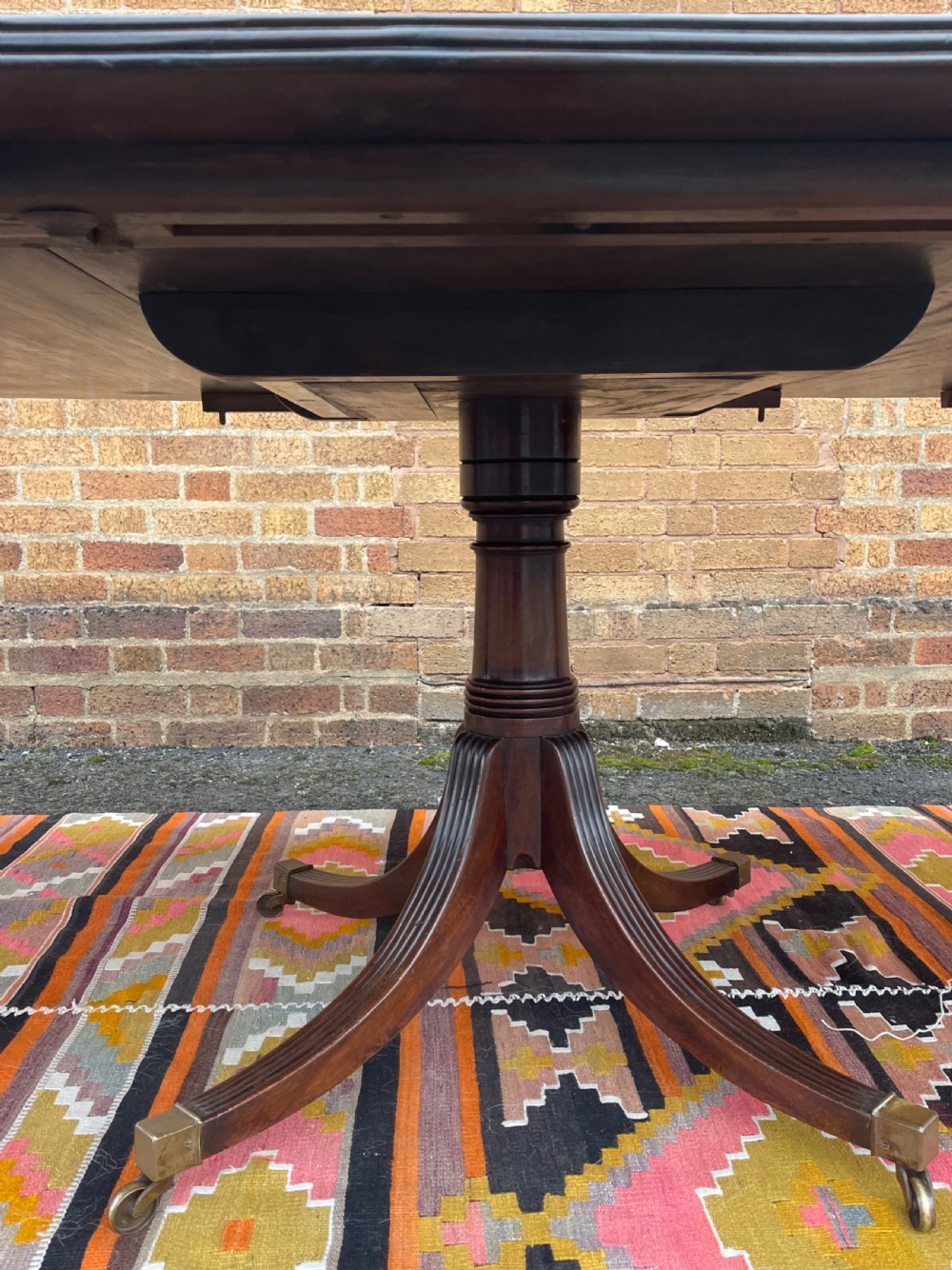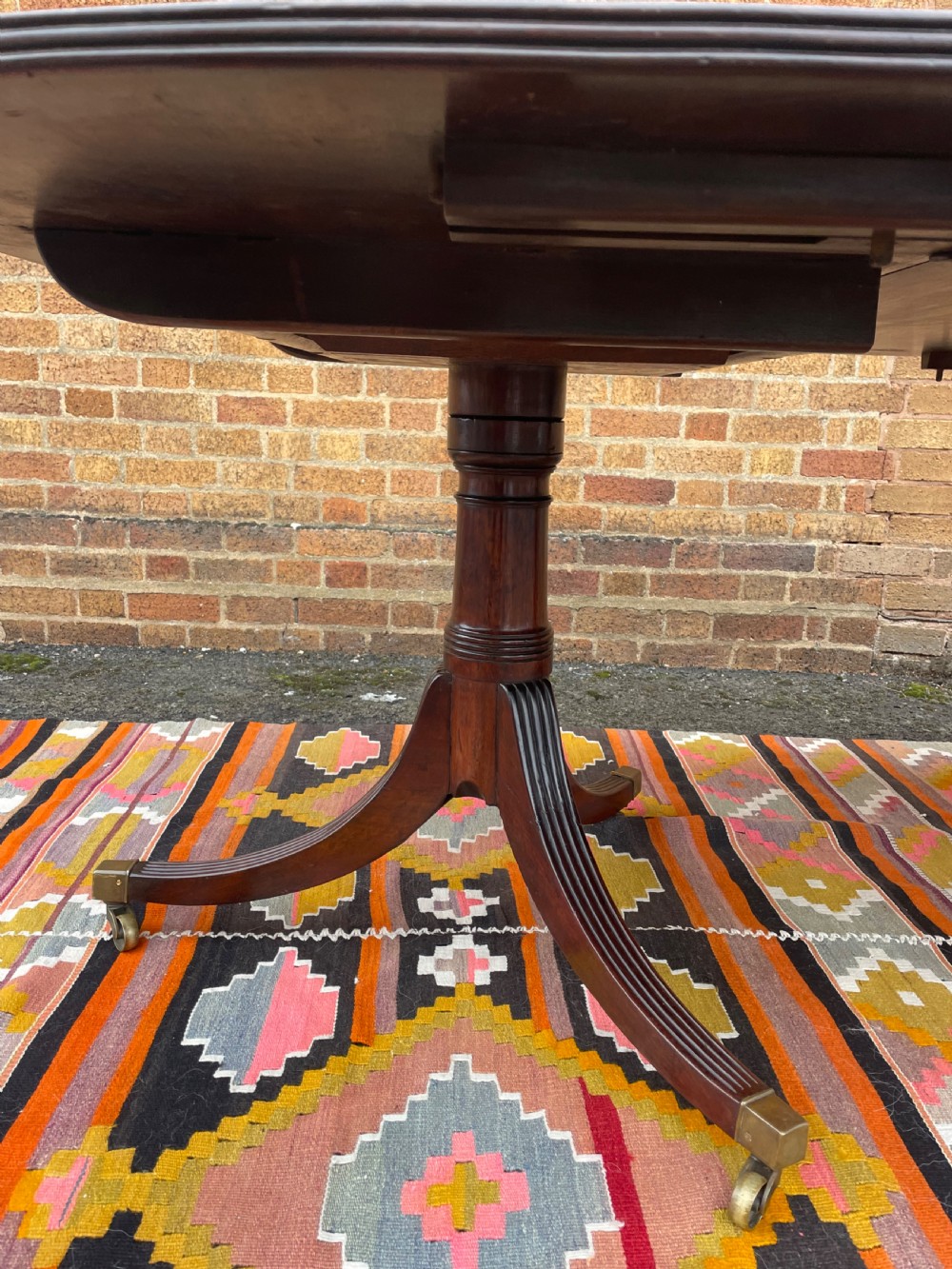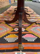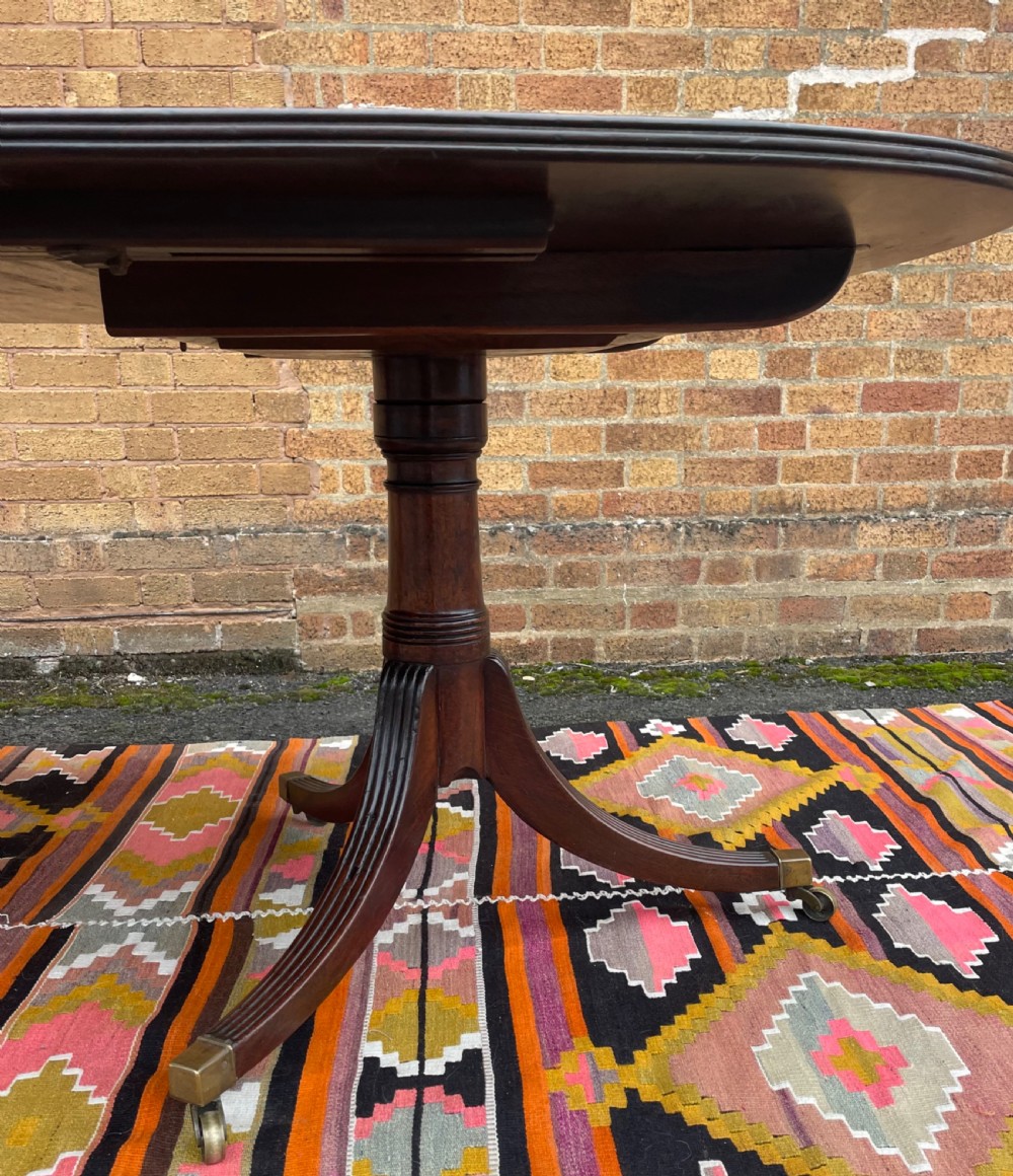 Raised on three turned ‘gun-barrel’ column supports with reeded ring detail , having reeded 3-splay supports to the twin D-shaped end sections, the centre pedestal with corresponding reeded 4-splay supports, all fitted with square box-toe brass castors . Having 2 further extension leaves , one being a later replacement in well-matched period mahogany.