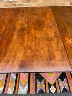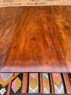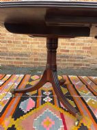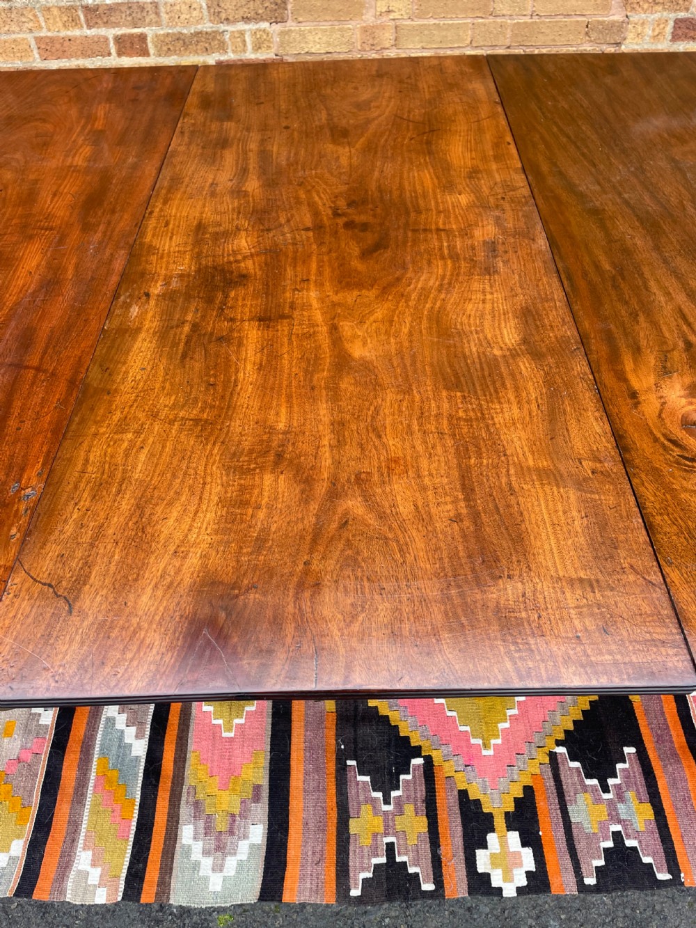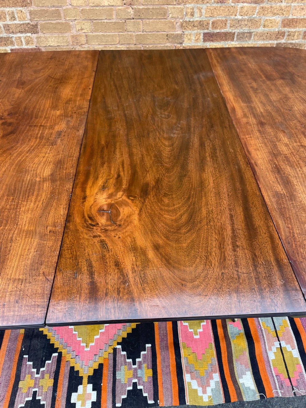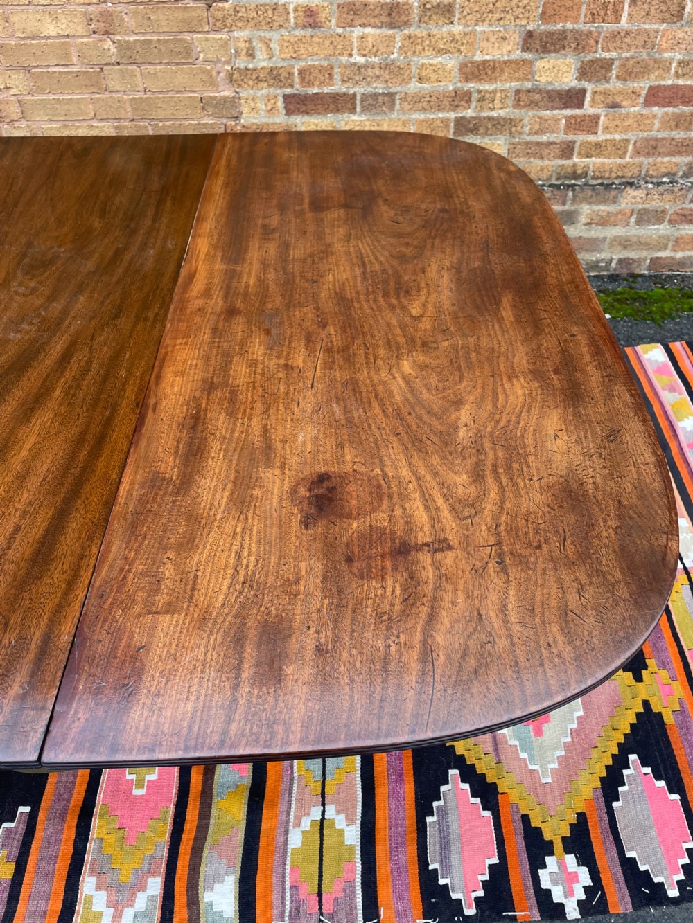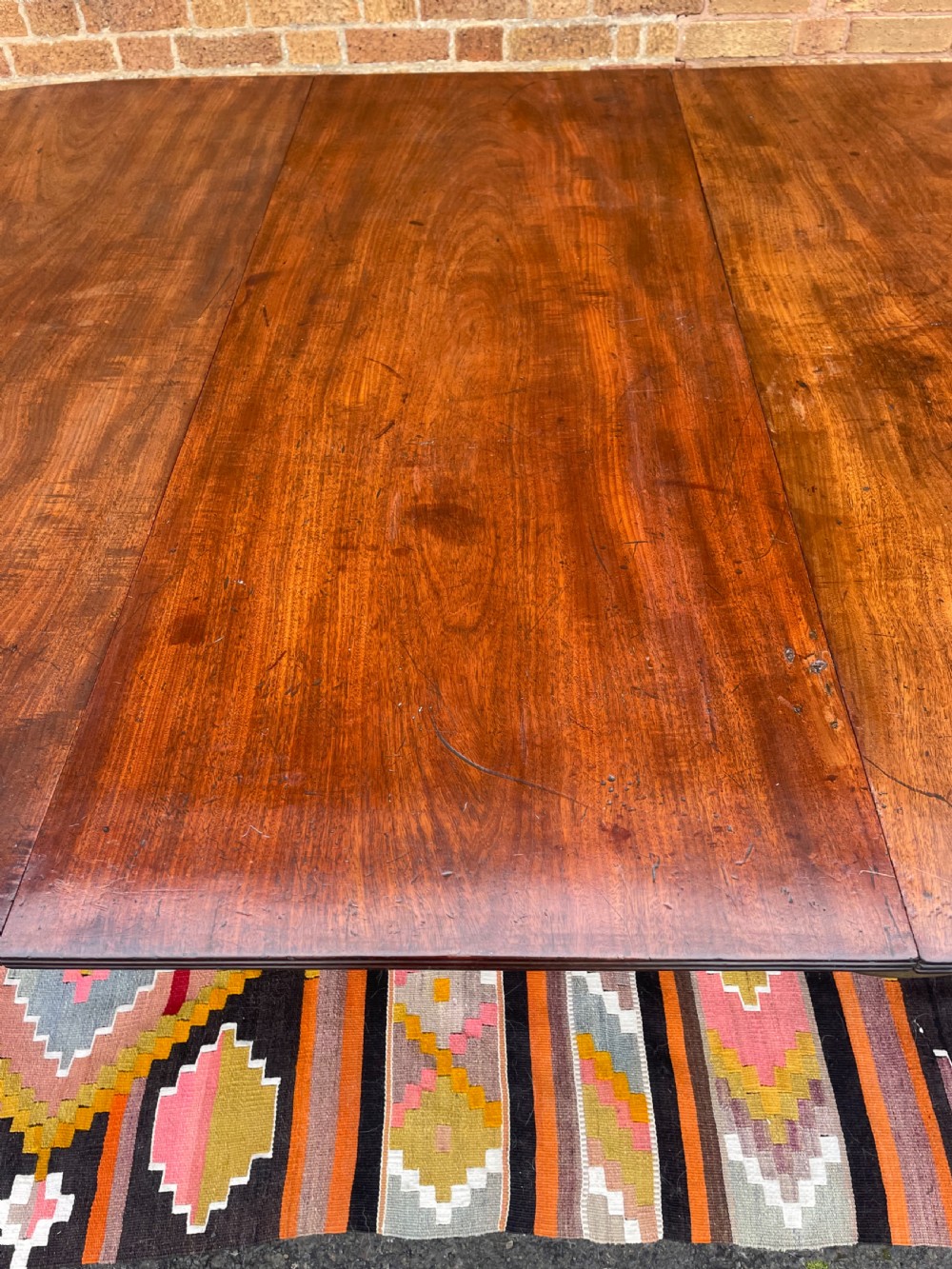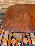 The top retaining it’s original polished surface, having achieved a pleasing mellow colour and patina to the well-selected figured mahogany. Some historic marks and stains commensurate with age, use and purpose. The top having a reeded edge to all sections and leaves . The pedestal sections all fitted with pull-out ‘lopers’ to support the additional leaves . The twin D-end sections having tilting actions and fitted with brass handles and catches , the whole having original brass fittings and ‘fork’ clips to secure the sections together.