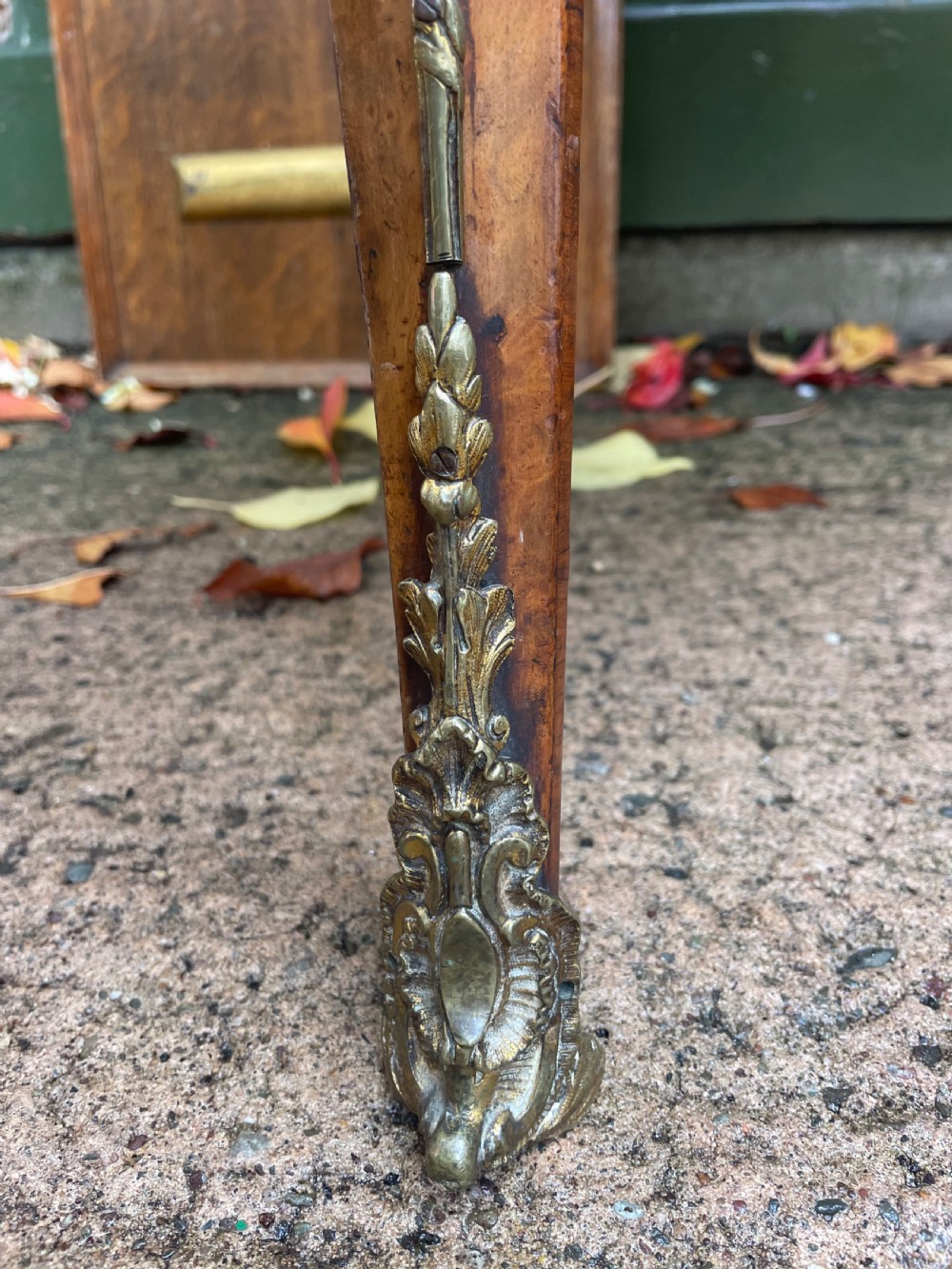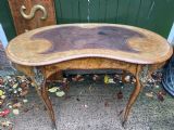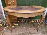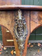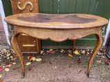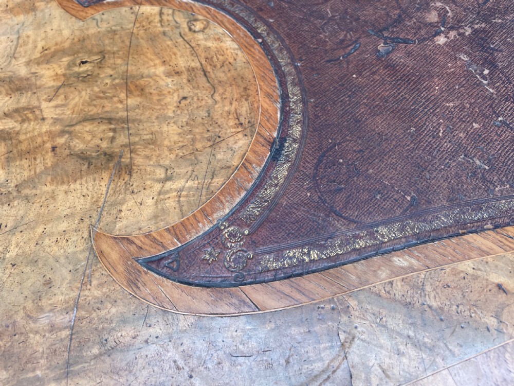 Cross-banded and inlaid with satinwood and kingwood, the top retaining its original inset shaped Morocco leather writing surface with gilt-tooled edge . The shapely cabriole-style legs each with an elaborate brightly gilded ormolu bronze full-length mount onto sabot feet . The friezes of serpentine outline , the front central frieze section having a ‘concealed’ mahogany-lined full-length drawer.