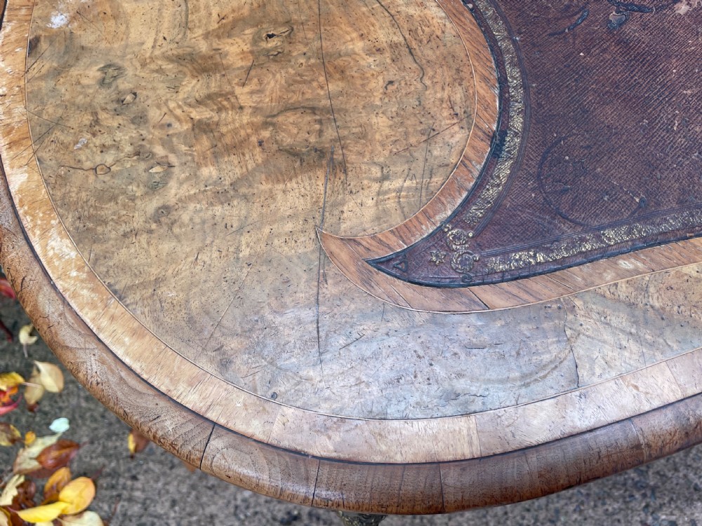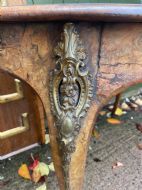 A flamboyant English walnut table in the French Louis XVI period taste , probably by the esteemed cabinet-making firm Gillows of Lancaster.
