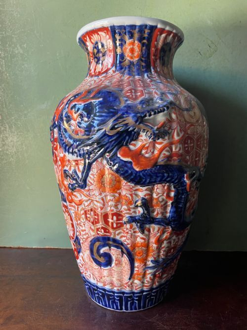 Late C19th Japanese Imari porcelain baluster vase with raised high-relief coiled dragon decoration.