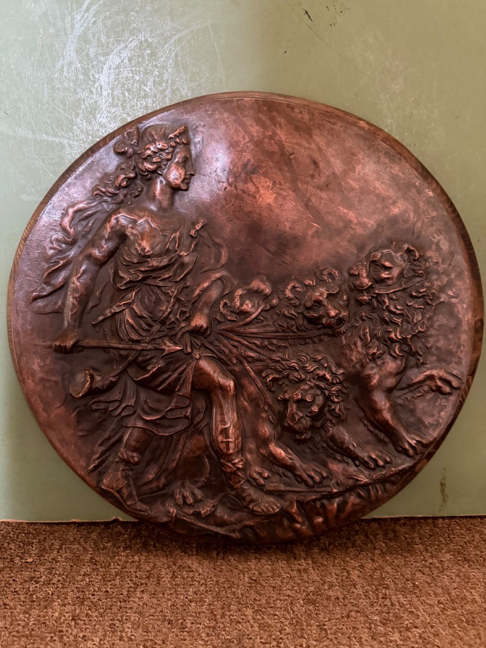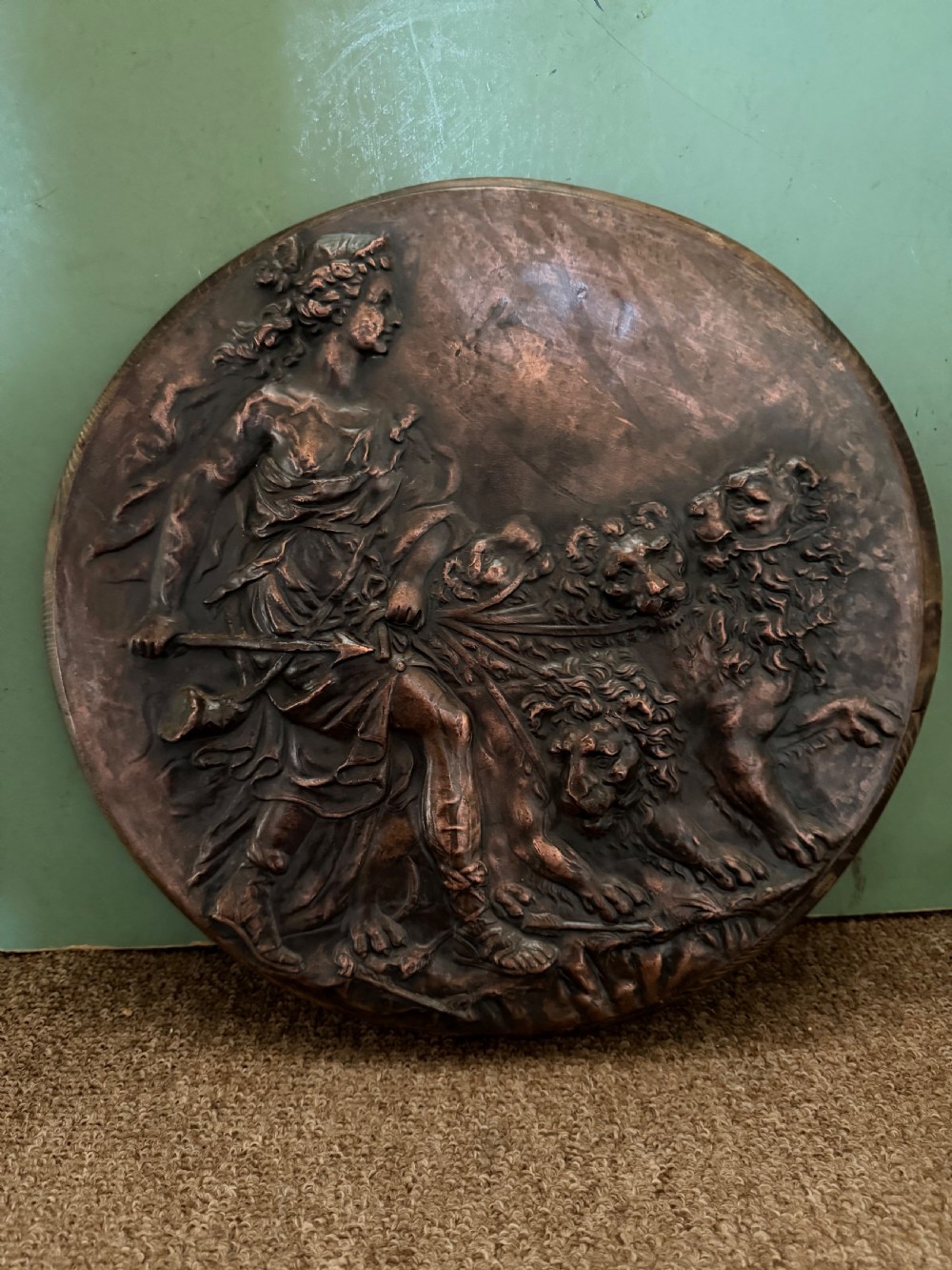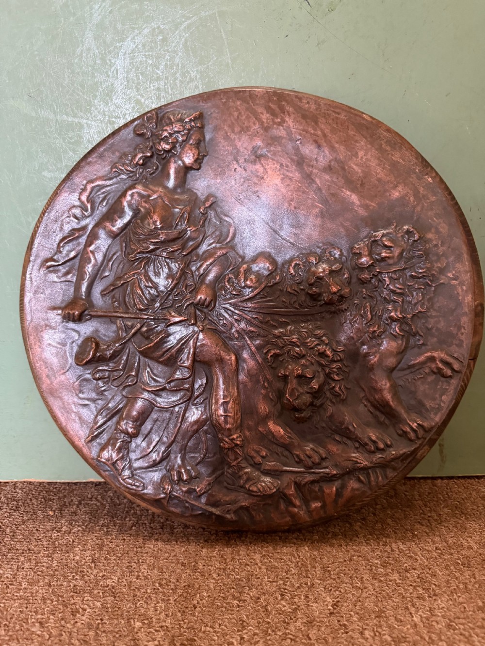 Well-modelled plaque probably depicting the Greek goddess Cybele with a pride of lions on leashes. The copper patinated to imitate bronze , having minor areas of polished high-points .