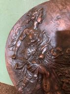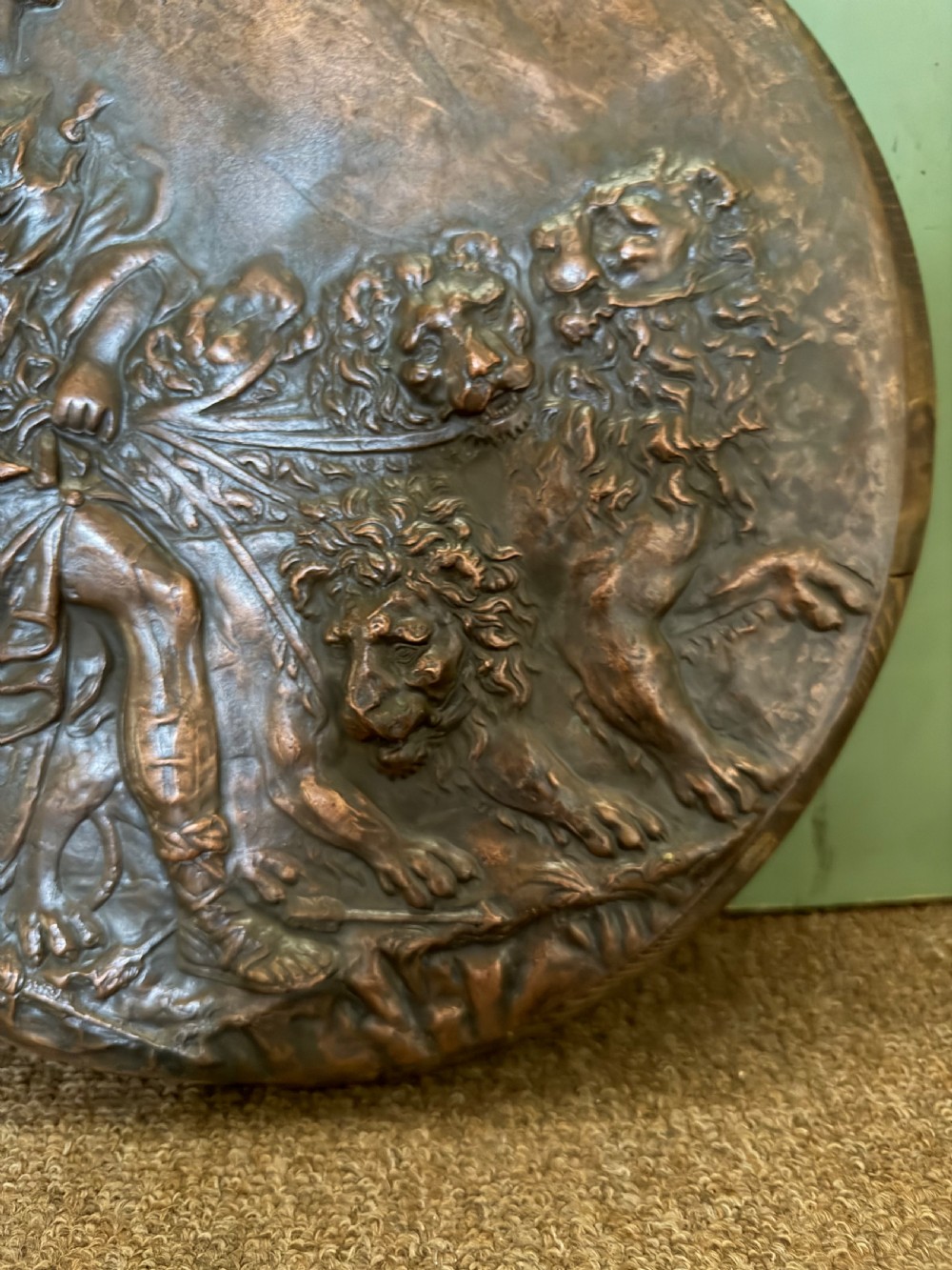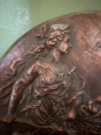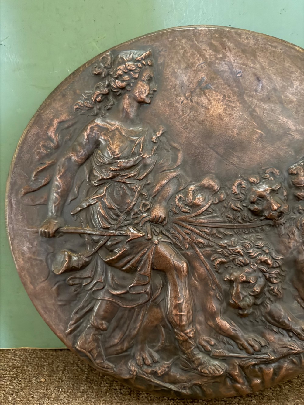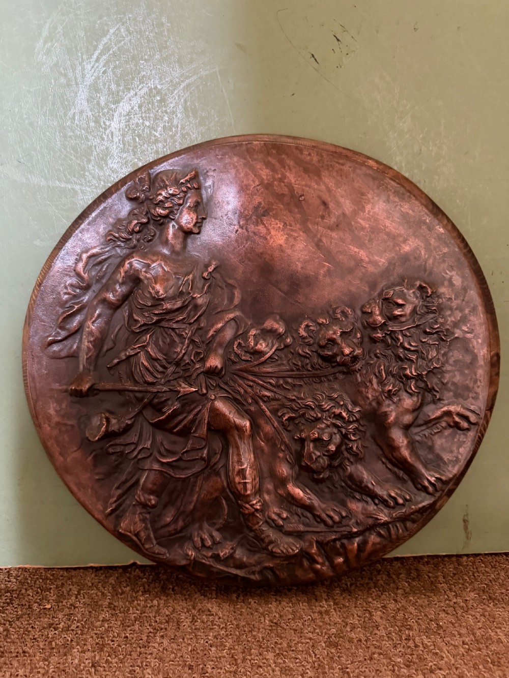 Well-modelled plaque probably depicting the Greek goddess Cybele with a pride of lions on leashes. The copper patinated to imitate bronze , having minor areas of polished high-points .