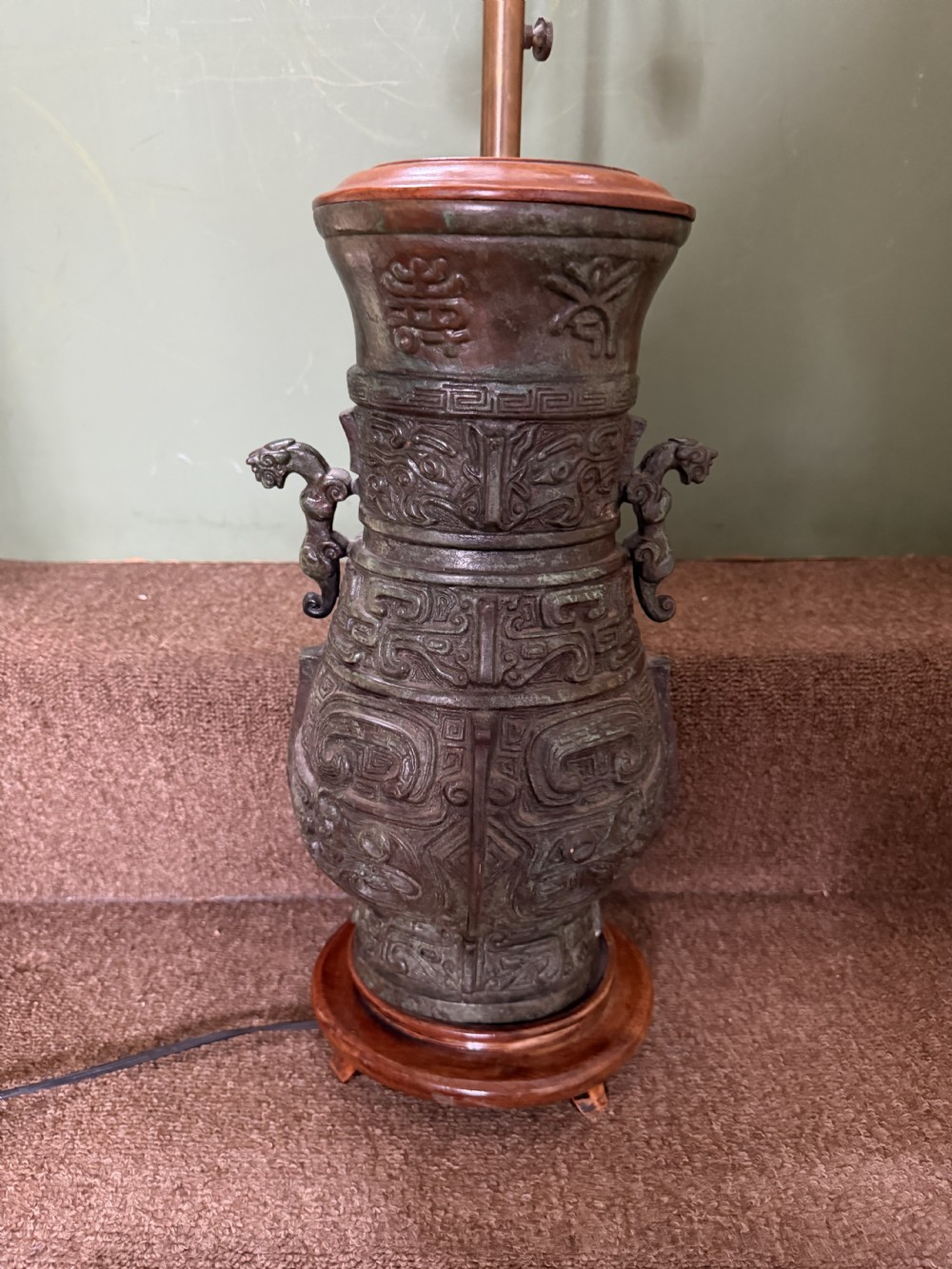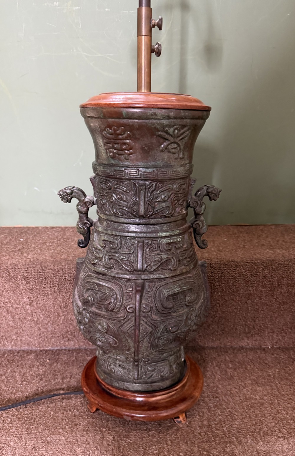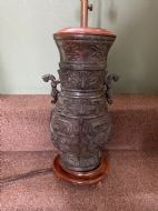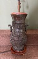 Well modelled copy of an ancient Chinese bronze vase or vessel with polished hardwood base and cap , fitted with an adjustable height brass twin-branch lamp fitting.