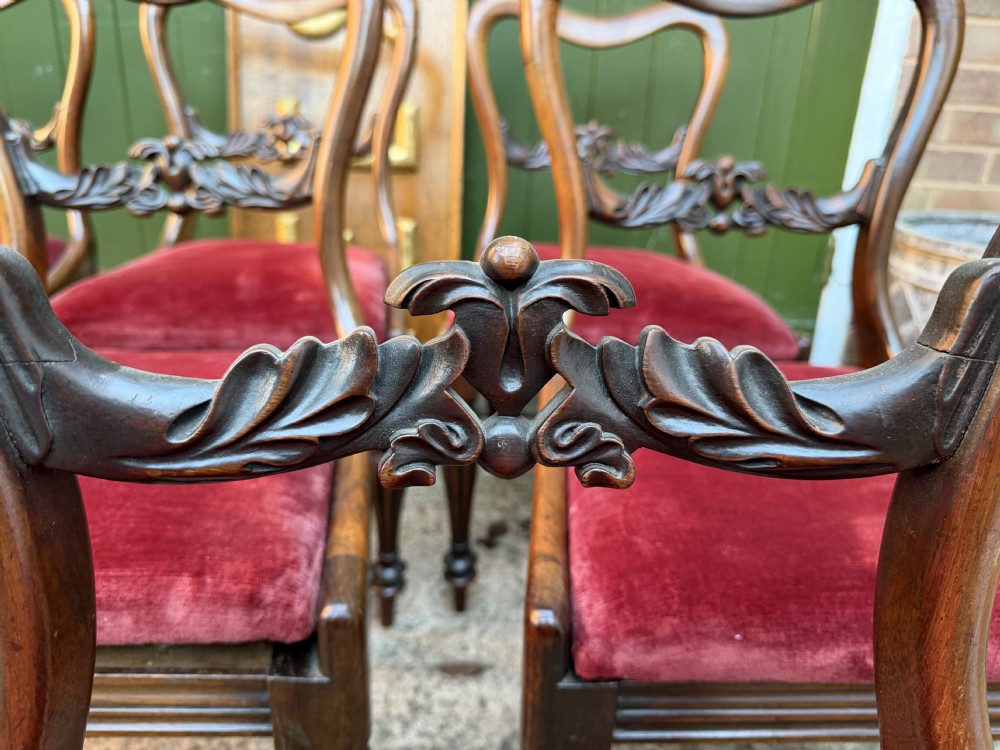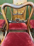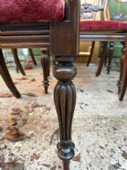 Raised on shaped reeded forelegs with carved feet, the shaped ‘crown’ or ‘buckle’ backs above an elaborately carved lumbar bar . The drop-in seats upholstered in corded plushly fabric , all in serviceable condition.