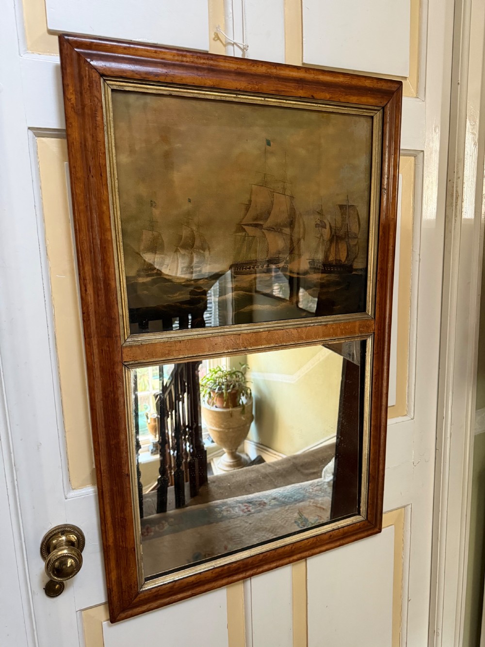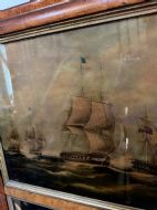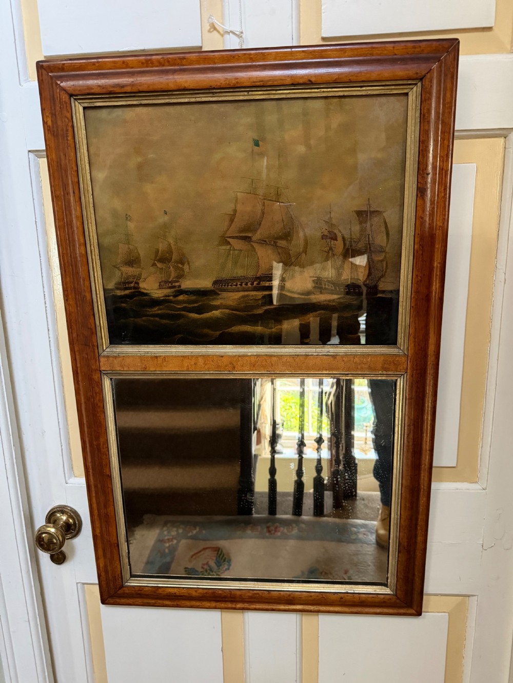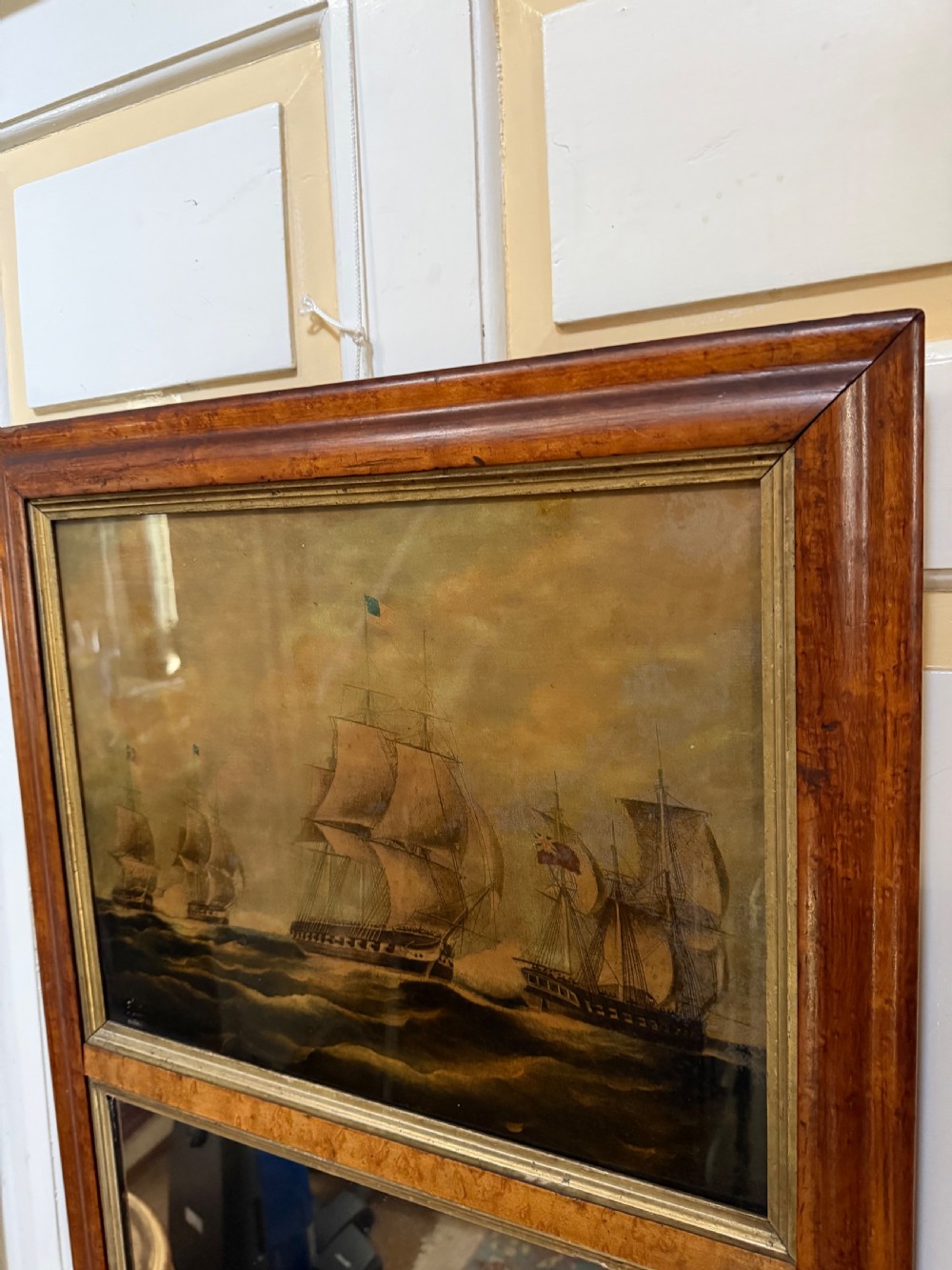 The silvered mirror plate within the figured burr maple moulded-profile frame surrounded by gilt slips . The top panel with a reverse glass print depicting naval ‘Men o’ War’ ships in full sail ,engaged in battle, flying the ‘The Stars and Stripes’ flag and the British Ensign respectively.