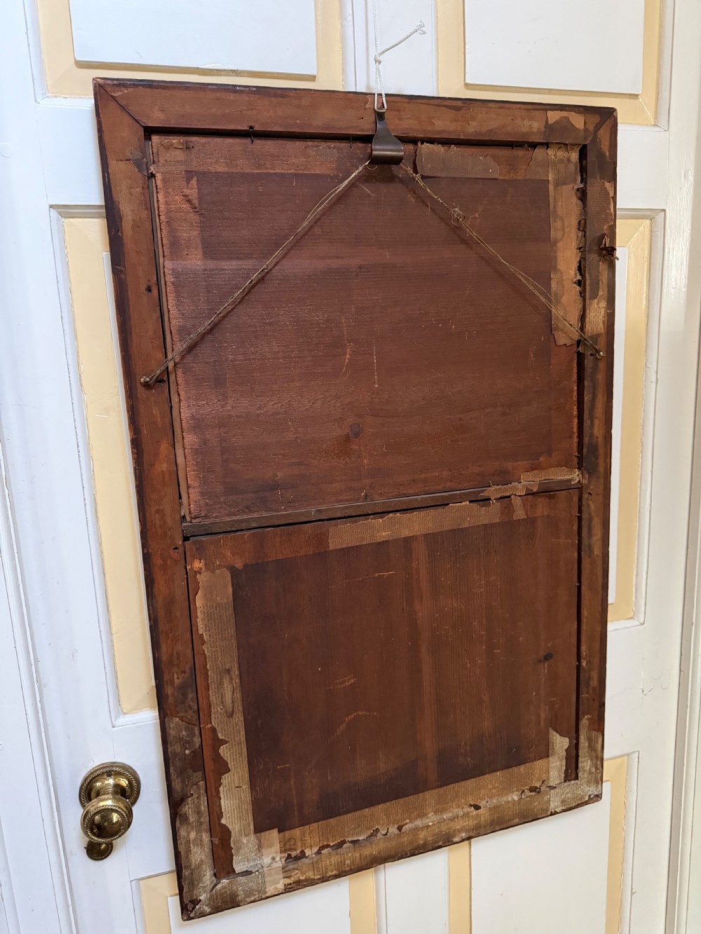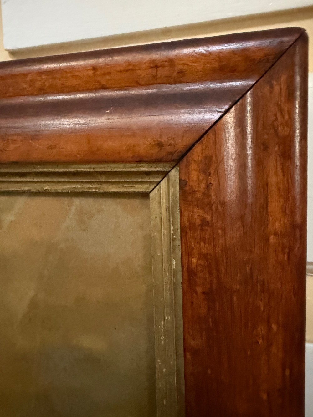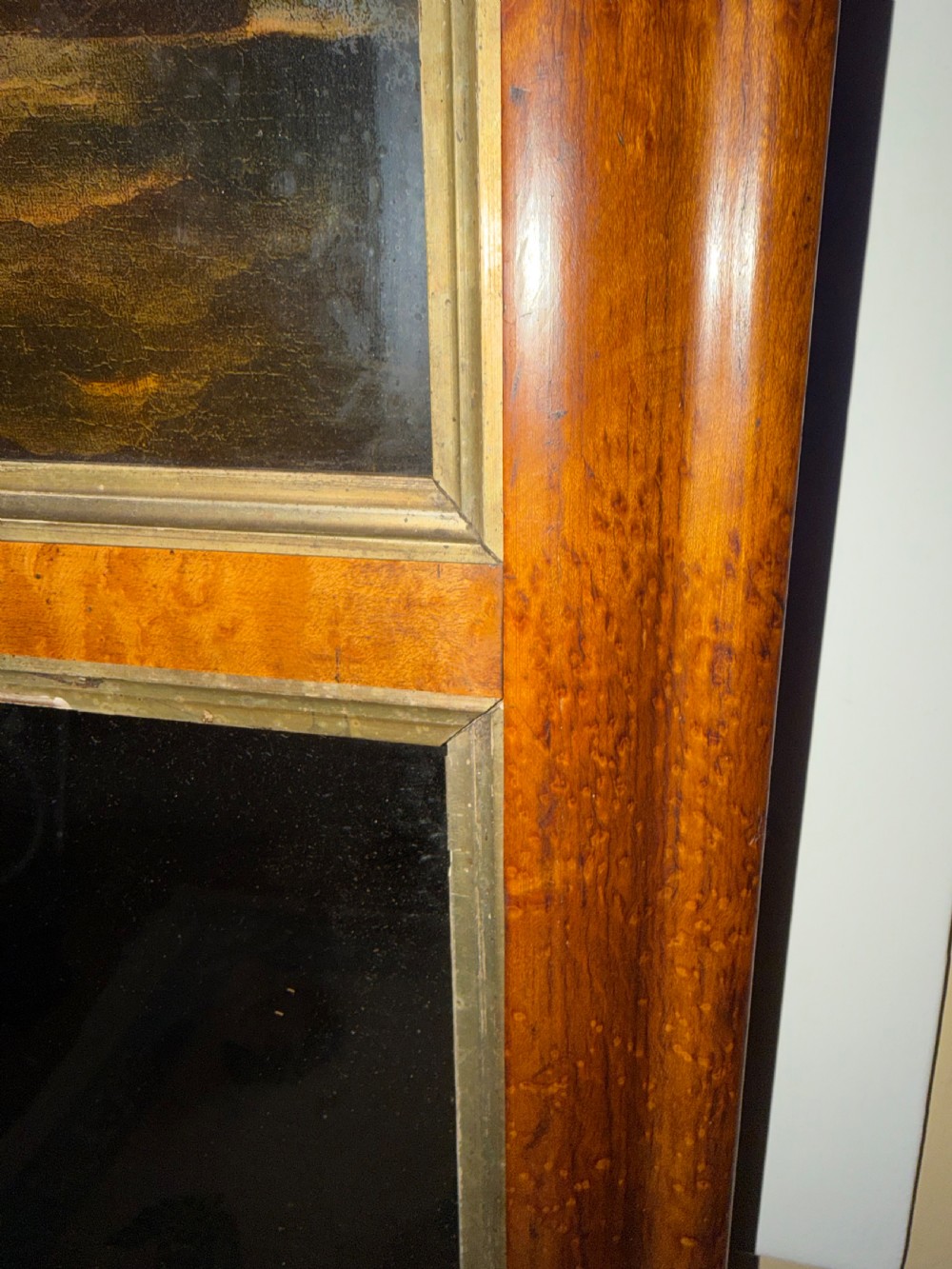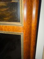 The silvered mirror plate within the figured burr maple moulded-profile frame surrounded by gilt slips . The top panel with a reverse glass print depicting naval ‘Men o’ War’ ships in full sail ,engaged in battle, flying the ‘The Stars and Stripes’ flag and the British Ensign respectively.