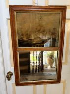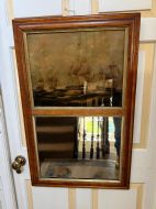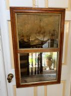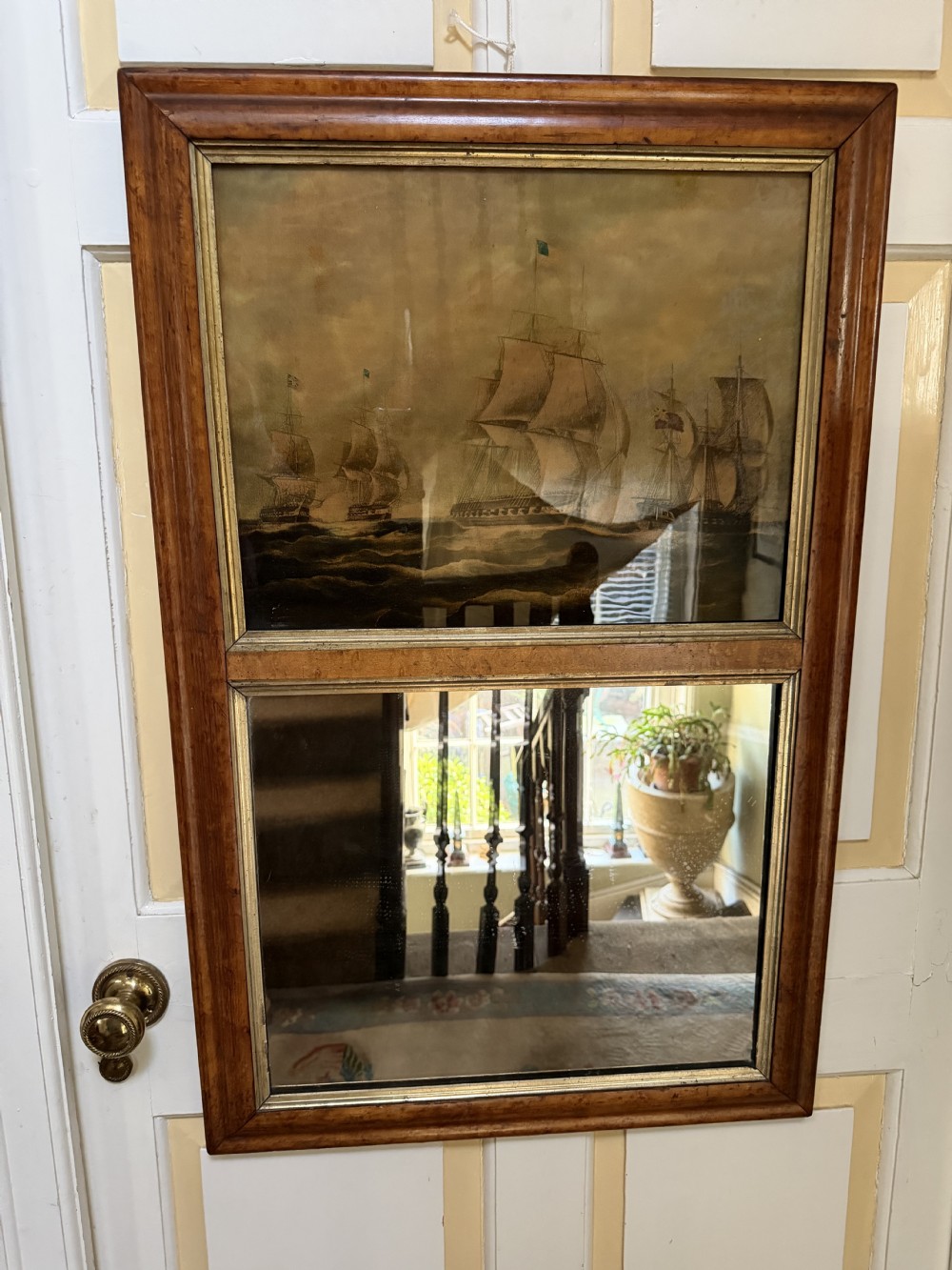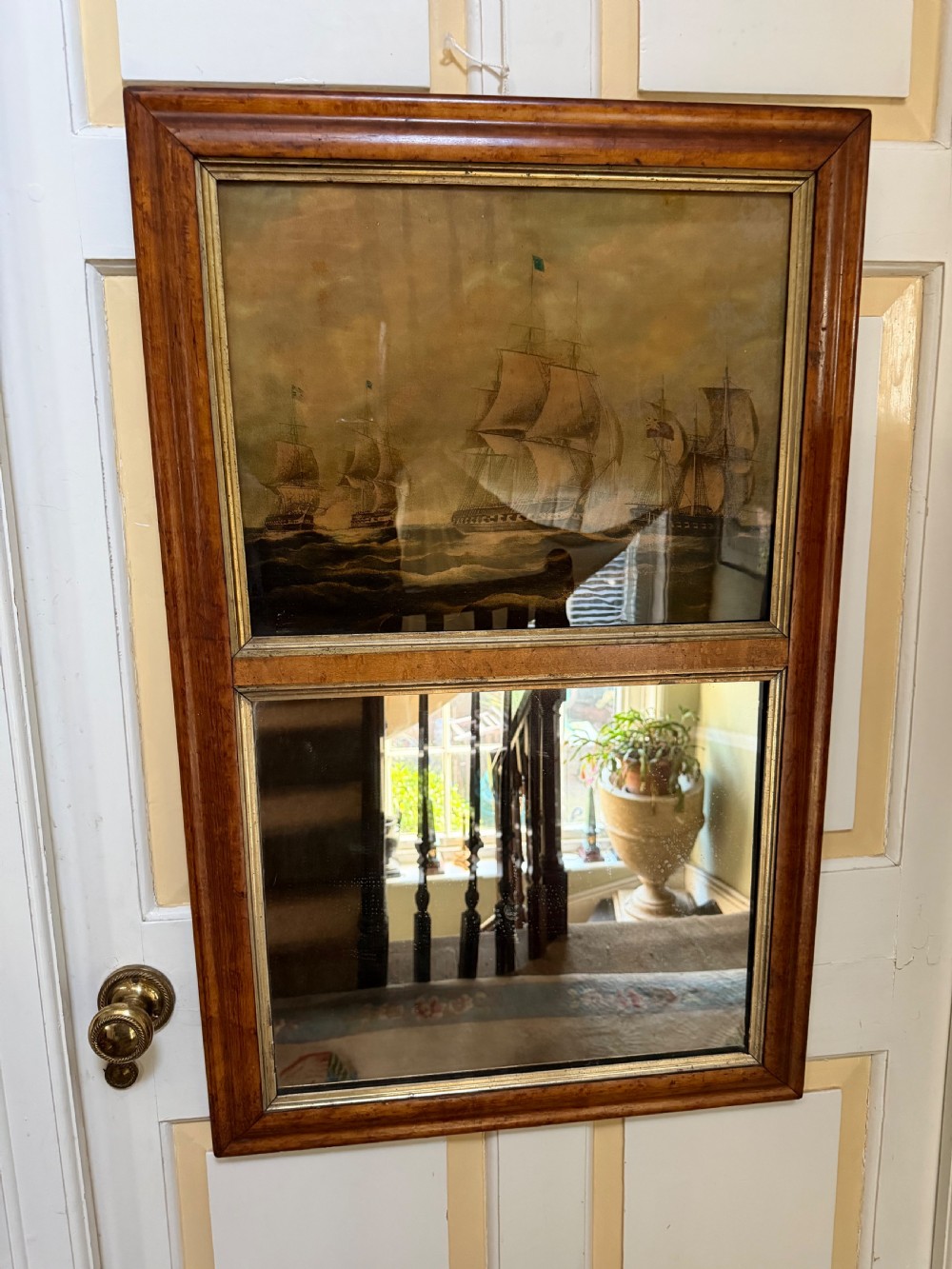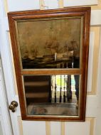 Interesting and rare early C19th maple-framed divided 2-section mirror with a reverse glass print above depicting an American and British naval engagement.