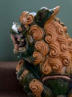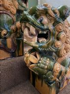 Highly decorative pair of glazed pottery Foo Dogs which could be utilised in either an interior or exterior scheme to add an exotic Oriental element .