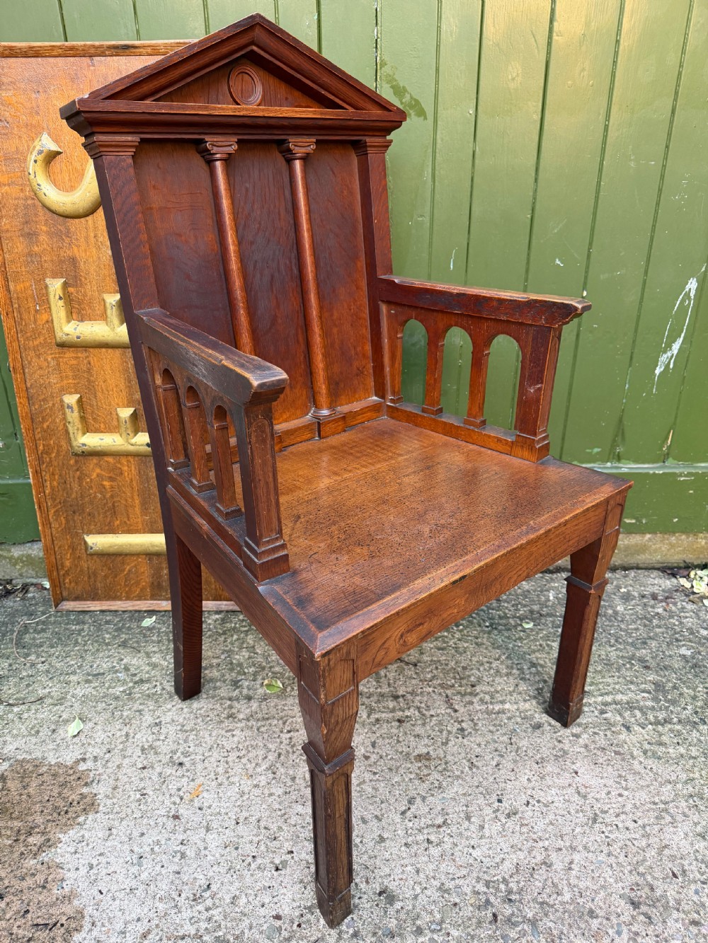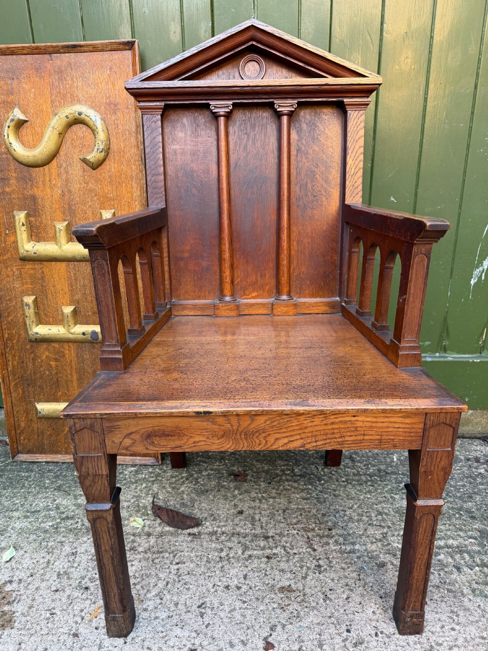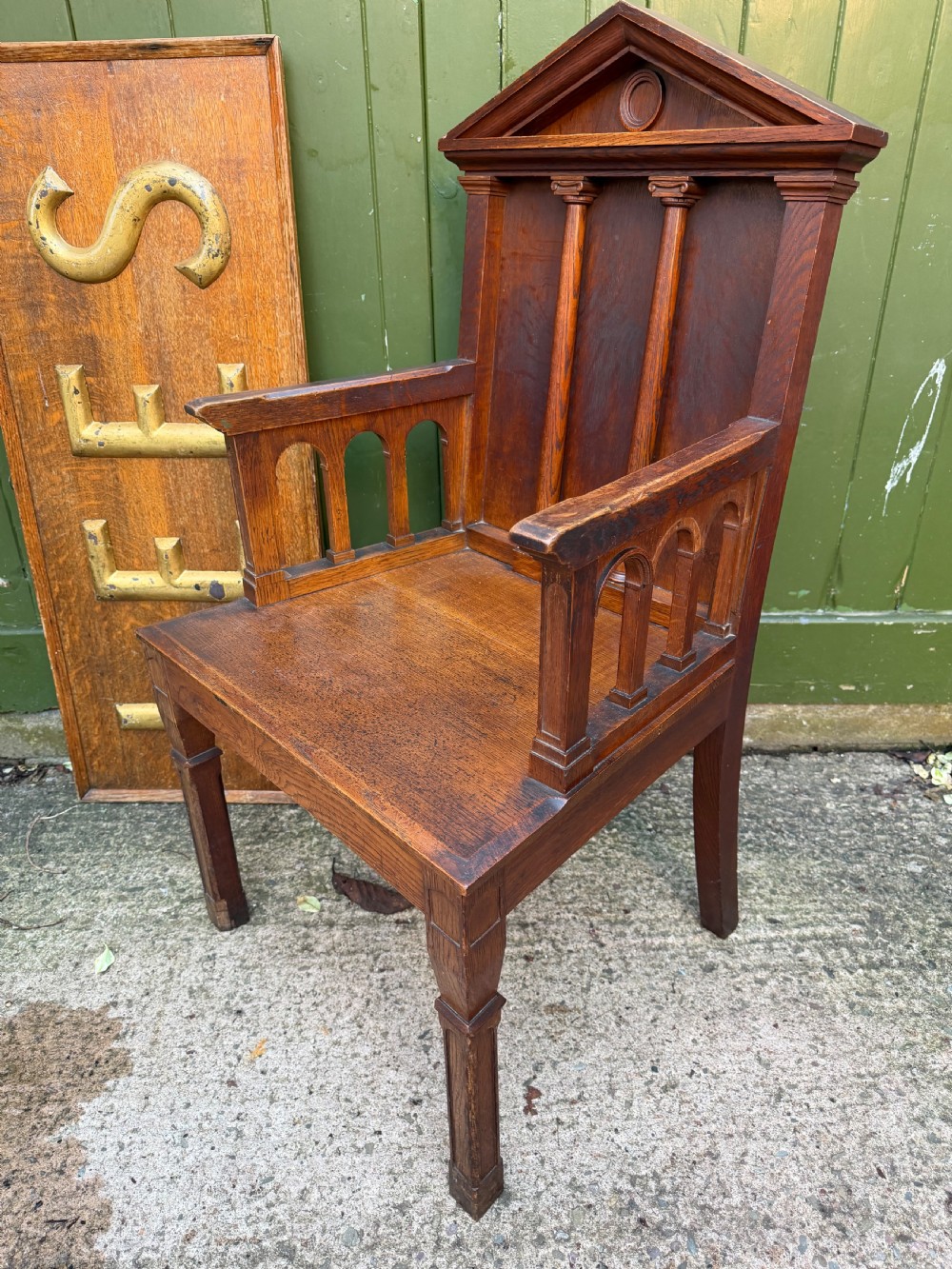 Interesting mid C19th oak armchair with an architectural ‘Palladian’ style classical back back .