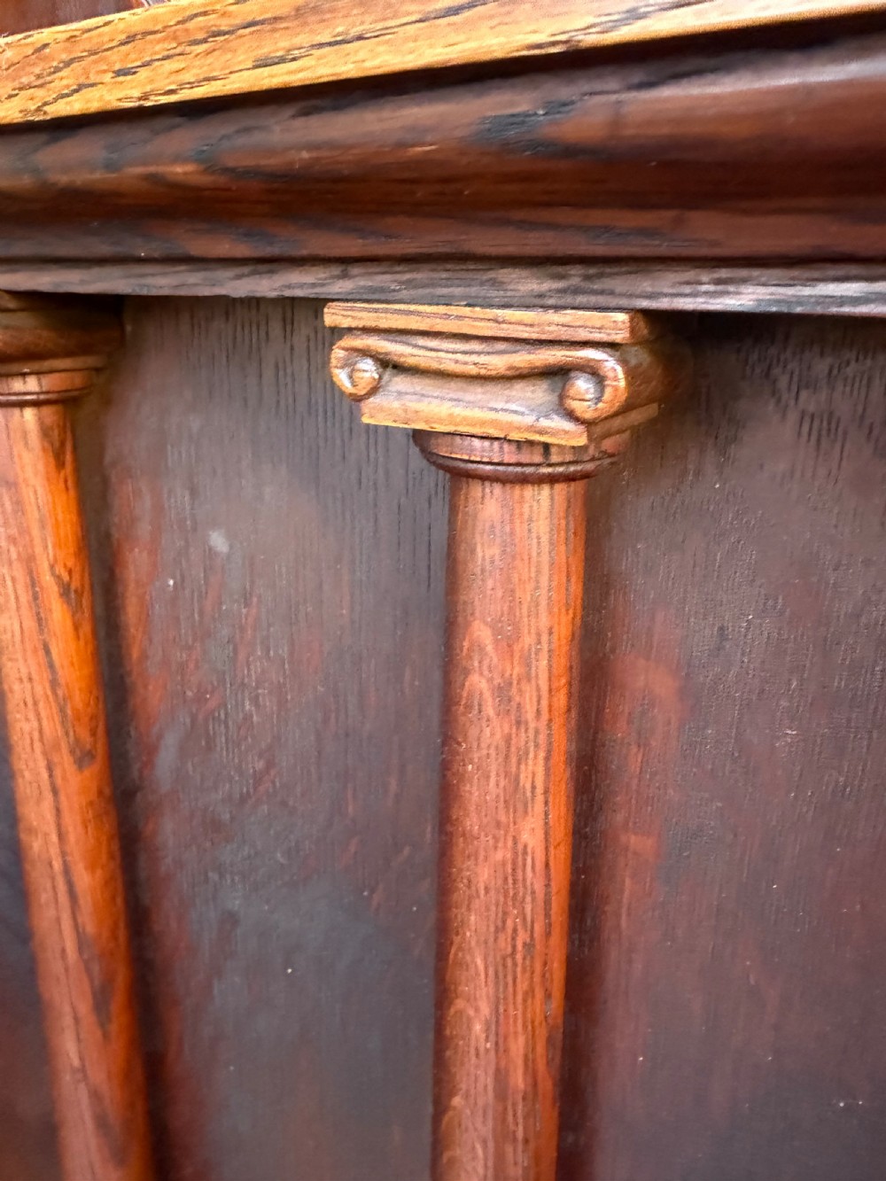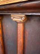 The shaped triangular classically designed back with a moulded roundel with the tympaniium , supported on 2 classical column supports with carved doric capitals within the panelled back-rest , and having flat pilaster sides .