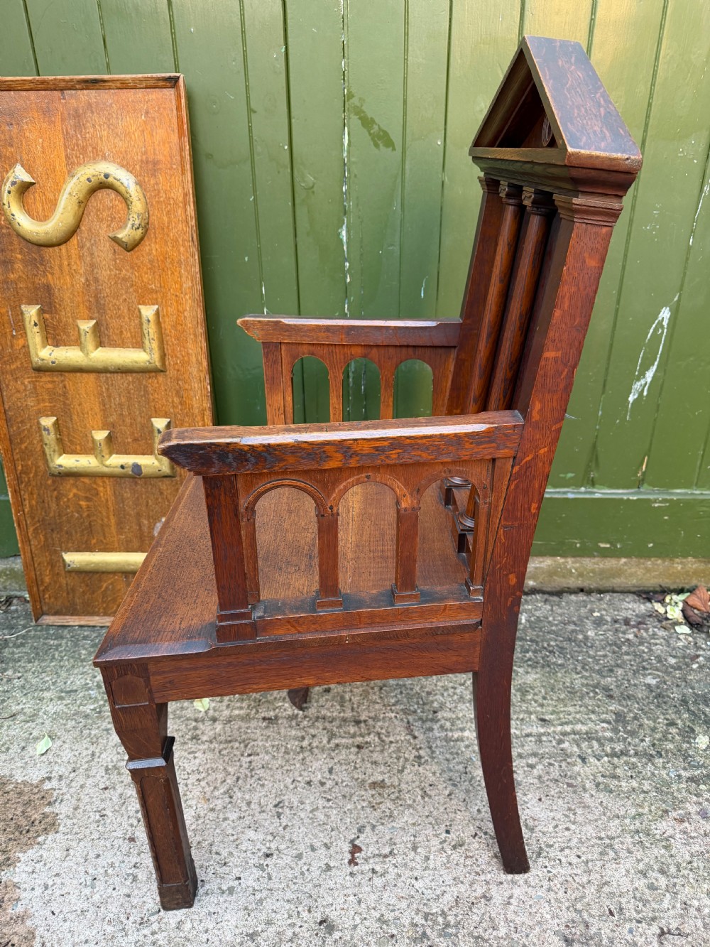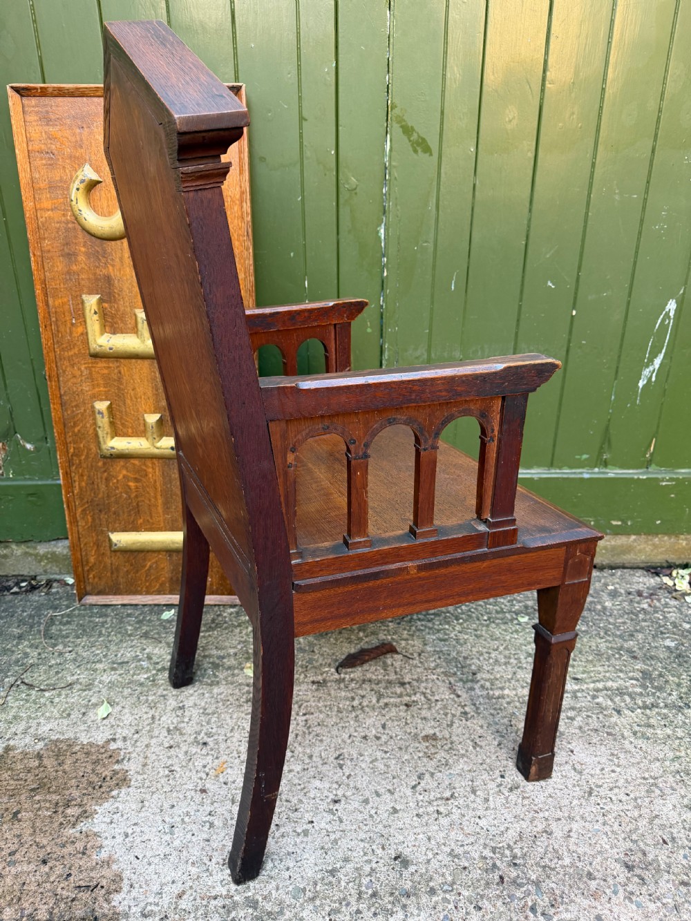 Raised on square forelegs with Gothic tracery style decoration, the arms having open arcaded arch sides with carving moulding details , and having a solid seat .