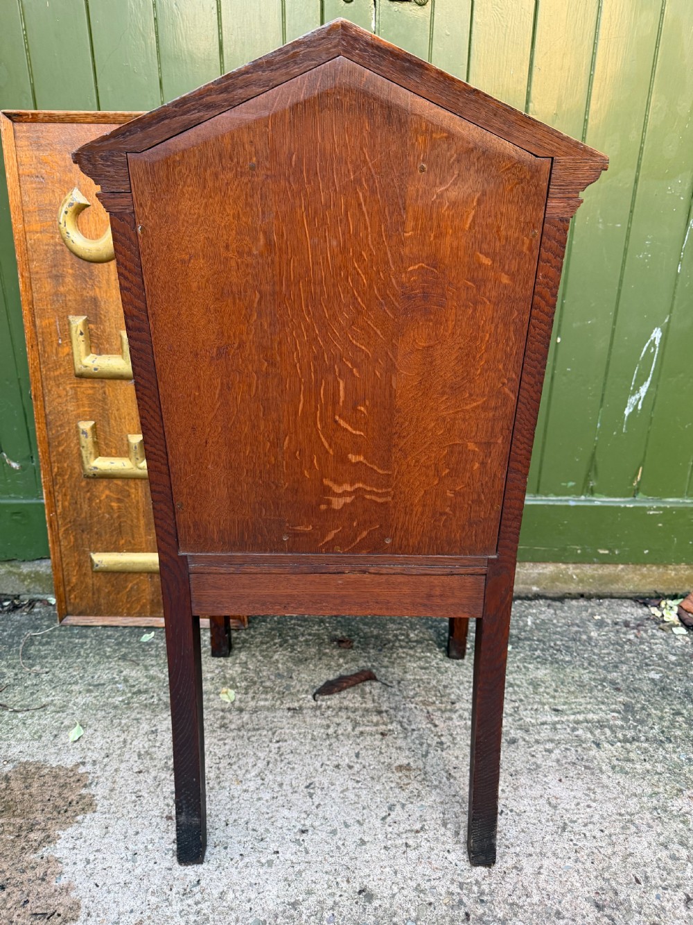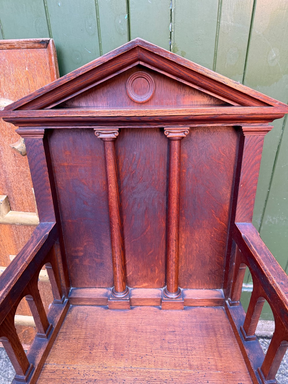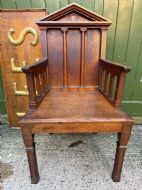 Interesting mid C19th oak armchair with an architectural ‘Palladian’ style classical back .