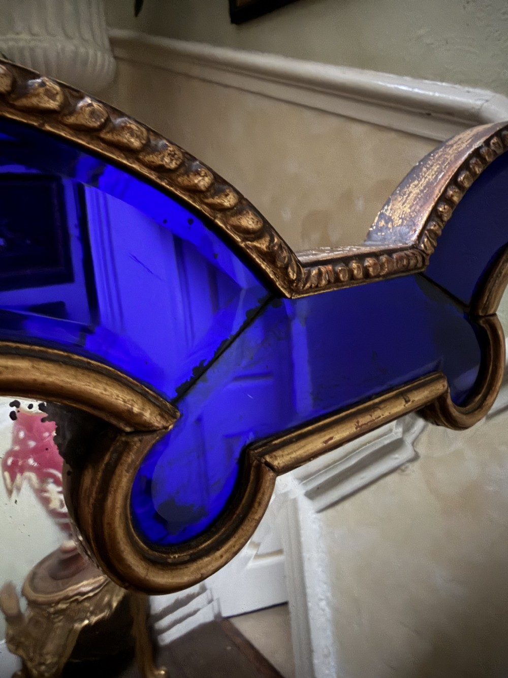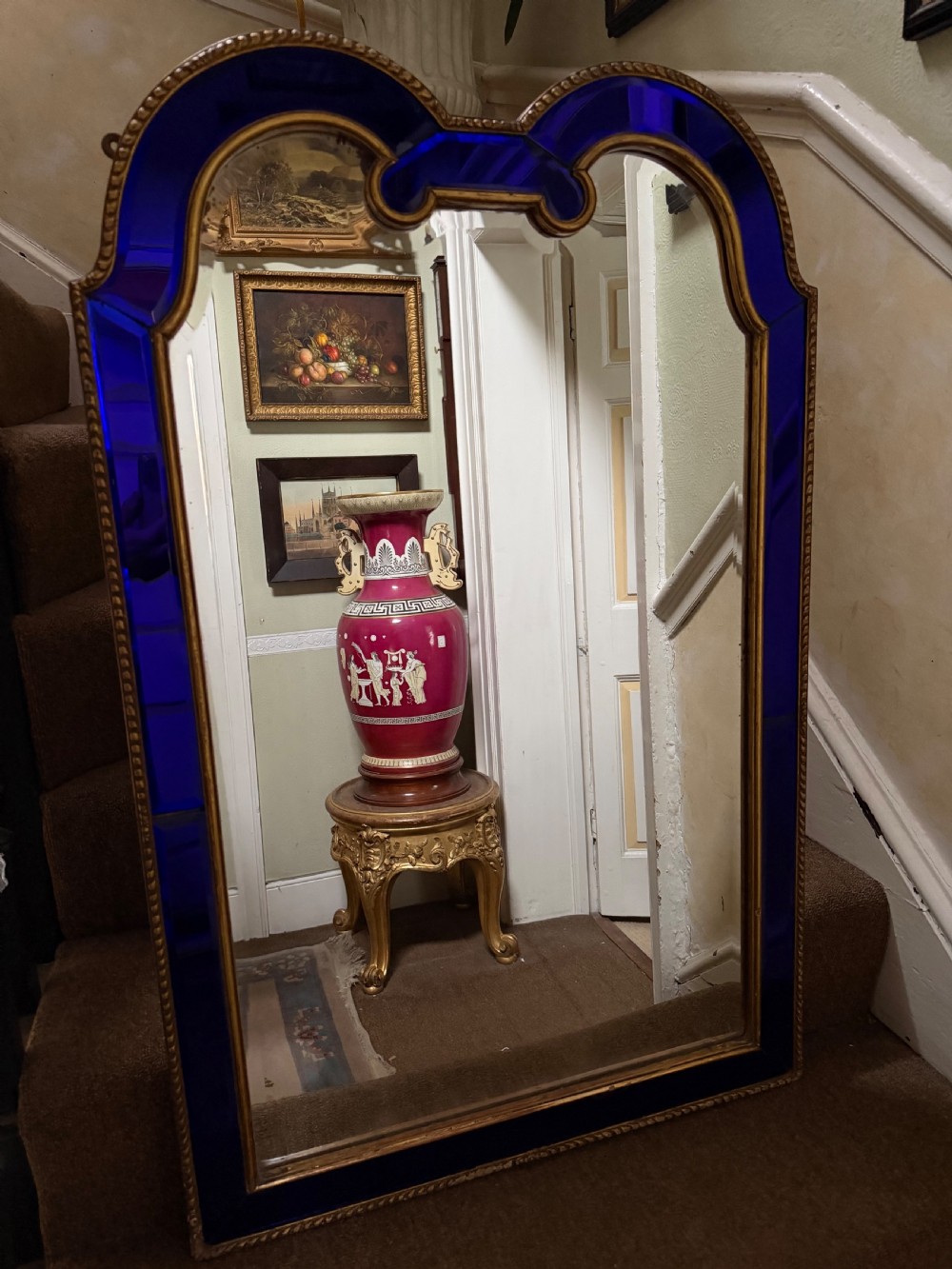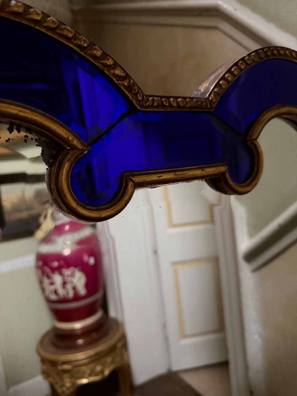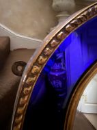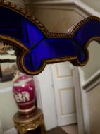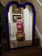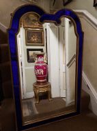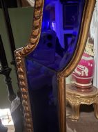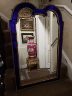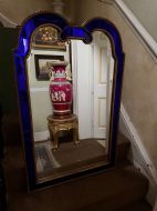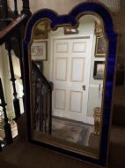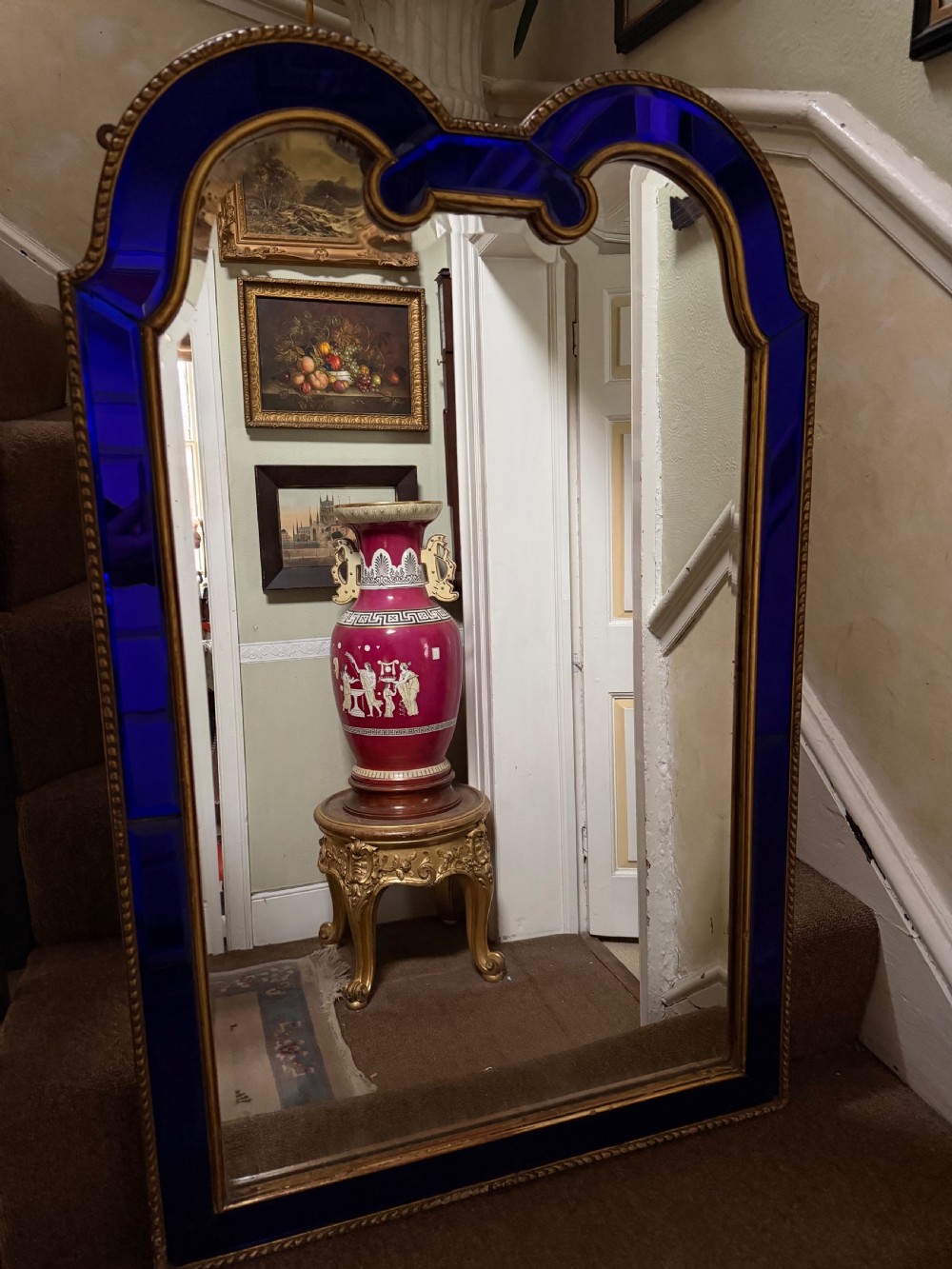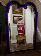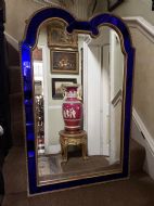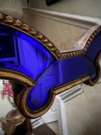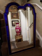 The shaped arched double dome-top mirror with a carved gilt-wood outer edge and gilt-wood inner moulding surrounding the deep colbalt blue coloured margin panels. The central silvered mirror plate having a subtle bevelled edge surround .