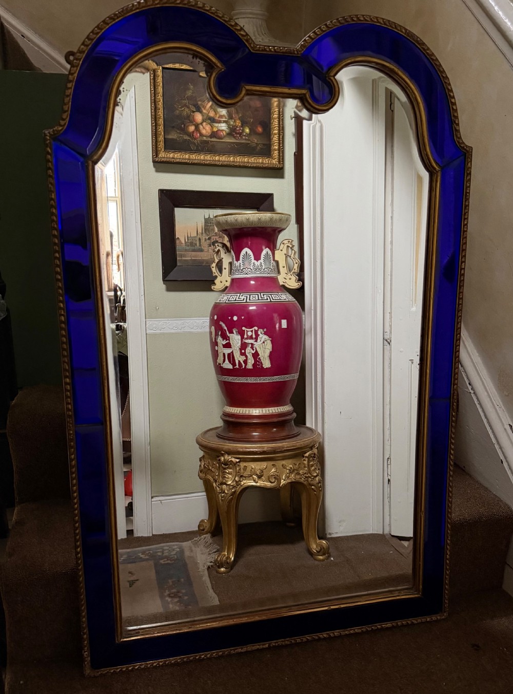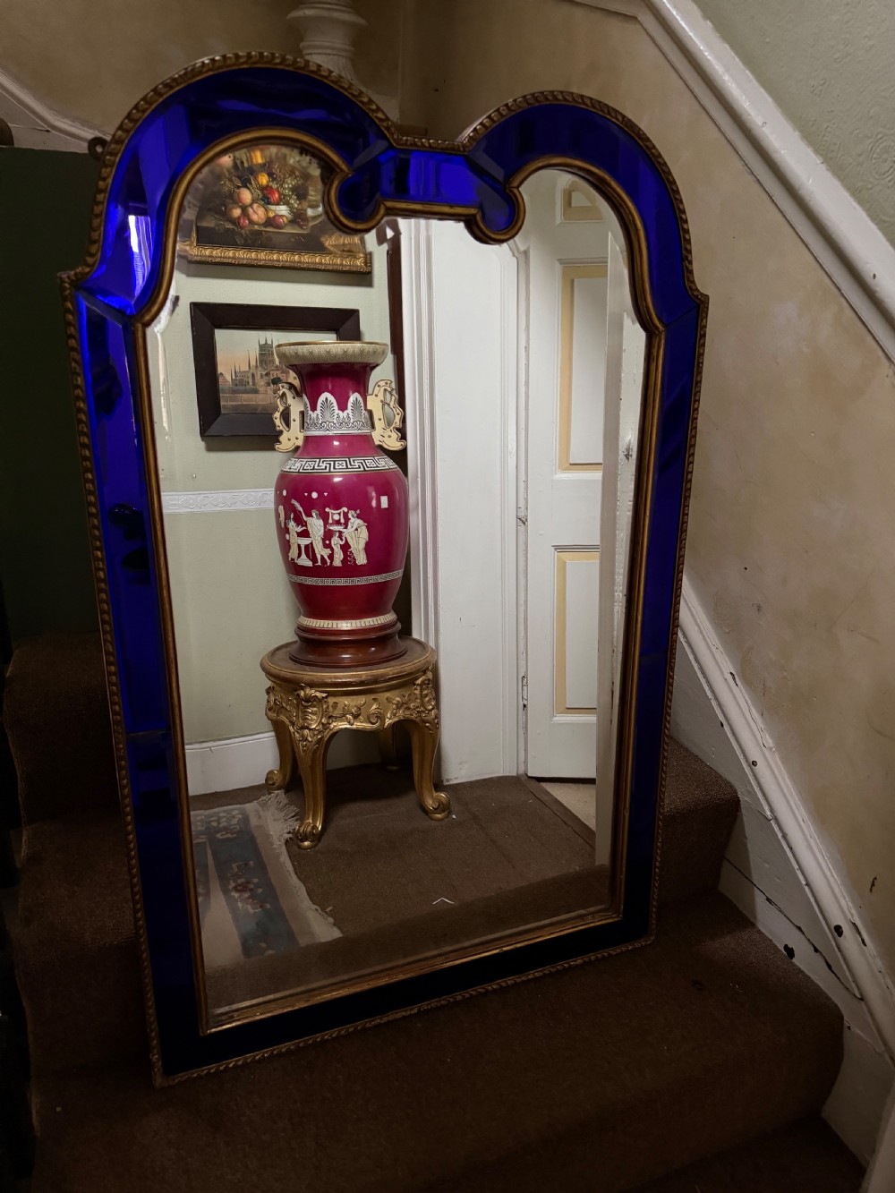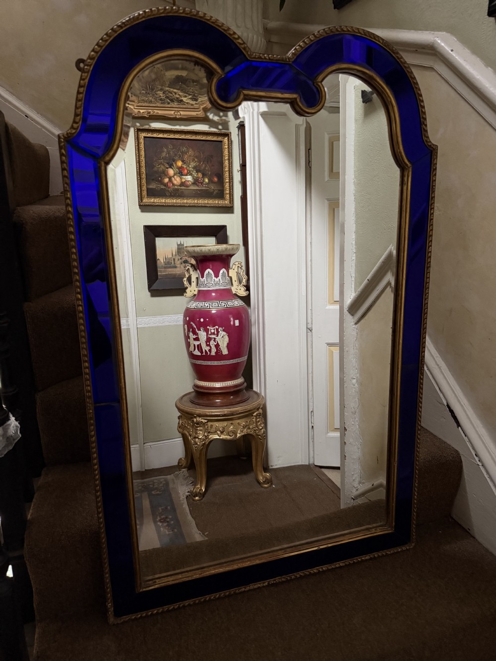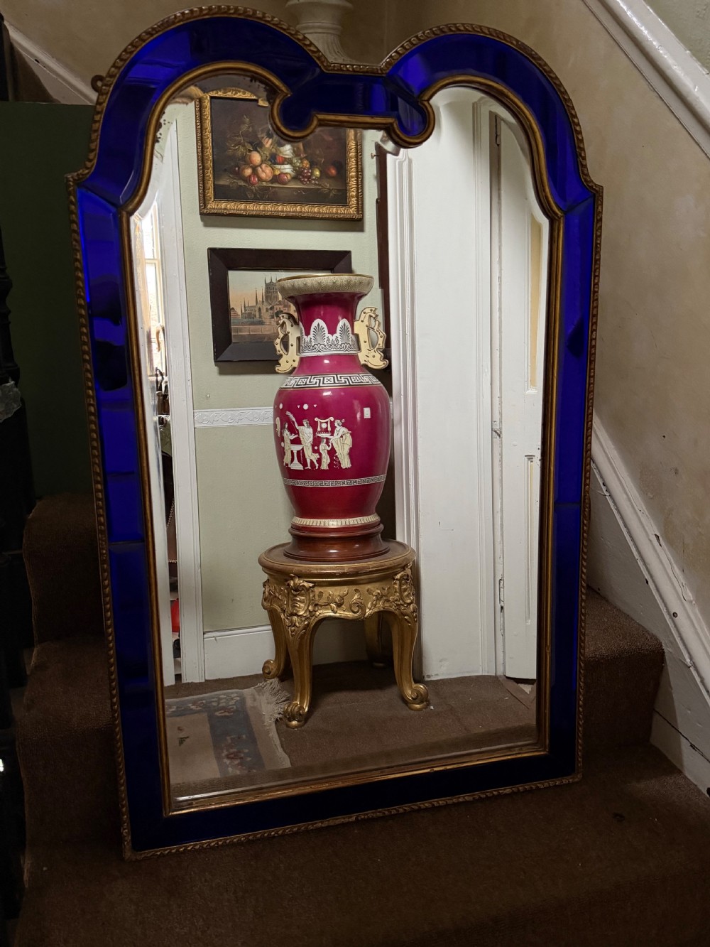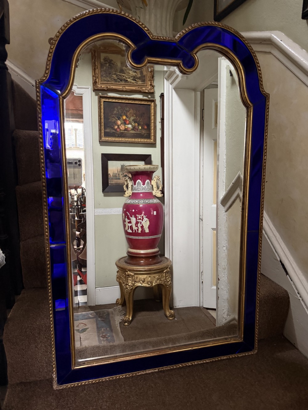 The shaped arched double dome-top mirror with a carved gilt-wood outer edge and gilt-wood inner moulding surrounding the deep colbalt blue coloured margin panels. The central silvered mirror plate having a subtle bevelled edge surround .