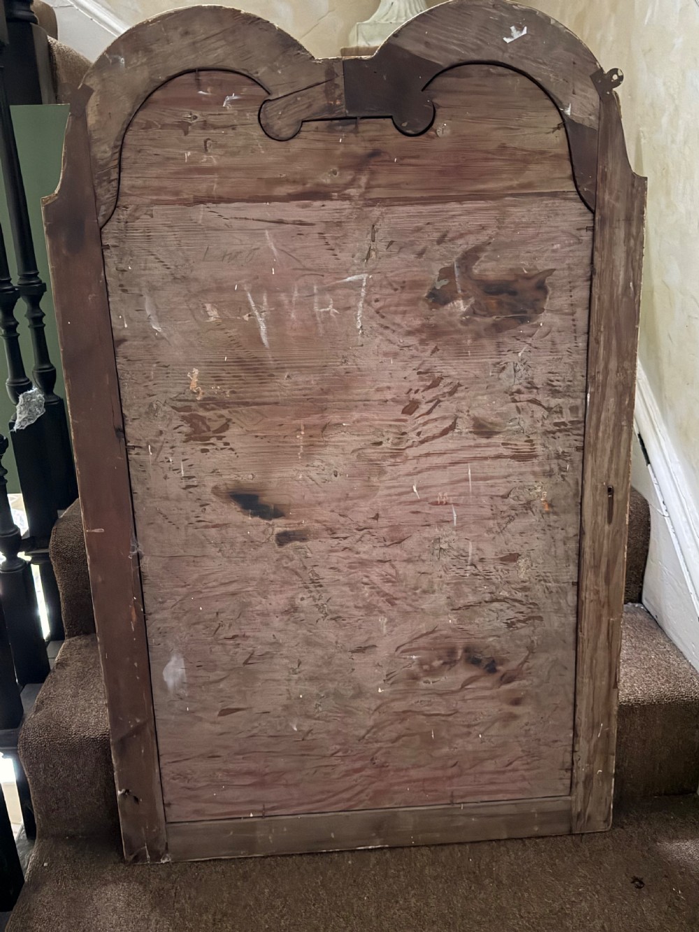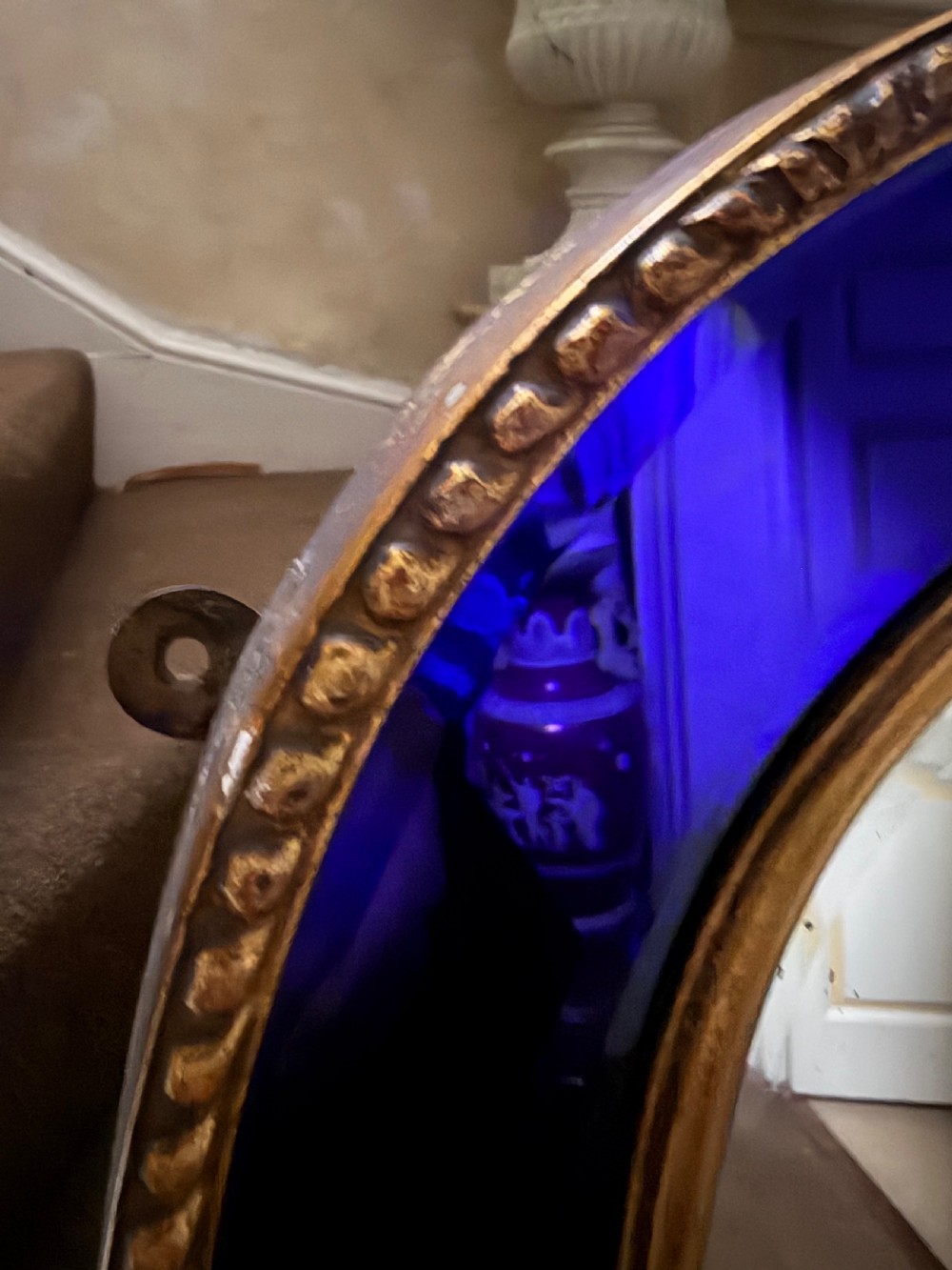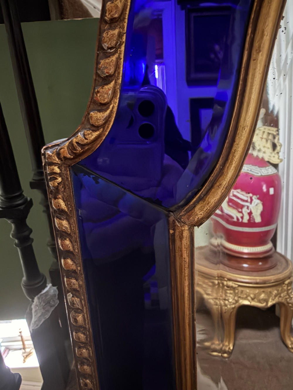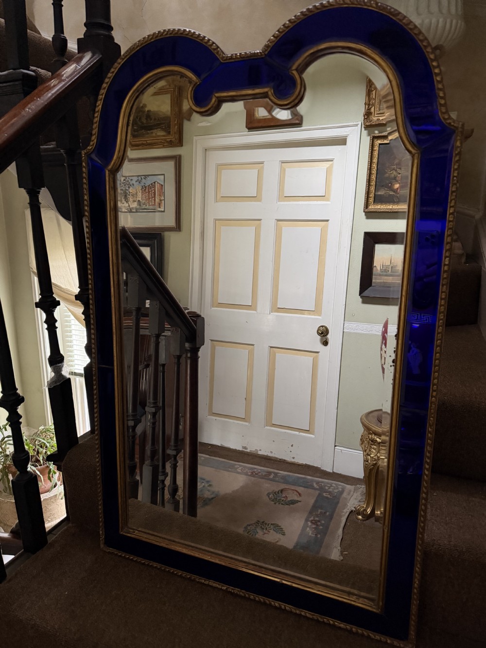 The shaped arched double dome-top mirror with a carved gilt-wood outer edge and gilt-wood inner moulding surrounding the deep colbalt blue coloured margin panels. The central silvered mirror plate having a subtle bevelled edge surround .