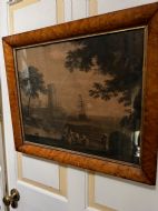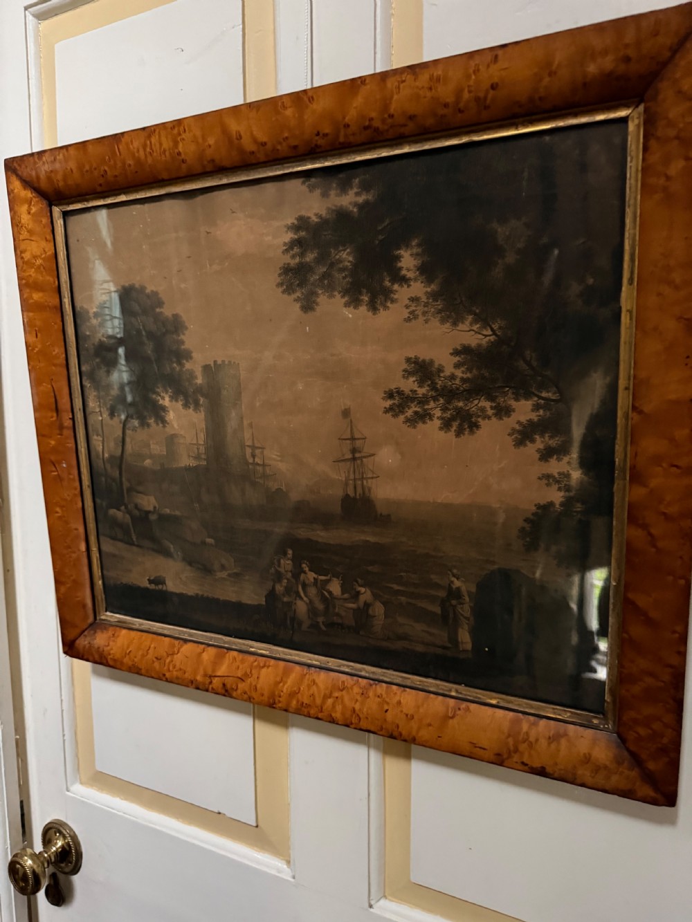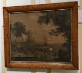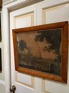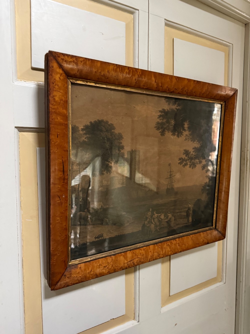 Early C19th classical engraving after Claude Lorraine “Coast view with the Abduction of Europa” in original glazed burr maple frame .