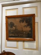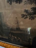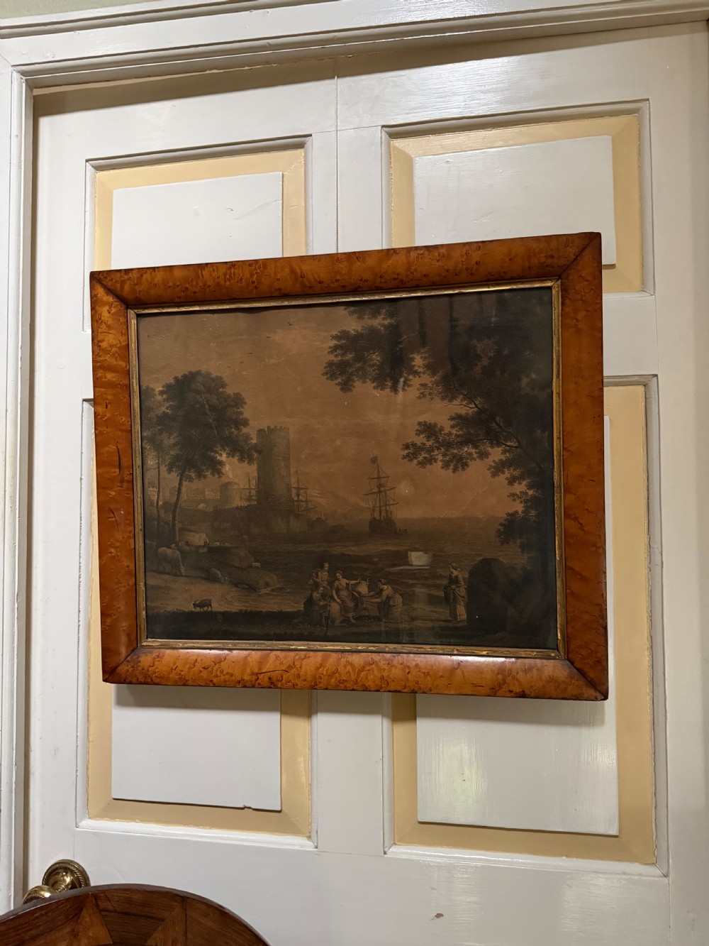 Early C19th classical engraving after Claude Lorrain “Coast view with the Abduction of Europa “ in original glazed burr maple frame .