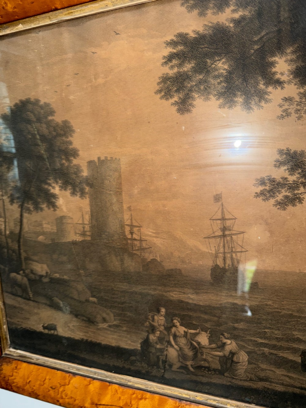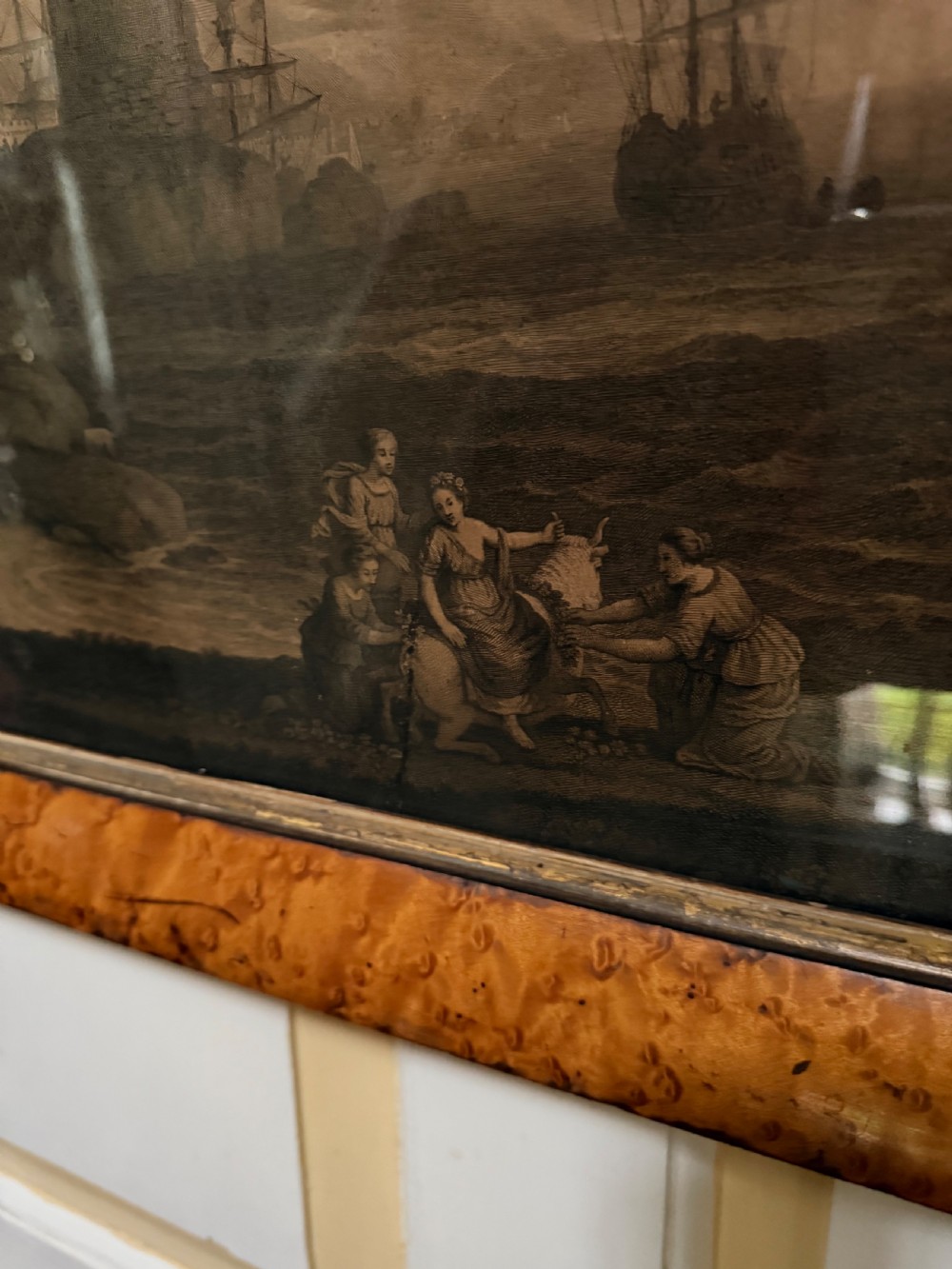 early c19th classical engraving after claude lorraine coast view with the abduction of europa in original glazed burr maple frame