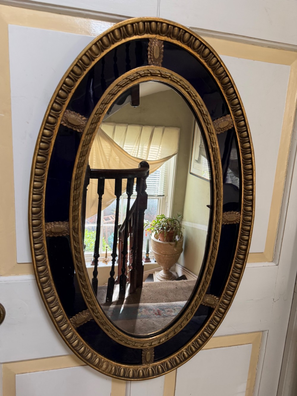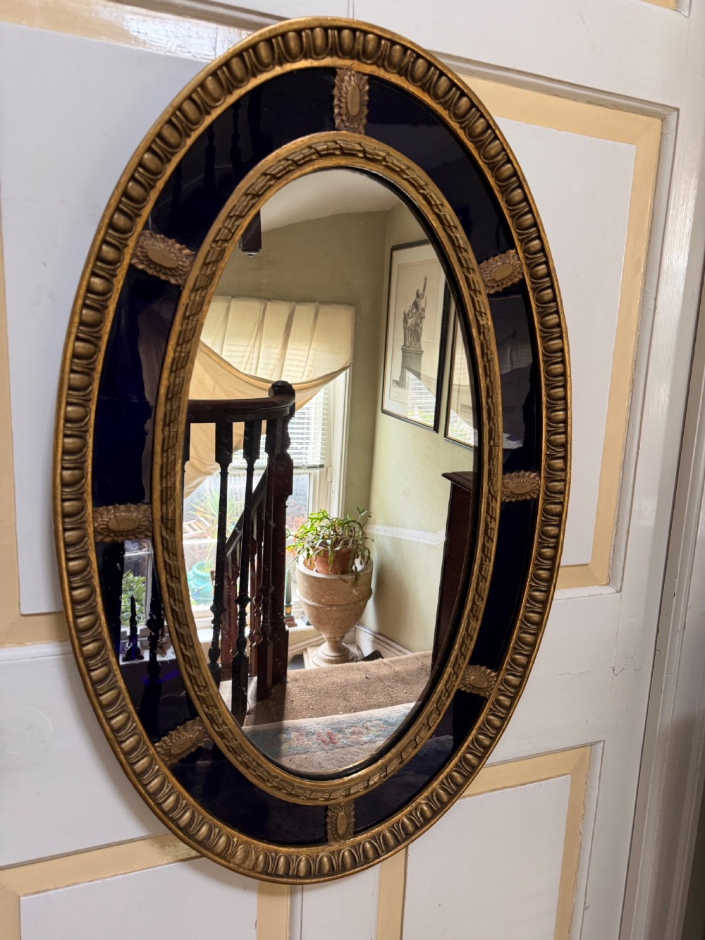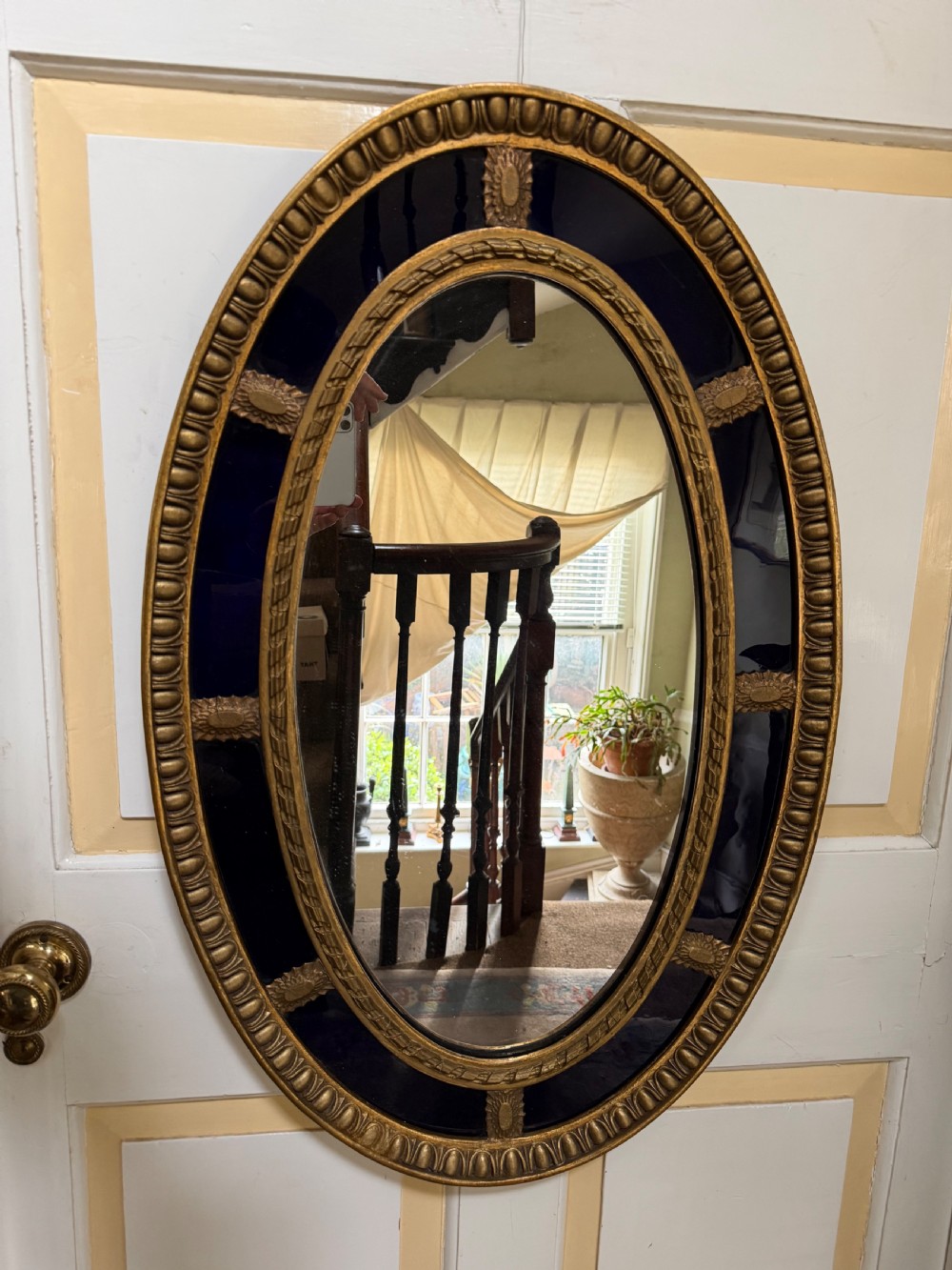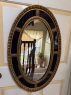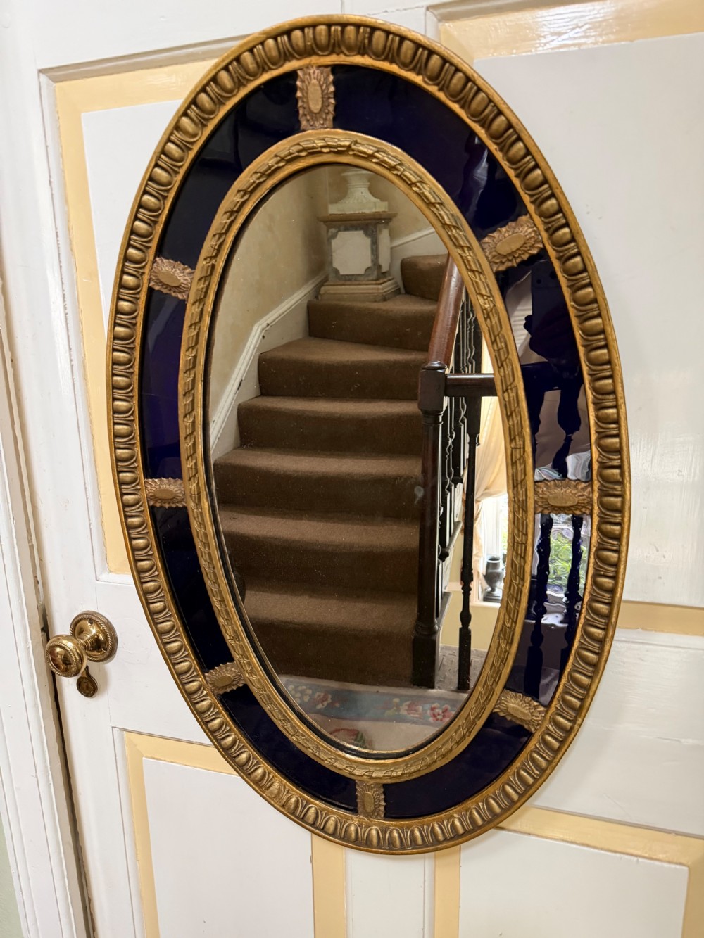 A smart gilded oval mirror with deep colbalt blue glass panels in the manner of Robert Adam . The ovolo or ‘egg and dart’ edge with ovoid paterae dividing the blue border surround , the mirror plate with a carved giltwood framed moulding.