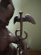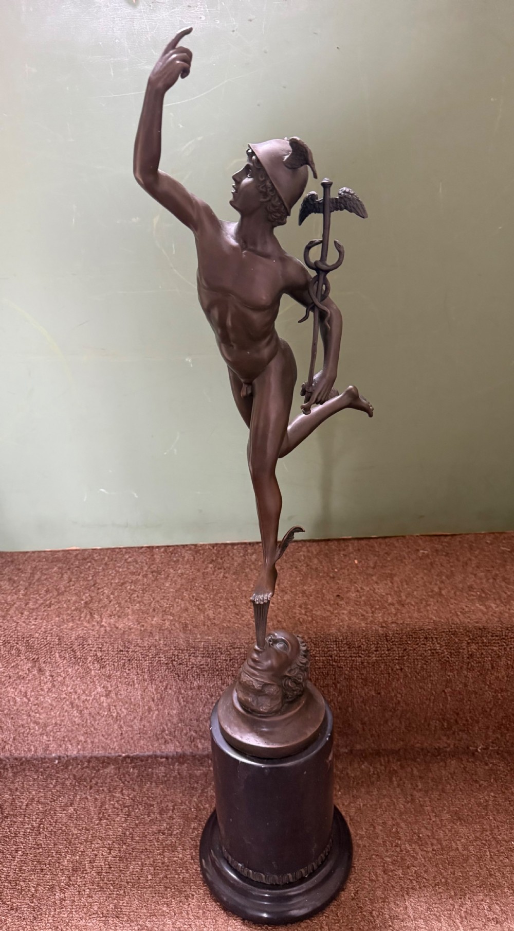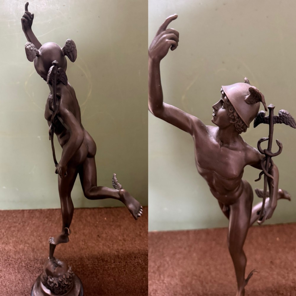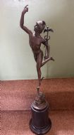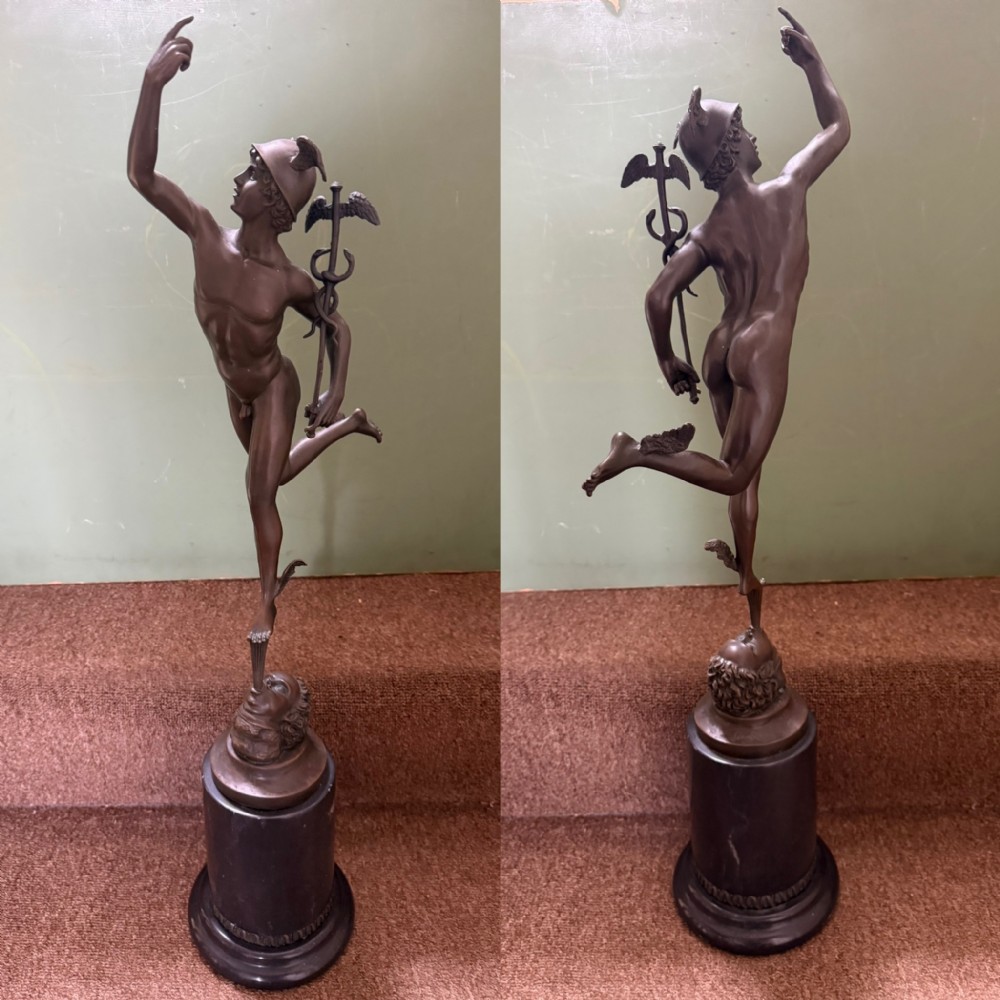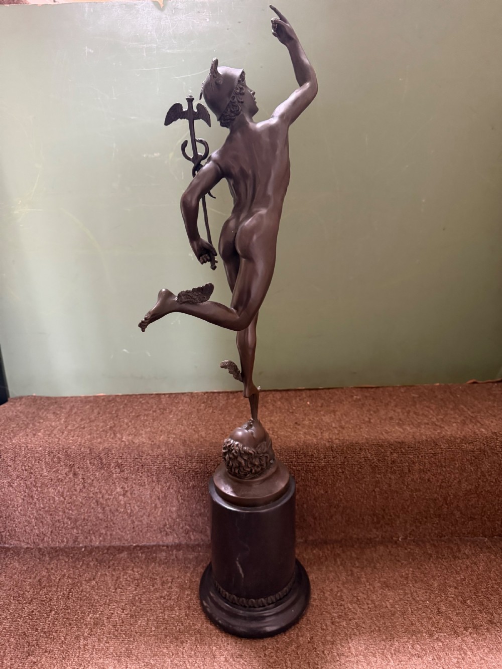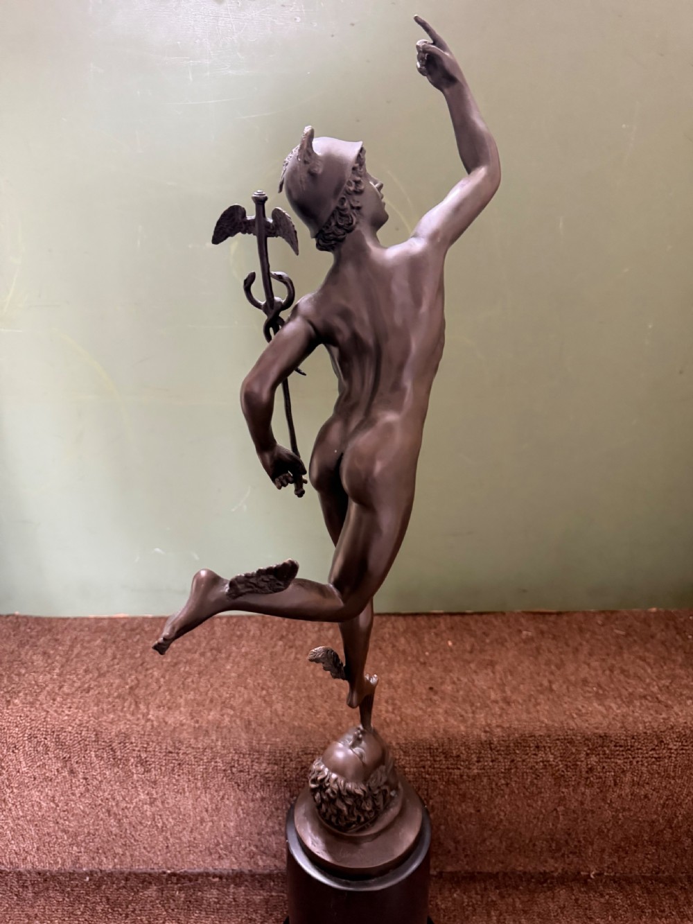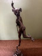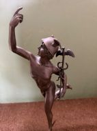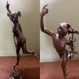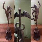 Well cast bronze of Mercury , messenger to the Gods in Roman mythology. After the original sculpted by Giambologna, the elegantly modelled flying Mercury is depicted entirely naked balanced on the winds blown from a head of a Zephyr. The animated Mercury has wings to both his ankles and helmet, his left arm holding a winged cadeusus or staff , his right arm held aloft with his finger raised.