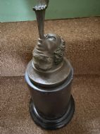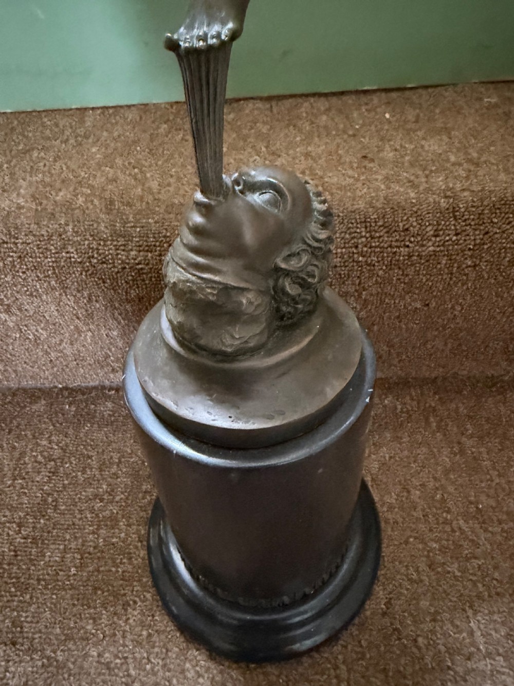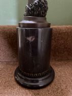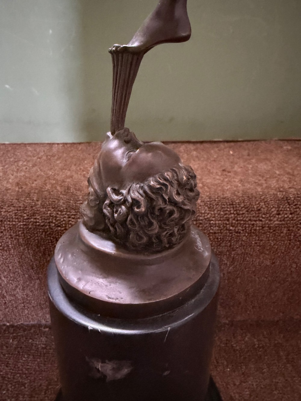 The bronze figural sculpture mounted upon a bronze-mounted cylindrical figured black marble plinth base .