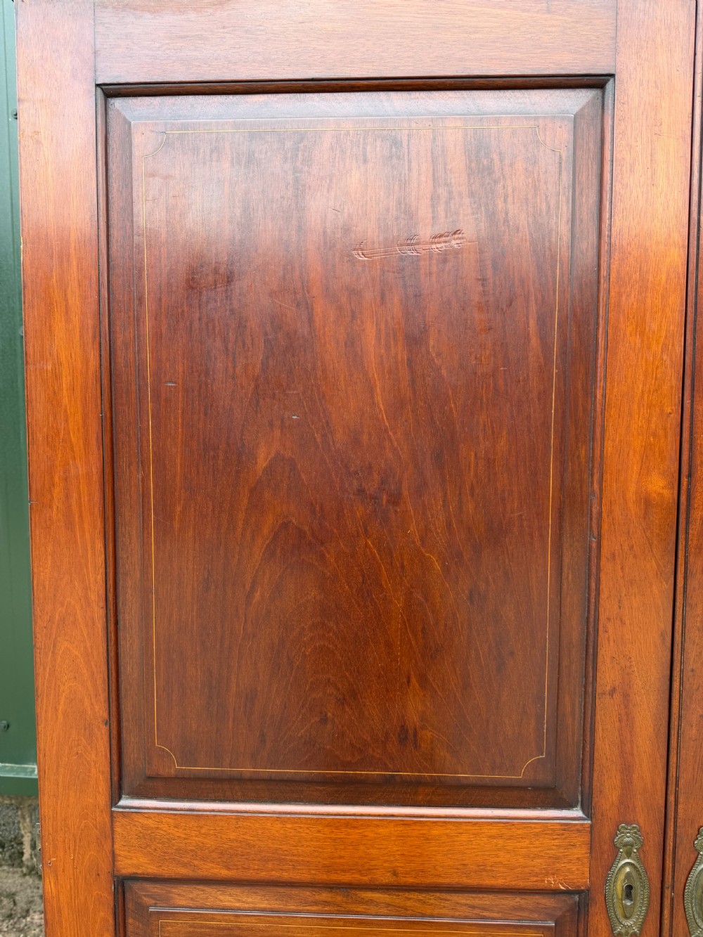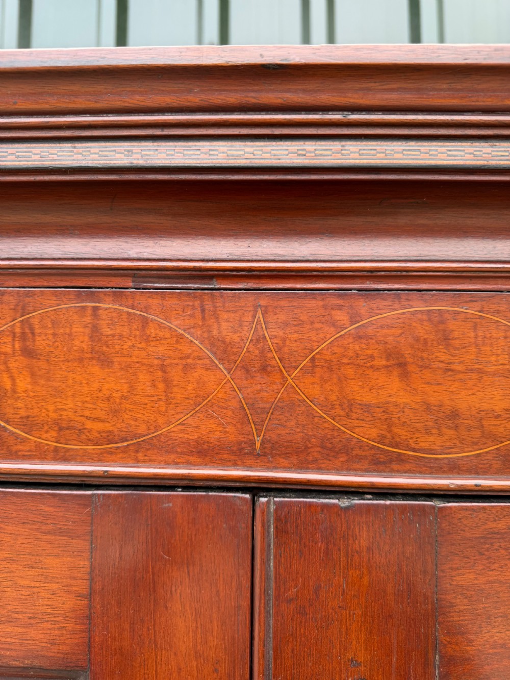Fitted with 2 doors having triple fielded panels with box line inlaid decoration, the moulded cornice having a band of inlaid chequer decoration above a frieze with a line of further subtle inlaid decoration. The doors each fitted with a decorative brass escutcheon.