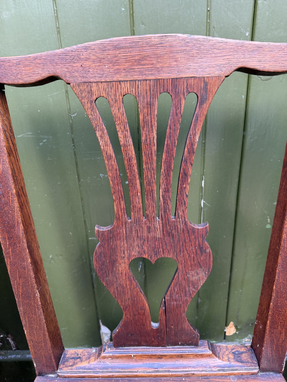 Inspired by the designs of Chippendale and Hepplewhite, the solid panel seated chairs raised on tapering square section legs united by stretchers . The backs with shaped splats with open carved detail , the lower section of heart design.