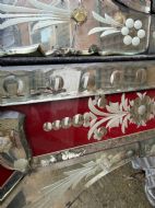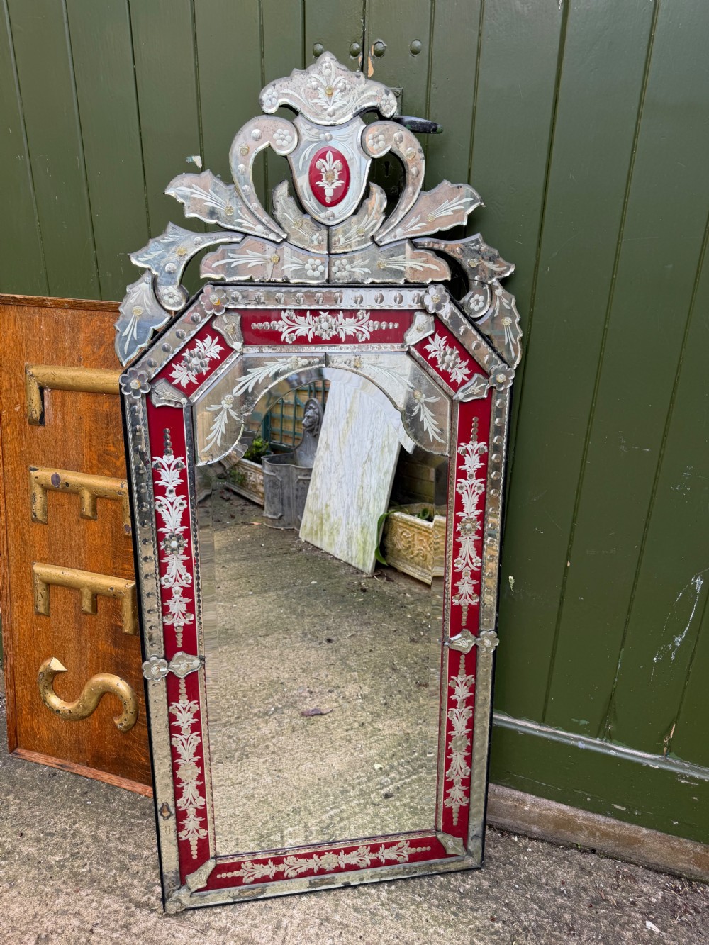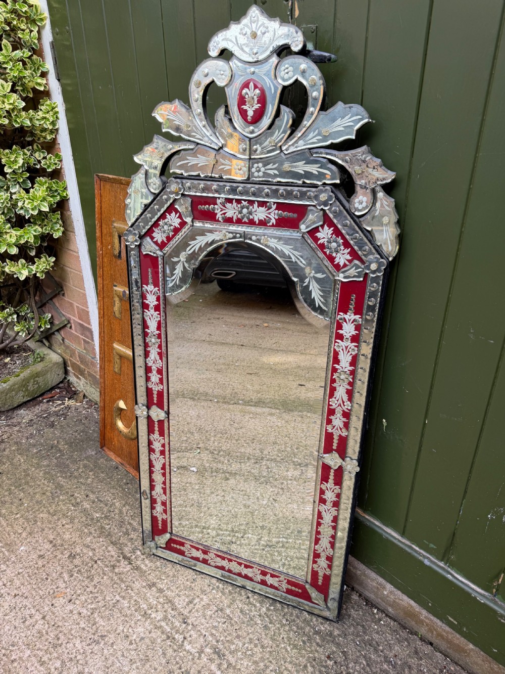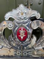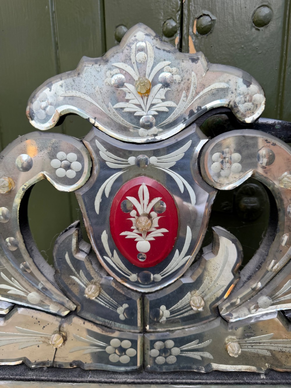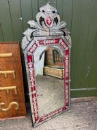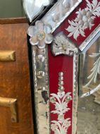 Decorative Venetian-style mirror with a central arch-top bevelled edge mirror plate , surrounded by a border of ruby red glass detailing and applied cut and etched glass elements . The top surmounted by a tall decorative crest with corresponding red motif to the centre.