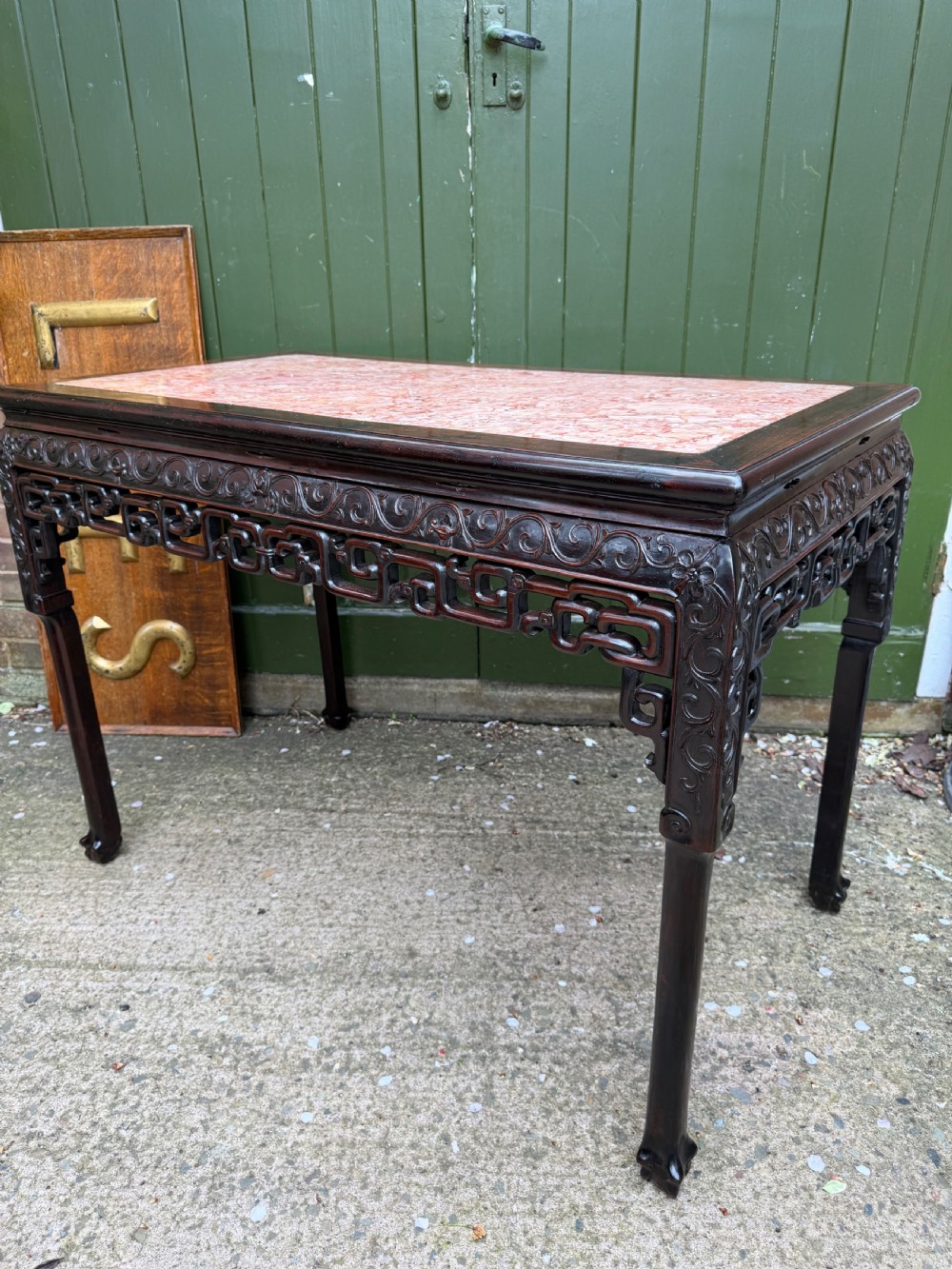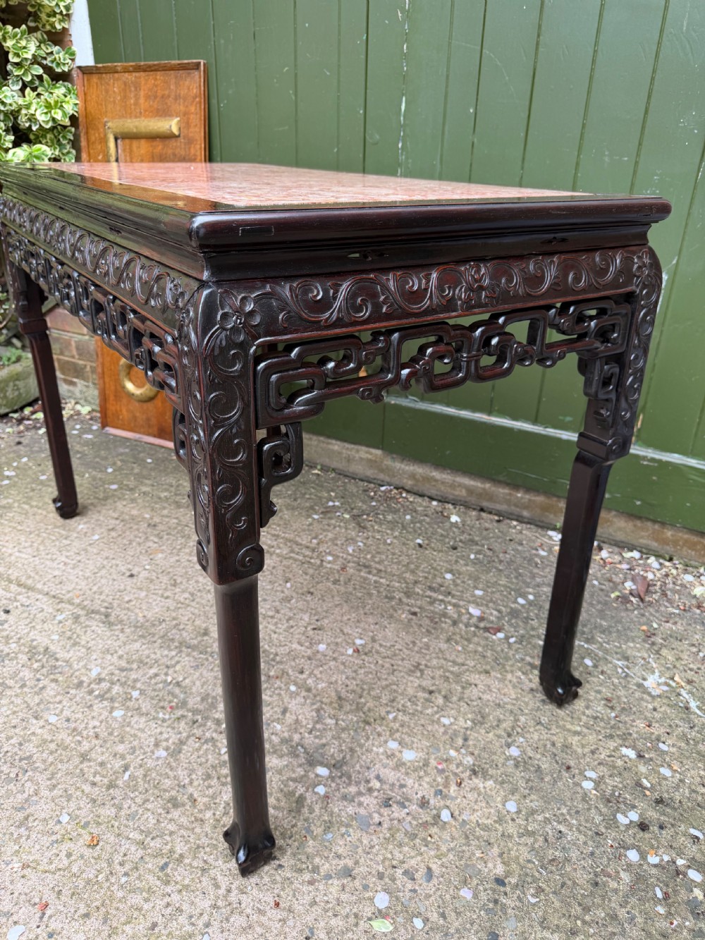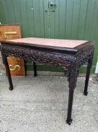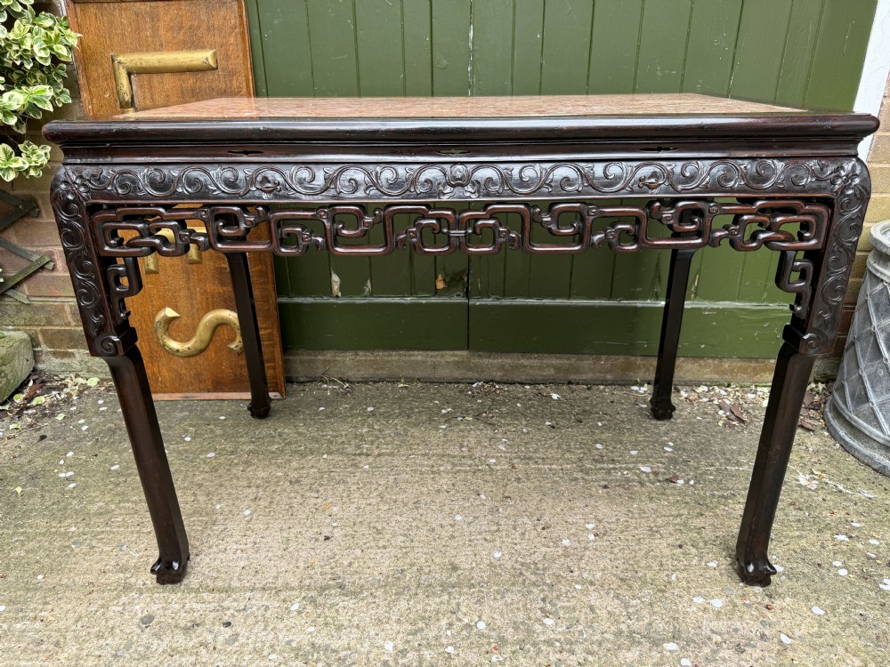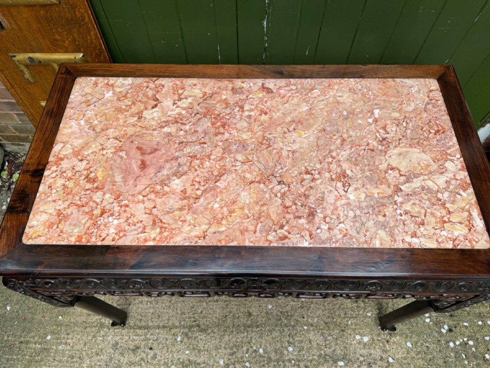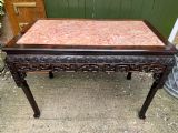 Late C19th Chinese Qing Dynasty carved hardwood rectangular centre table with inset rouge marble panel top .