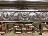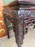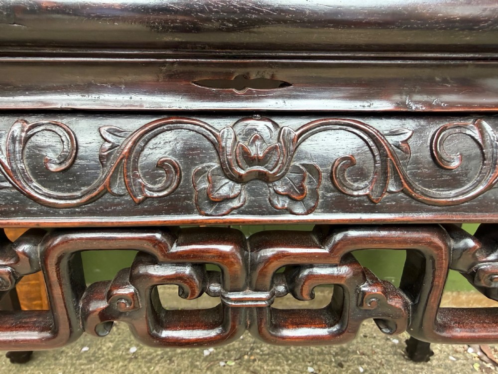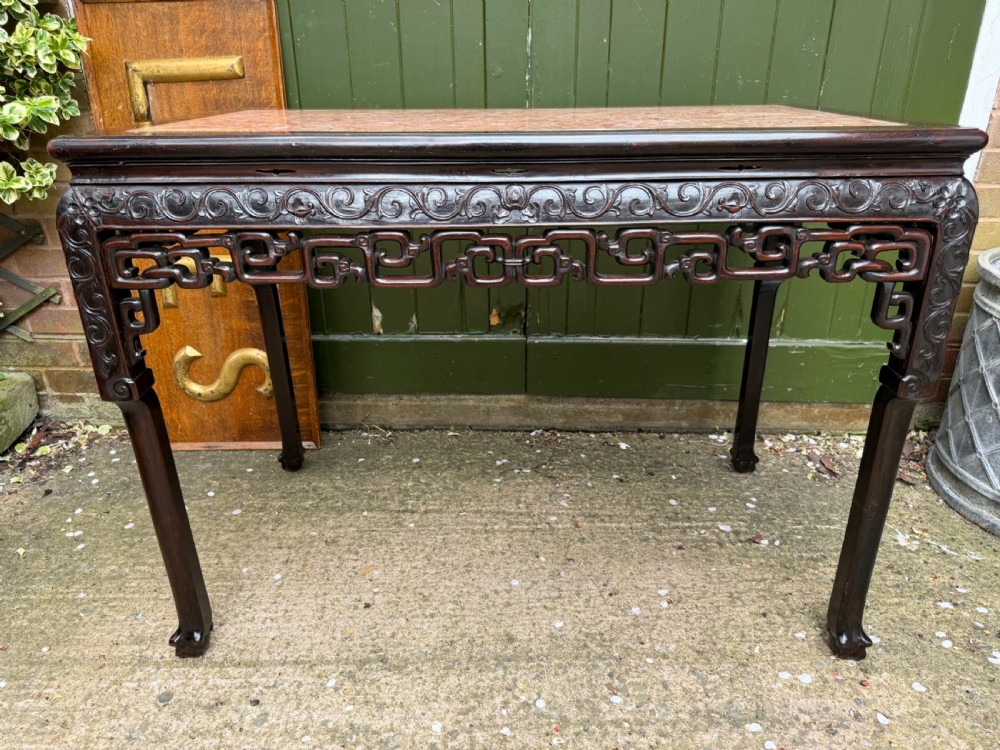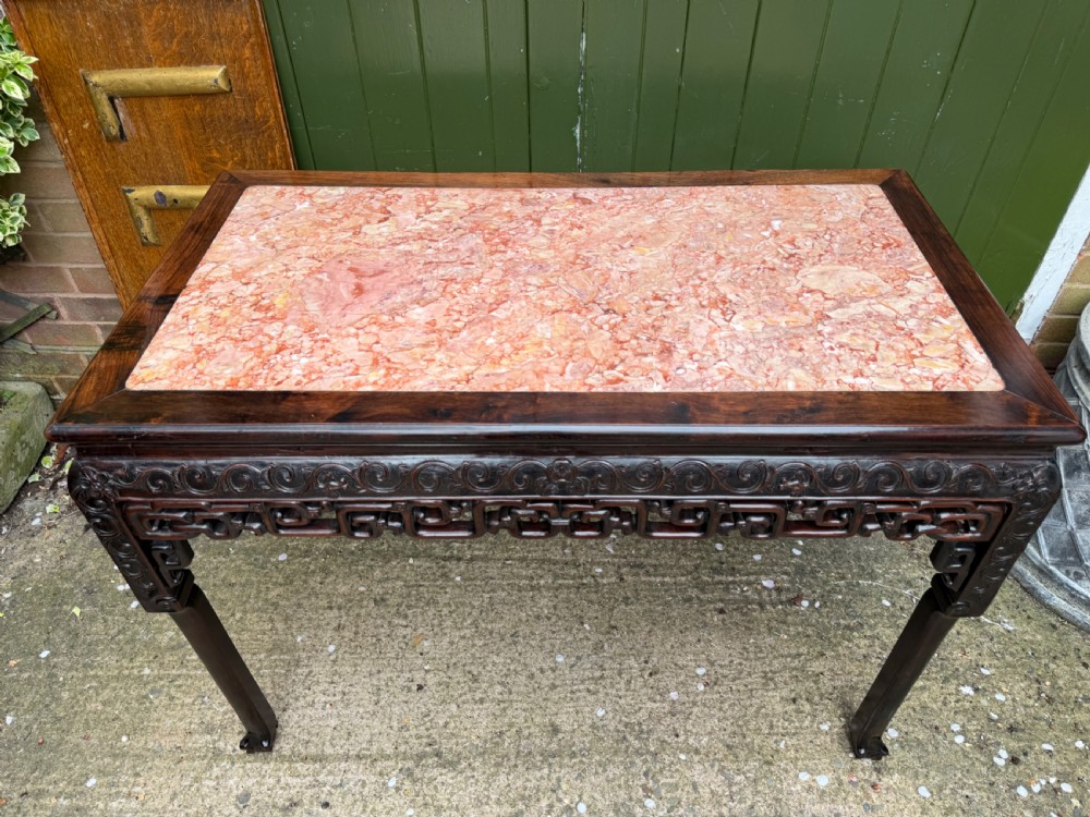 Late C19th Chinese Qing Dynasty carved hardwood rectangular centre table with inset rouge marble panel top.